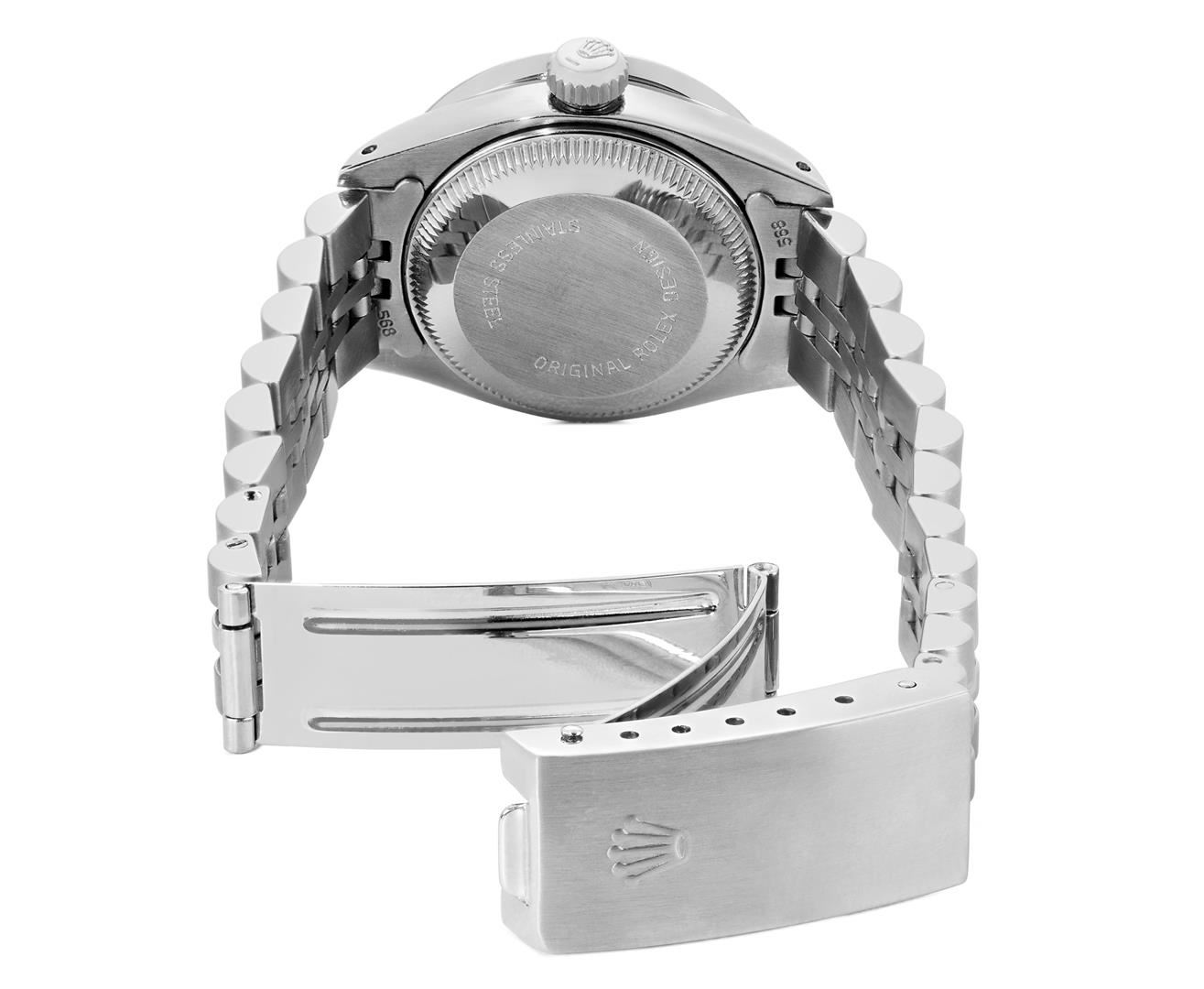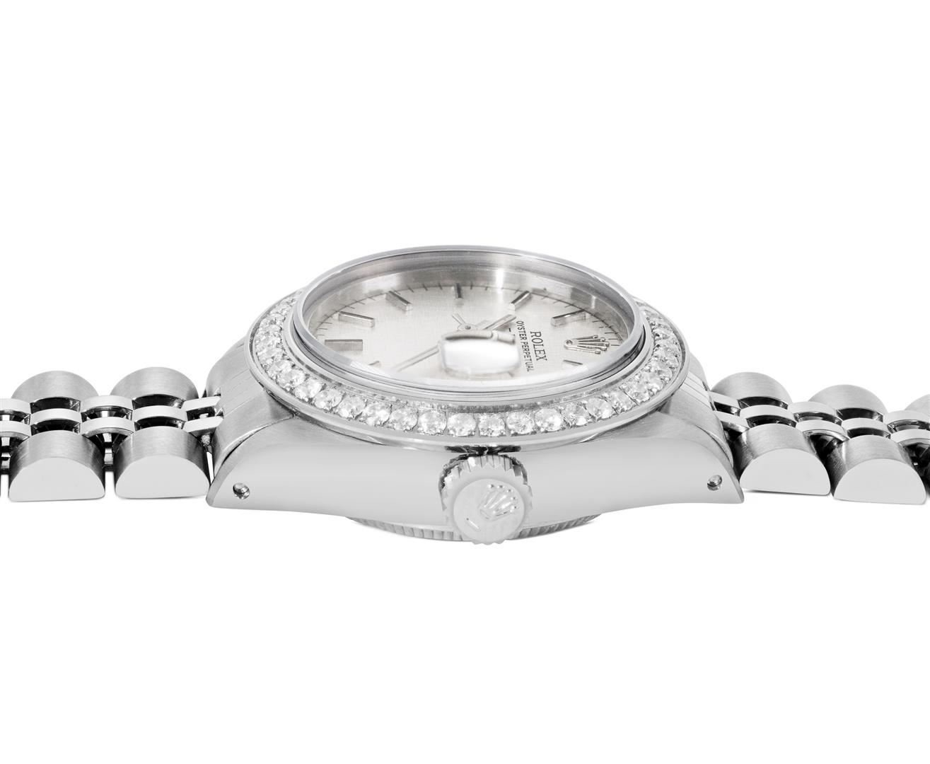 One Rolex Ladies Pre Owned Stainless Steel Date Wristwatch Polished Bright with Satin Finish, Serviced & Electronically Tested, Stainless Steel Case: 26mm, Stainless Steel Crown, Custom Bezel: New Stainless Steel Diamond Bezel, Diamond Count: 44 Diamonds,
