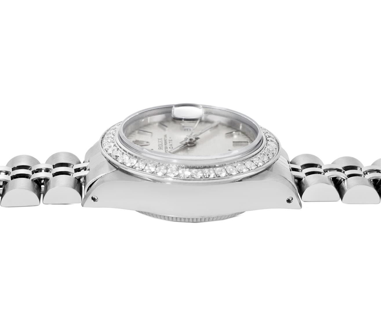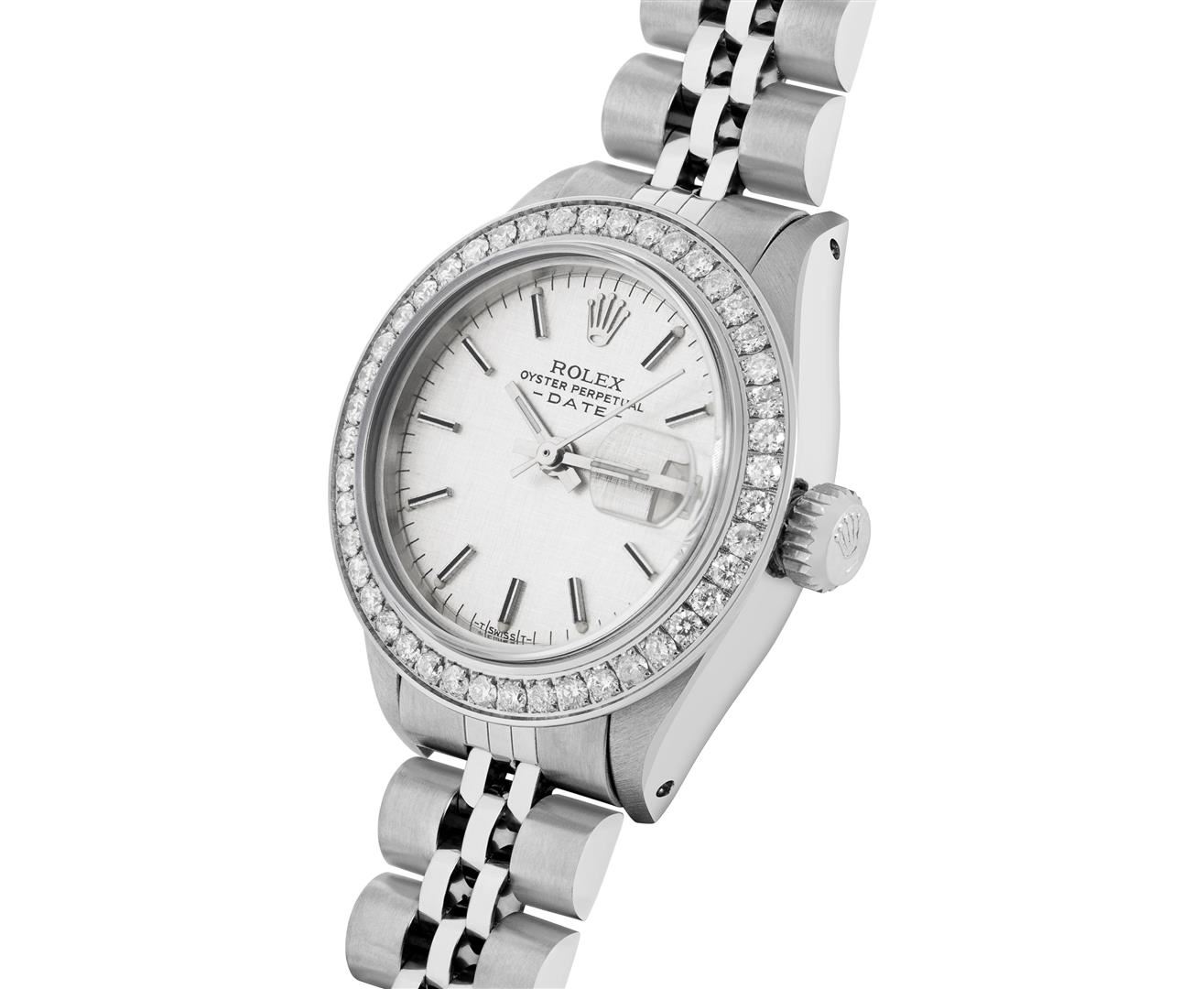 One Rolex Ladies Pre Owned Stainless Steel Date Wristwatch Polished Bright with Satin Finish, Serviced & Electronically Tested, Stainless Steel Case: 26mm, Stainless Steel Crown, Custom Bezel: New Stainless Steel Diamond Bezel, Diamond Count: 44 Diamonds,