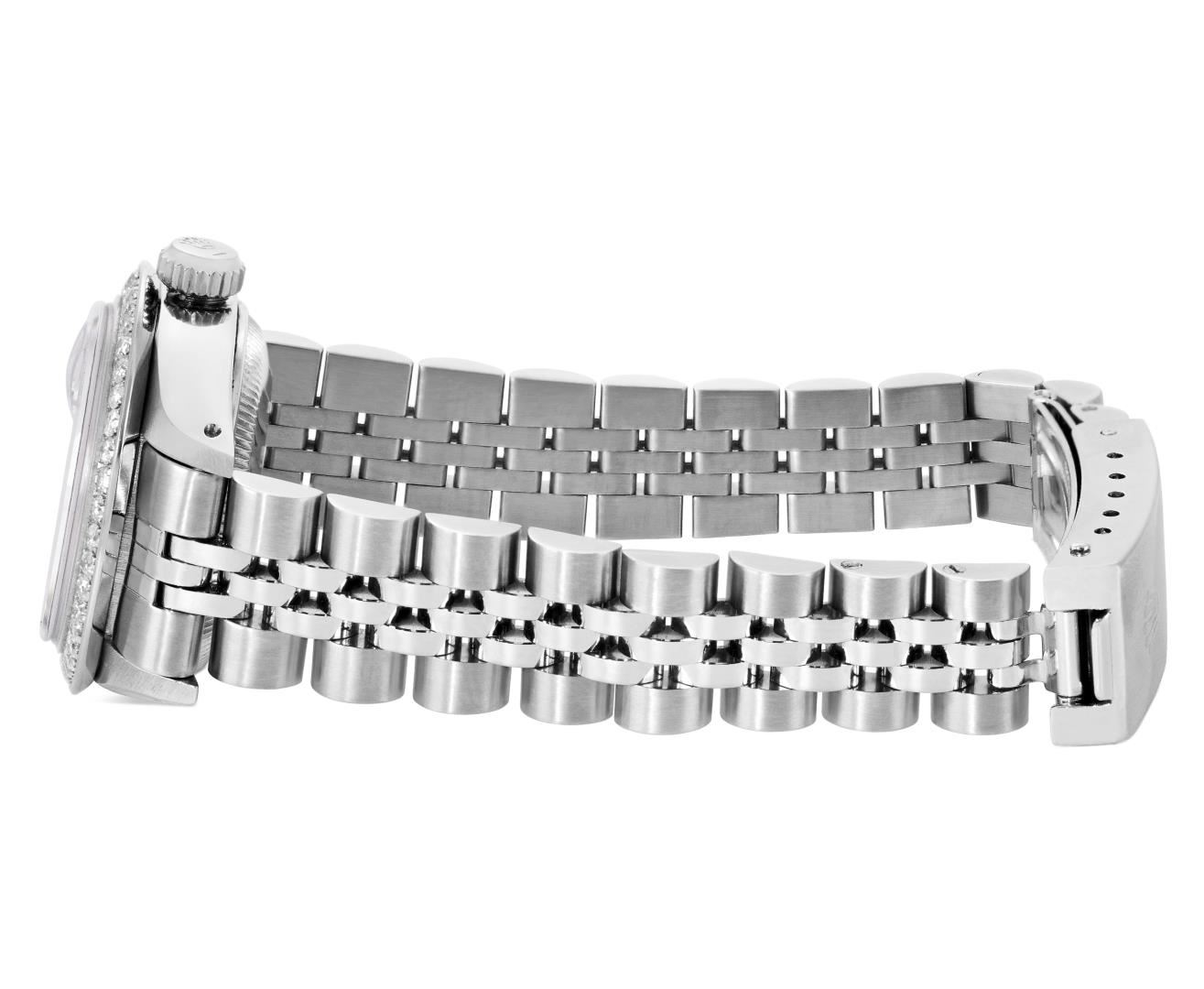 One Rolex Ladies Pre Owned Stainless Steel Date Wristwatch Polished Bright with Satin Finish, Serviced & Electronically Tested, Stainless Steel Case: 26mm, Stainless Steel Crown, Custom Bezel: New Stainless Steel Diamond Bezel, Diamond Count: 44 Diamonds, Total Weight .70 Carat, Clarity: SI-VS, Color: G to H. Custom Crystal: New Sapphire With Magnified Date Window. Custom Hands: New Luminescent Hands. Rolex Movement: Automatic Winding Movement 2030. Rolex Dial: Factory Silver Dial With Index Hour Markers And Lumi Dots. Date Window: 3 O'Clock Position Date Display, Model: Date. Condition: G-6 Extra Fine. Rolex Bracelet: Stainless Steel Jubilee Band. Bright Polish & Satin Finish. 6.0 Inch Length, Adjustable. Standard Clasp, With Rolex Logo. This Watch Has Been Serviced And Time Tested. It Is In Excellent Condition, Free Of All Scratches And Dents. This Watch Comes With A Rolex Box.
