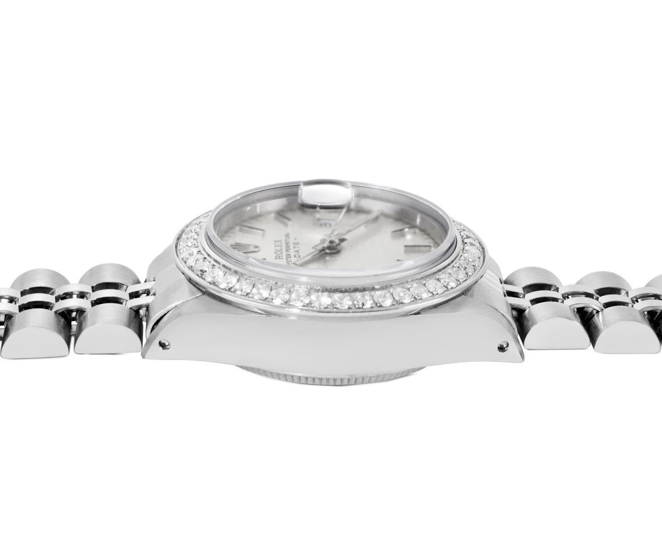 One Rolex Ladies Pre Owned Stainless Steel Date Wristwatch Polished Bright with Satin Finish, Serviced & Electronically Tested, Stainless Steel Case: 26mm, Stainless Steel Crown, Custom Bezel: New Stainless Steel Diamond Bezel, Diamond Count: 44 Diamonds, Total Weight .70 Carat, Clarity: SI-VS, Color: G to H. Custom Crystal: New Sapphire With Magnified Date Window. Custom Hands: New Luminescent Hands. Rolex Movement: Automatic Winding Movement 2030. Rolex Dial: Factory Silver Dial With Index Hour Markers And Lumi Dots. Date Window: 3 O'Clock Position Date Display, Model: Date. Condition: G-6 Extra Fine. Rolex Bracelet: Stainless Steel Jubilee Band. Bright Polish & Satin Finish. 6.0 Inch Length, Adjustable. Standard Clasp, With Rolex Logo. This Watch Has Been Serviced And Time Tested. It Is In Excellent Condition, Free Of All Scratches And Dents. This Watch Comes With A Rolex Box.