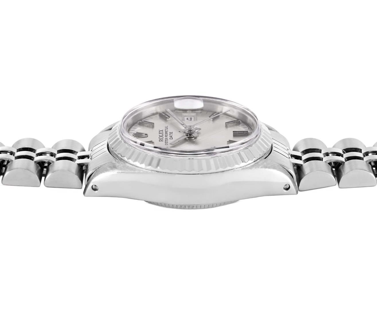 One Rolex Ladies Pre Owned Stainless Steel Date Wristwatch Polished Bright with Satin Finish, Serviced & Electronically Tested, Stainless Steel Case: 26mm, Stainless Steel Crown, 14K White Gold Fluted Bezel, Custom Crystal: New Acrylic With Magnifying Date Window. Custom Hands: New Luminescent Hands. Rolex Movement: Automatic Winding Movement 2030. Rolex Dial: Factory Silver With Index Hour Markers And Lumi Dots. Date Window: 3 O'Clock Position Date Display, Model: Date. Condition: G-6 Extra Fine. Rolex Bracelet: Stainless Steel Jubilee Band. Bright Polish & Satin Finish. 6.0 Inch Length, Adjustable. Standard Clasp, With Rolex Logo. This Watch Has Been Serviced Time Tested And Is In Excellent Condition. It Is Free Of All Scratches And Dents.