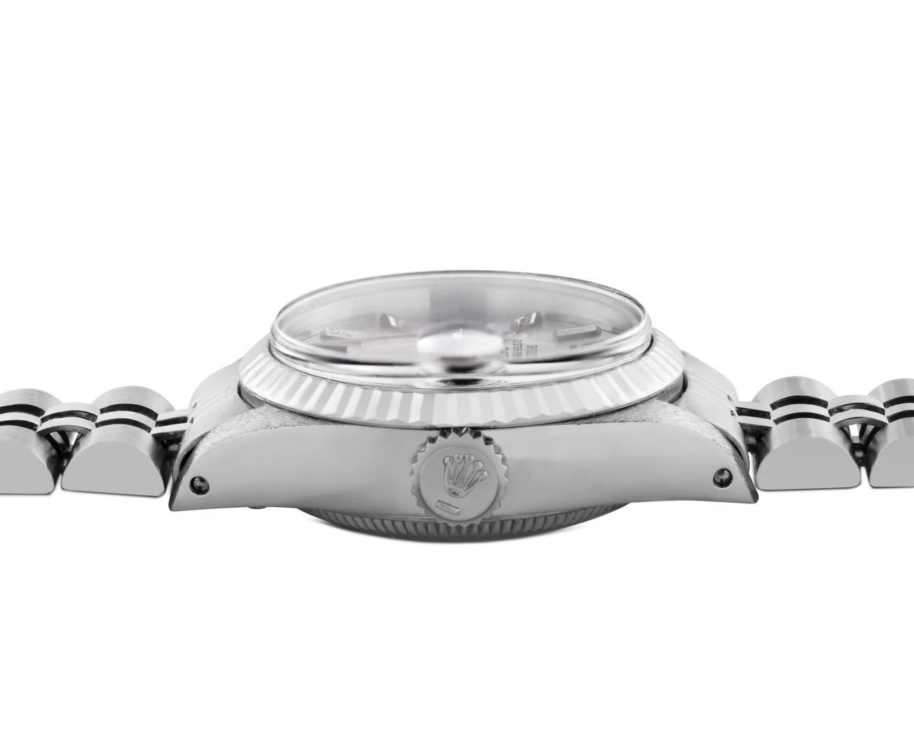 One Rolex Ladies Pre Owned Stainless Steel Date Wristwatch Polished Bright with Satin Finish, Serviced & Electronically Tested, Stainless Steel Case: 26mm, Stainless Steel Crown, 14K White Gold Fluted Bezel, Custom Crystal: New Acrylic With Magnifying Date Window. Custom Hands: New Luminescent Hands. Rolex Movement: Automatic Winding Movement 2035. Rolex Dial: Factory Silver With Index Hour Markers, Dash Tracks, And Lumi Dots. Date Window: 3 O'Clock Position Date Display, Model: Date. Condition: G-6 Extra Fine. Rolex Bracelet: Stainless Steel Jubilee Band. Bright Polish & Satin Finish. 6.0 Inch Length, Adjustable. Standard Clasp, With Rolex Logo. This Watch Has Been Serviced Time Tested And Is In Excellent Condition. It Is Free Of All Scratches And Dents.
