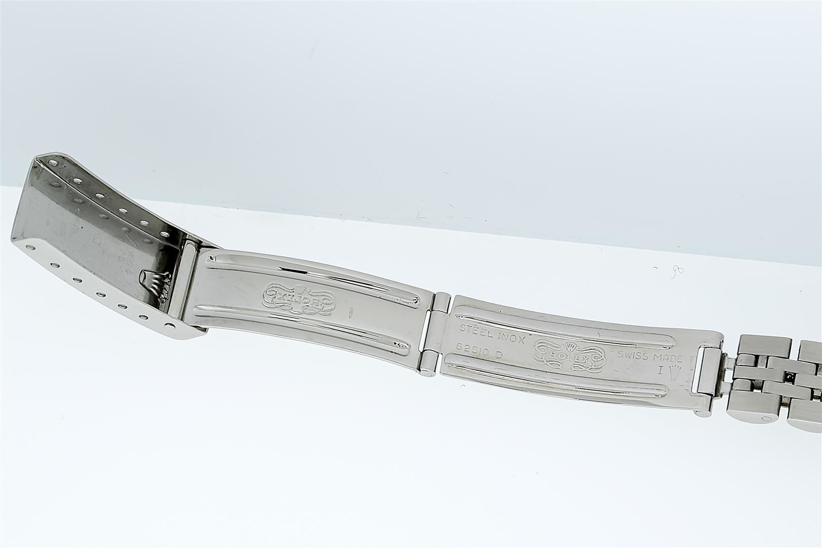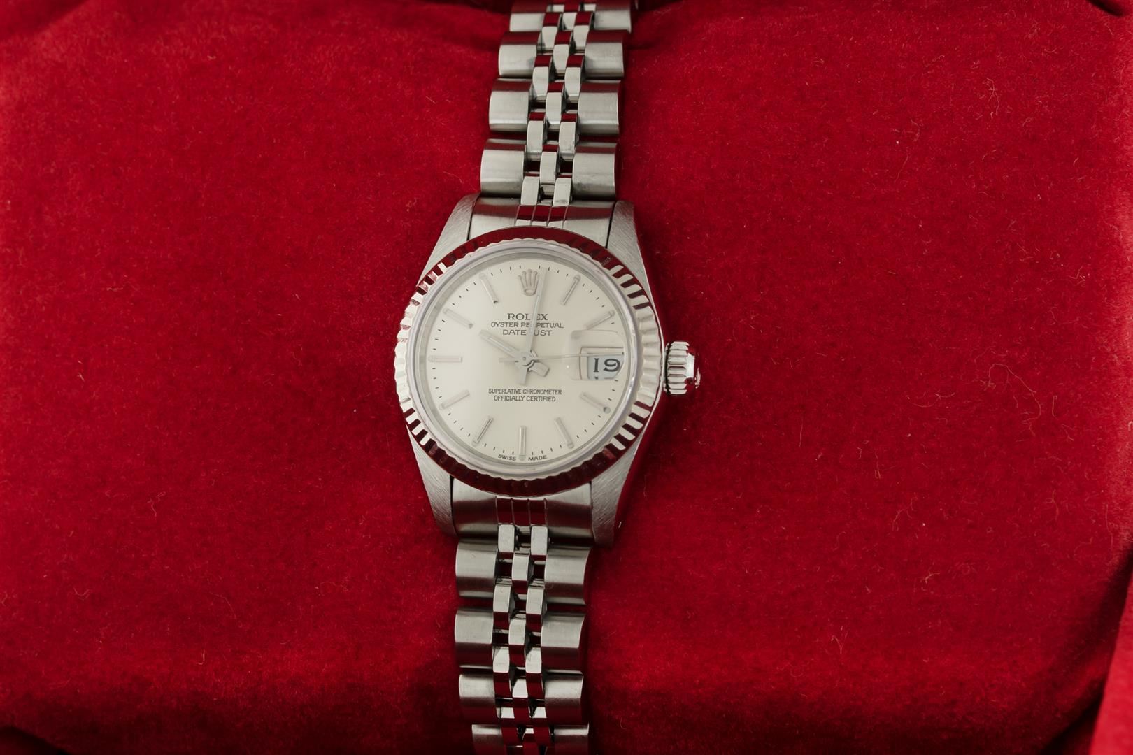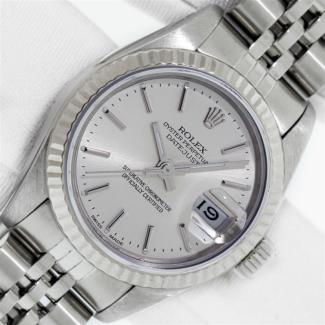 One Ladies Pre Owned Stainless Steel Rolex Datejust Polished Bright with Satin Finish, Serviced & Electronically Tested, Rolex Stainless Steel Case: 26mm, Rolex Stainless Steel Crown, Rolex Bezel: White Gold Fluted Bezel, Custom Crystal: New With Magnifying Date Window. Rolex Hands: Luminescent Hands. Rolex Movement: Automatic Winding Movement. Rolex Dial: Silver Dial With Index Hour Markers And Lumi Dots. Date Window: 3 O'Clock Position Date Display, Model: Datejust. Condition: G-6 Extra Fine. Rolex Bracelet: Stainless Steel Jubilee Band. Bright Polish & Satin Finish. 6.0 Inch Length, Adjustable. Standard Clasp, With Rolex Logo. This Watch Has Been Serviced Time Tested And Is In Excellent Condition It Is Free Of All Scratches And Dents.