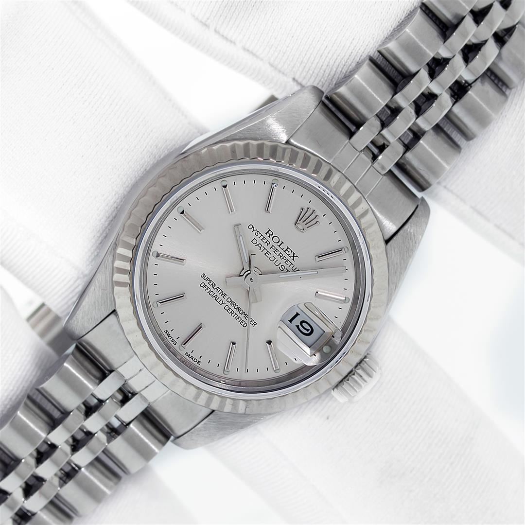 One Ladies Pre Owned Stainless Steel Rolex Datejust Polished Bright with Satin Finish, Serviced & Electronically Tested, Rolex Stainless Steel Case: 26mm, Rolex Stainless Steel Crown, Rolex Bezel: White Gold Fluted Bezel, Custom Crystal: New With Magnifying Date Window. Rolex Hands: Luminescent Hands. Rolex Movement: Automatic Winding Movement. Rolex Dial: Silver Dial With Index Hour Markers And Lumi Dots. Date Window: 3 O'Clock Position Date Display, Model: Datejust. Condition: G-6 Extra Fine. Rolex Bracelet: Stainless Steel Jubilee Band. Bright Polish & Satin Finish. 6.0 Inch Length, Adjustable. Standard Clasp, With Rolex Logo. This Watch Has Been Serviced Time Tested And Is In Excellent Condition It Is Free Of All Scratches And Dents.