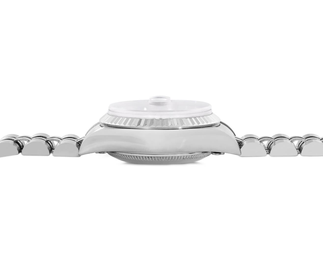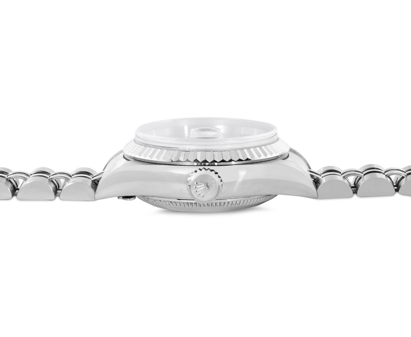 One Rolex Ladies Pre Owned Quickset Stainless Steel Datejust Wristwatch Polished Bright with Satin Finish, Serviced And Electronically Tested, Stainless Steel Case: 26mm, Stainless Steel Crown, Rolex Bezel: 18K White Gold Fluted Bezel. Crystal: Sapphire With Magnified Date Window. Hands: Solid Hands. Rolex Movement: 2235 Automatic Winding Movement. Rolex Dial: Factory Silver With Roman Hour Markers, and Square Track. Date Window: 3 O'Clock Position Date Display, Model: Quickset Datejust. Condition: G-6 Extra Fine. Rolex Bracelet: Stainless Steel Jubilee Band. Bright Polish And Satin Finish. 6.0 Inch Length, Adjustable. Standard Clasp, With Rolex Logo. This Watch Has Been Serviced Time Tested And Is In Excellent Condition. It Is Free Of All Scratches And Dents.