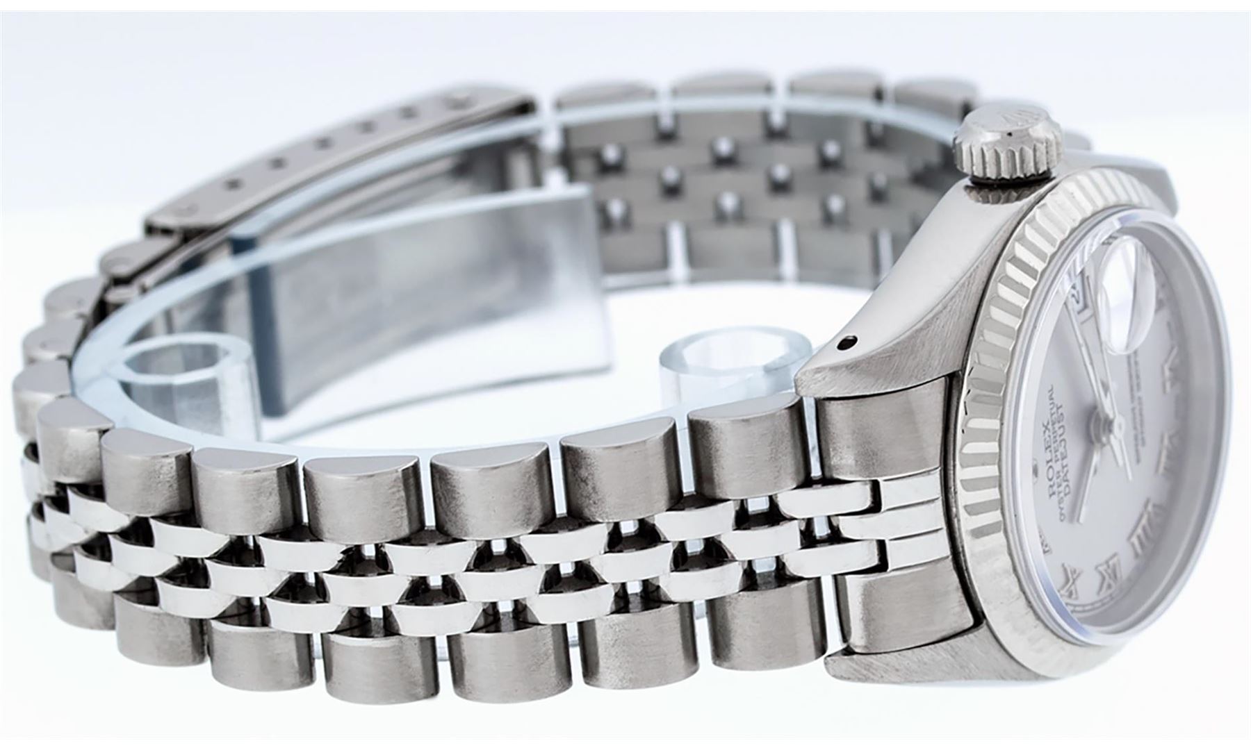 One Ladies Stainless Steel Rolex Datejust Polished Bright with Satin Finish, Serviced & Electronically Tested, Stainless Steel Case: 26mm, Stainless Steel Crown, Bezel: 14K White Gold Bezel. Custom Crystal: New New Acrylic Cyclops Lens. Custom Hands: New Luminescent Hands. Movement: Automatic Winding Movement. Custom Dial: Refinished Silver Roman Dial. Date Window: 3 O'Clock Position Date Display, Model: Datejust. Condition: G-6 Extra Fine. Bracelet: Stainless Steel Jubilee Band. Bright Polish & Satin Finish. 6.0 Inch Length, Adjustable. Standard Clasp, With Rolex Logo. This Watch Has Been Serviced Time Tested And Is In Excellent Condition It Is Free Of All Scratches And Dents. Includes Rolex Box.