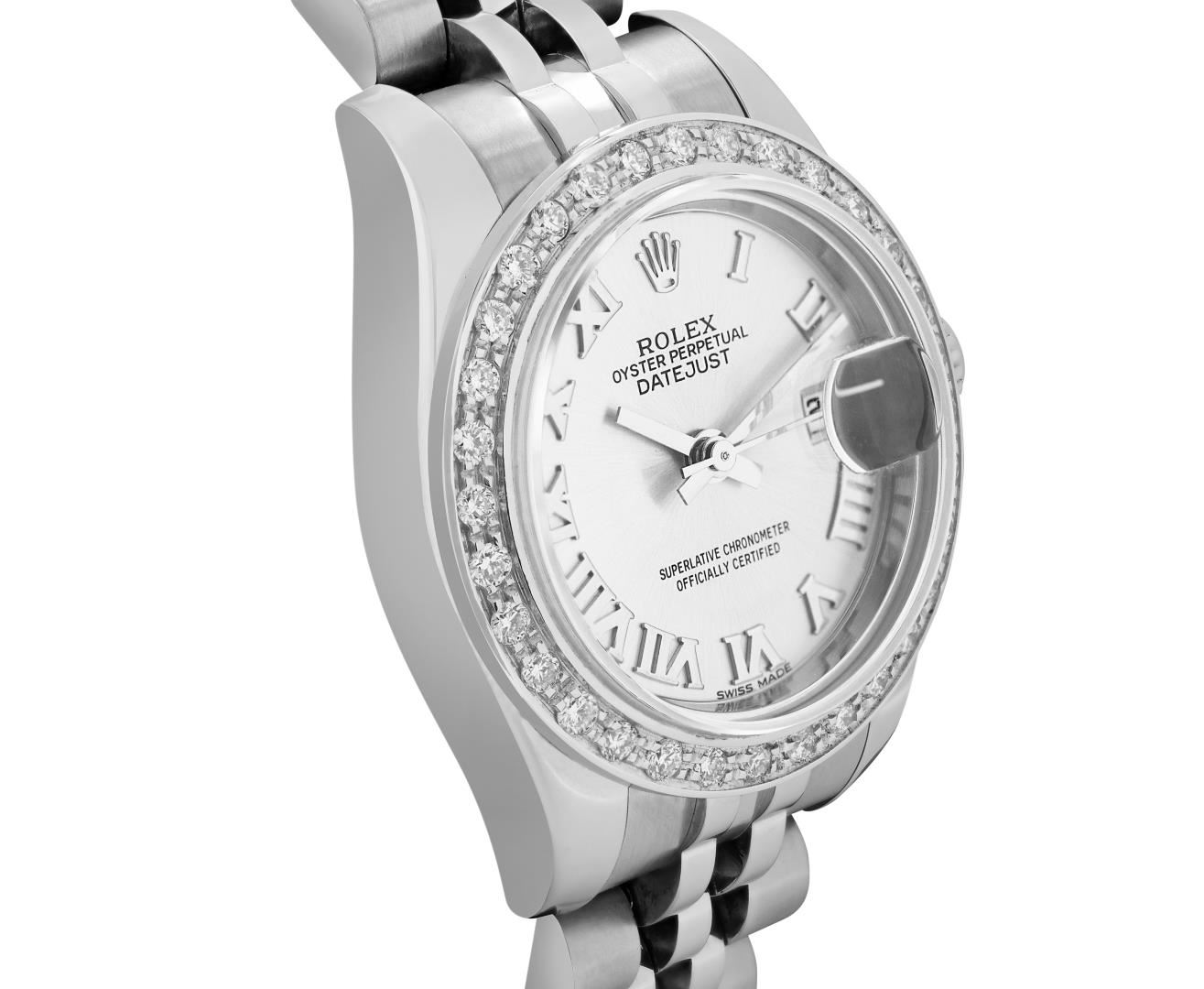 One Rolex Ladies Rolex Quickset Pre Owned Stainless Steel Date Wristwatch Polished Bright with Satin Finish, Serviced & Electronically Tested, Stainless Steel Case: 26mm, Stainless Steel Crown, Custom Bezel: New 18K White Gold Beadset Diamond Bezel, Diamond Count: 32 Diamonds. Crystal: Sapphire With Magnified Date Window. Hands: Non Luminescent Hands. Rolex Movement: 2235 Automatic Winding Movement. Rolex Dial: Factory Silver Roman Hour Markers. Date Window: 3 O'clock Position Date Display, Model: Quickset Date. Condition: G-6 Extra Fine. Rolex Bracelet: Stainless Steel Jubilee Band. Bright Polish & Satin Finish. 6.0 Inch Length, Adjustable. Hidden Clasp, With Rolex Logo. This Watch Has Been Serviced And Time Tested. It Is In Excellent Condition, Free Of All Scratches And Dents. This Watch Comes With A Rolex Box.