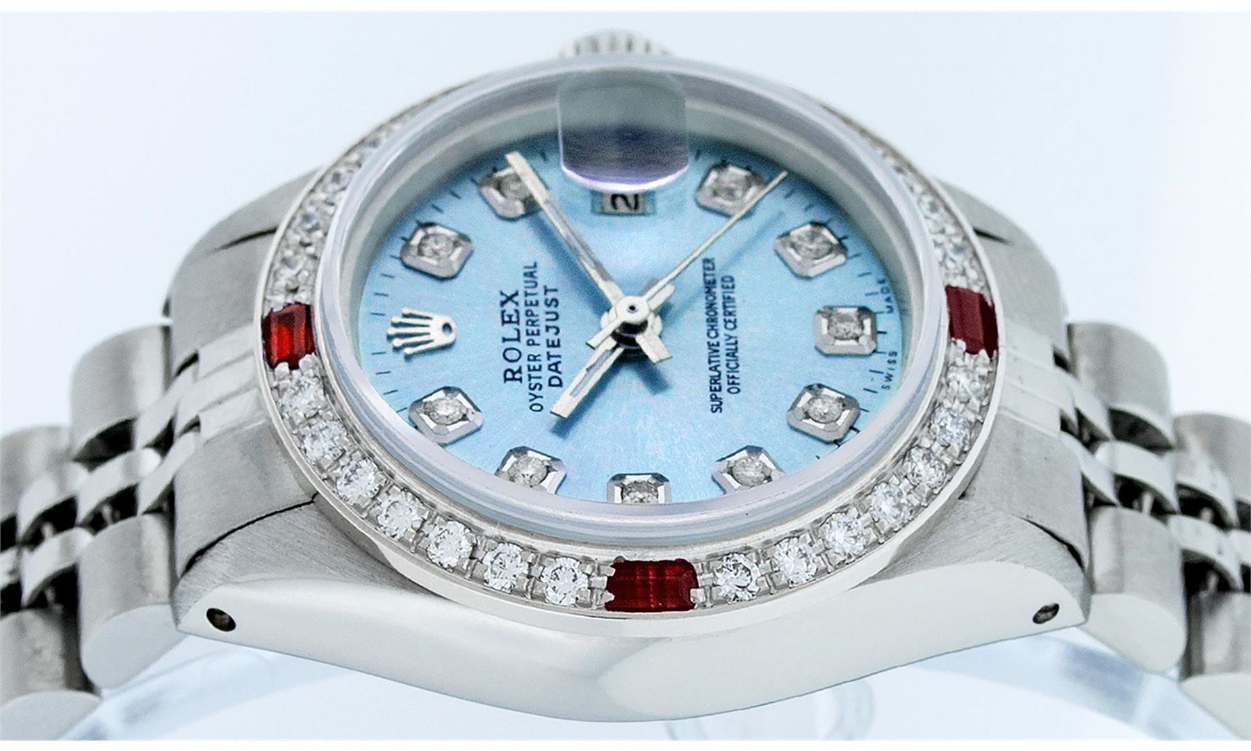 One Ladies Stainless Steel Rolex Datejust Polished Bright with Satin Finish, Serviced & Electronically Tested, Stainless Steel Case: 26mm, Stainless Steel Crown, Custom Bezel: New 18K White Gold Ruby Beadset Diamond Bezel, Diamond + Gem Count: 28 Diamonds + 4 Rubies. Total Weight .70 Carat, Clarity: SI-VS, Color: G to H. Custom Crystal: New Scratch Resistant Synthetic Sapphire Cyclops Lens. Custom Hands: New Luminescent Hands. Movement: Automatic Winding Movement Caliber 2030. Custom Dial: Refinished Sky Blue With Diamond Hour Markers & Dash Tracks, 10 Diamonds in Dial, G To H In Color, Clarity: SI-VS. Date Window: 3 O'Clock Position Date Display, Model: Datejust. Condition: G-6 Extra Fine. Bracelet: Stainless Steel Jubilee Band. Bright Polish & Satin Finish. 6.0 Inch Length, Adjustable. Standard Clasp, With Rolex Logo. This Watch Has Been Serviced Time Tested And Is In Excellent Condition It Is Free Of All Scratches And Dents.