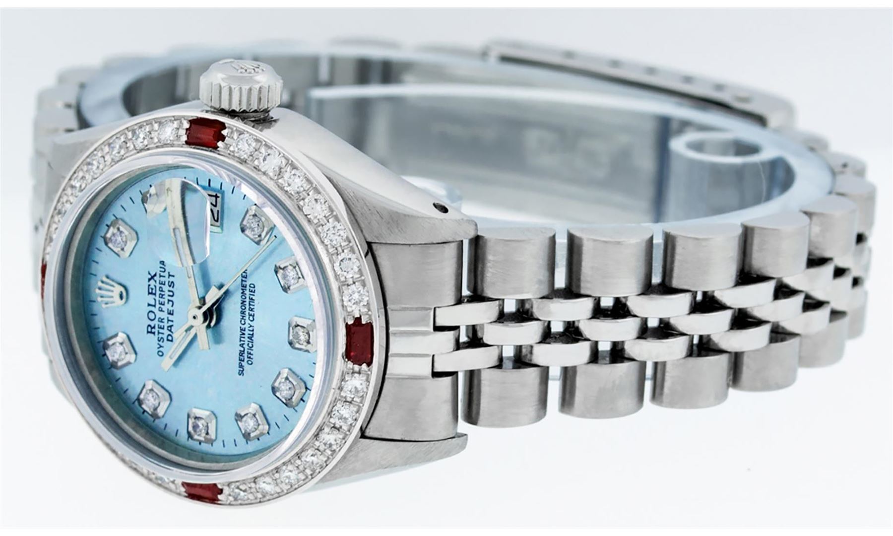 One Ladies Stainless Steel Rolex Datejust Polished Bright with Satin Finish, Serviced & Electronically Tested, Stainless Steel Case: 26mm, Stainless Steel Crown, Custom Bezel: New 18K White Gold Ruby Beadset Diamond Bezel, Diamond + Gem Count: 28 Diamonds + 4 Rubies. Total Weight .70 Carat, Clarity: SI-VS, Color: G to H. Custom Crystal: New Scratch Resistant Synthetic Sapphire Cyclops Lens. Custom Hands: New Luminescent Hands. Movement: Automatic Winding Movement Caliber 2030. Custom Dial: Refinished Sky Blue With Diamond Hour Markers & Dash Tracks, 10 Diamonds in Dial, G To H In Color, Clarity: SI-VS. Date Window: 3 O'Clock Position Date Display, Model: Datejust. Condition: G-6 Extra Fine. Bracelet: Stainless Steel Jubilee Band. Bright Polish & Satin Finish. 6.0 Inch Length, Adjustable. Standard Clasp, With Rolex Logo. This Watch Has Been Serviced Time Tested And Is In Excellent Condition It Is Free Of All Scratches And Dents.