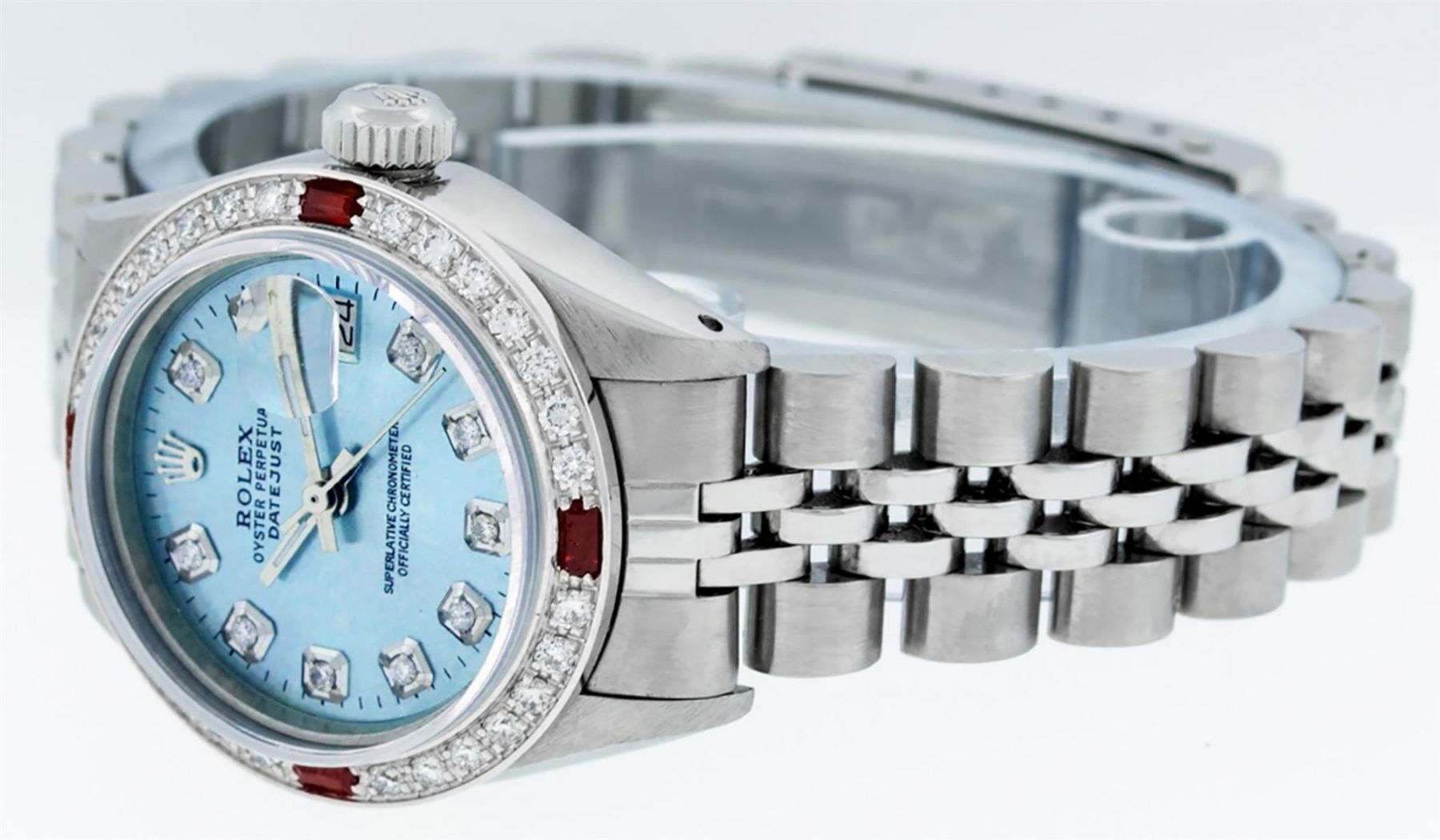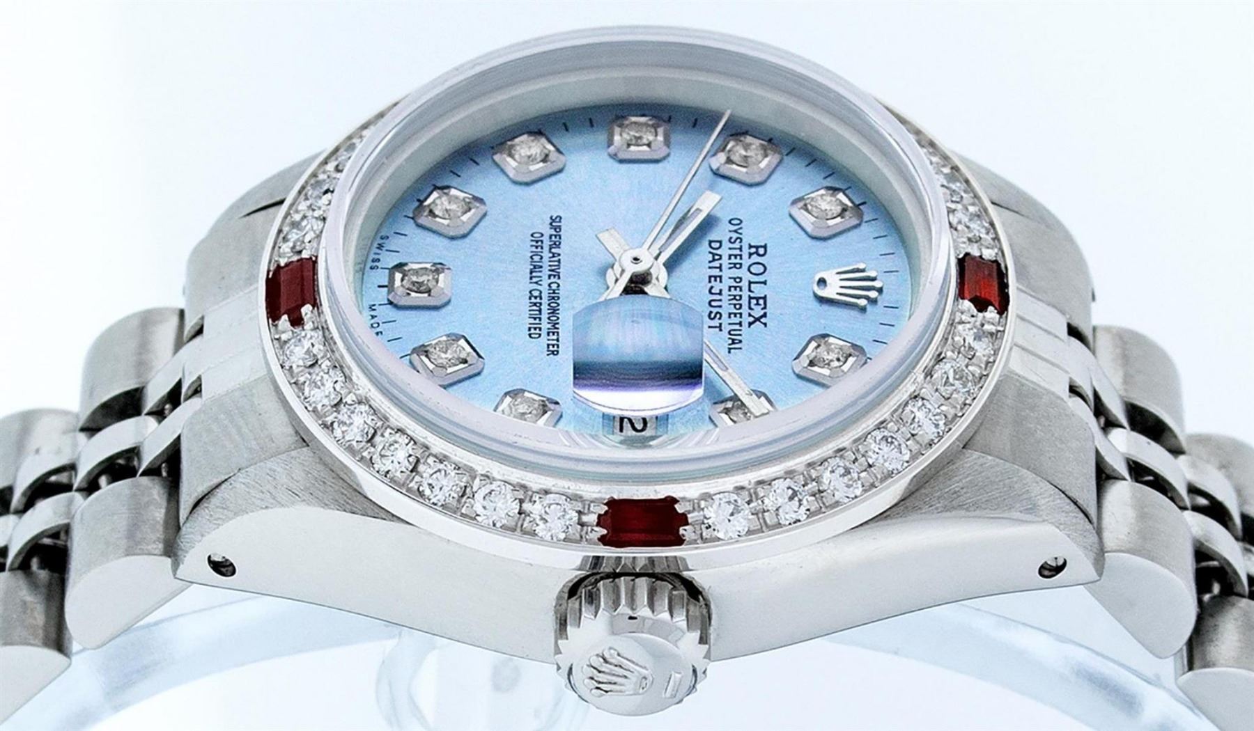 One Ladies Stainless Steel Rolex Datejust Polished Bright with Satin Finish, Serviced & Electronically Tested, Stainless Steel Case: 26mm, Stainless Steel Crown, Custom Bezel: New 18K White Gold Ruby Beadset Diamond Bezel, Diamond + Gem Count: 28 Diamonds + 4 Rubies. Total Weight .70 Carat, Clarity: SI-VS, Color: G to H. Custom Crystal: New Scratch Resistant Synthetic Sapphire Cyclops Lens. Custom Hands: New Luminescent Hands. Movement: Automatic Winding Movement Caliber 2030. Custom Dial: Refinished Sky Blue With Diamond Hour Markers & Dash Tracks, 10 Diamonds in Dial, G To H In Color, Clarity: SI-VS. Date Window: 3 O'Clock Position Date Display, Model: Datejust. Condition: G-6 Extra Fine. Bracelet: Stainless Steel Jubilee Band. Bright Polish & Satin Finish. 6.0 Inch Length, Adjustable. Standard Clasp, With Rolex Logo. This Watch Has Been Serviced Time Tested And Is In Excellent Condition It Is Free Of All Scratches And Dents.