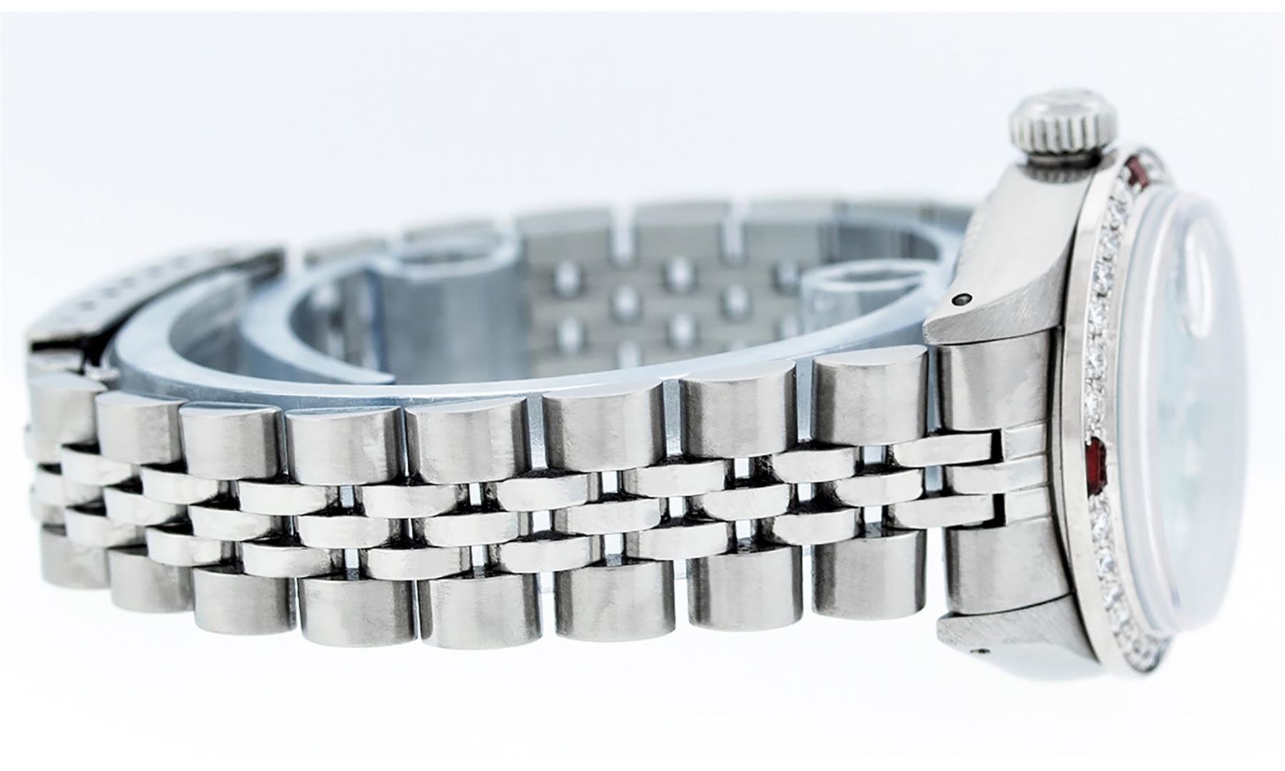 One Ladies Stainless Steel Rolex Datejust Polished Bright with Satin Finish, Serviced & Electronically Tested, Stainless Steel Case: 26mm, Stainless Steel Crown, Custom Bezel: New 18K White Gold Ruby Beadset Diamond Bezel, Diamond + Gem Count: 28 Diamonds + 4 Rubies. Total Weight .70 Carat, Clarity: SI-VS, Color: G to H. Custom Crystal: New Scratch Resistant Synthetic Sapphire Cyclops Lens. Custom Hands: New Luminescent Hands. Movement: Automatic Winding Movement. Custom Dial: Refinished Sky Blue With Diamond Hour Markers & Dash Tracks, 10 Diamonds in Dial, G To H In Color, Clarity: SI-VS. Date Window: 3 O'Clock Position Date Display, Model: Datejust. Condition: G-6 Extra Fine. Bracelet: Stainless Steel Jubilee Band. Bright Polish & Satin Finish. 6.0 Inch Length, Adjustable. Standard Clasp, With Rolex Logo. This Watch Has Been Serviced Time Tested And Is In Excellent Condition It Is Free Of All Scratches And Dents.