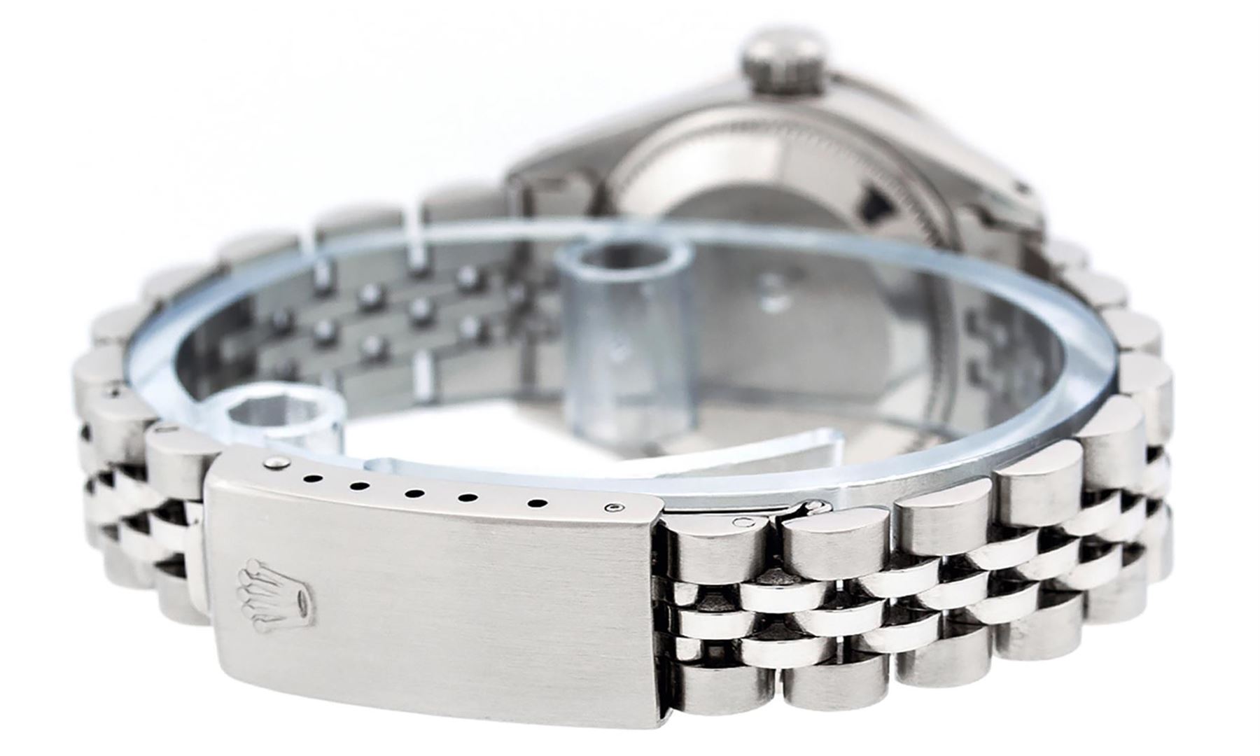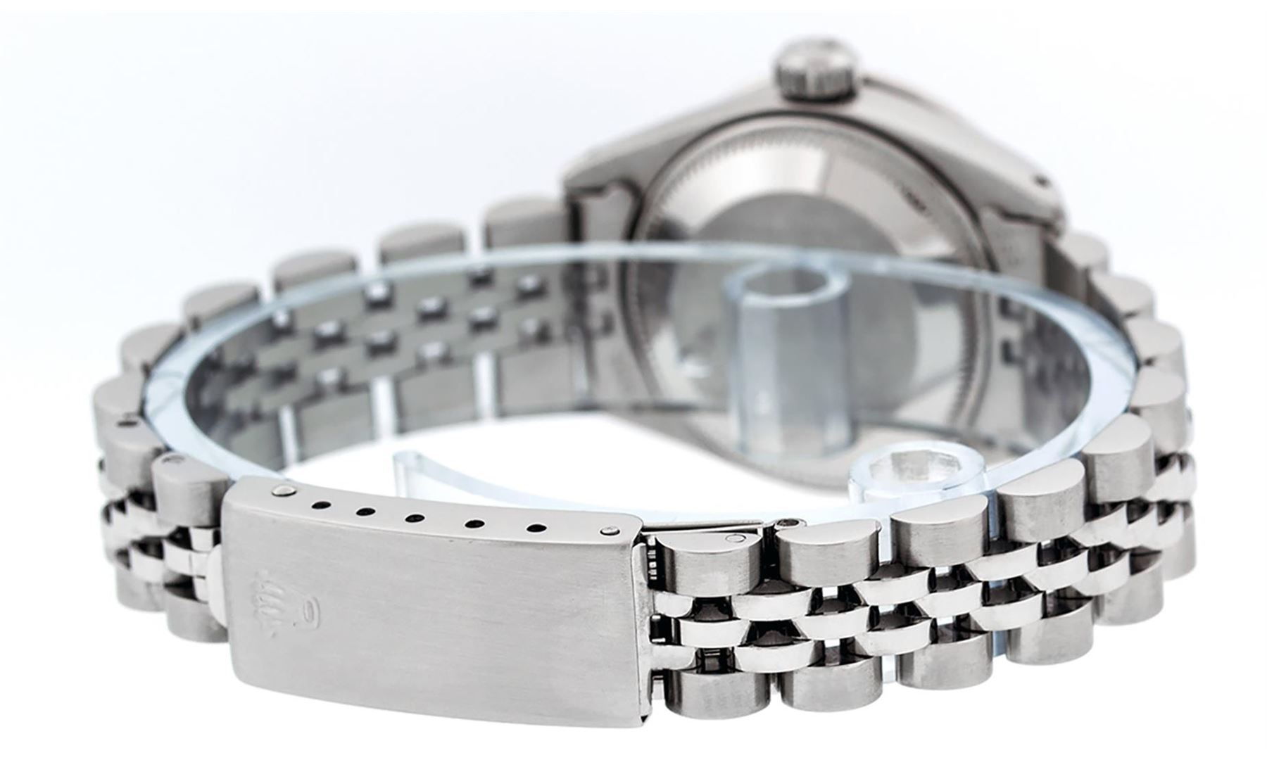 One Ladies Stainless Steel Rolex Datejust Polished Bright with Satin Finish, Serviced & Electronically Tested, Stainless Steel Case: 26mm, Stainless Steel Crown, Custom Bezel: New 18K White Gold Ruby Beadset Diamond Bezel, Diamond + Gem Count: 28 Diamonds + 4 Rubies. Total Weight .70 Carat, Clarity: SI-VS, Color: G to H. Custom Crystal: New Scratch Resistant Synthetic Sapphire Cyclops Lens. Custom Hands: New Luminescent Hands. Movement: Automatic Winding Movement. Custom Dial: Refinished Sky Blue With Diamond Hour Markers & Dash Tracks, 10 Diamonds in Dial, G To H In Color, Clarity: SI-VS. Date Window: 3 O'Clock Position Date Display, Model: Datejust. Condition: G-6 Extra Fine. Bracelet: Stainless Steel Jubilee Band. Bright Polish & Satin Finish. 6.0 Inch Length, Adjustable. Standard Clasp, With Rolex Logo. This Watch Has Been Serviced Time Tested And Is In Excellent Condition It Is Free Of All Scratches And Dents.