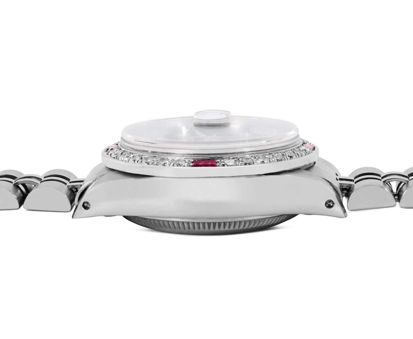 One Rolex Ladies Pre Owned Stainless Steel Date Wristwatch Polished Bright with Satin Finish, Serviced and Electronically Tested, Stainless Steel Case: 26mm, Stainless Steel Crown, Custom Bezel: New 18K White Gold Ruby Beadset Diamond Bezel, Diamond + Gem Count: 36 Diamonds + 4 Rubies. Custom Crystal: New Sapphire With Magnified Date Window. Rolex Movement: Automatic Winding Movement 2035. Custom Dial: Custom Slate Gray Dial With Added Diamond Hour Markers, Dash Tracks, And Lumi Dots. Date Window: 3 O'Clock Position Date Display, Model: Date. Condition: G-6 Extra Fine. Rolex Bracelet: Stainless Steel Jubilee Band. Bright Polish and Satin Finish. 6.0 Inch Length, Adjustable. Standard Clasp, With Rolex Logo. This Watch Has Been Serviced Time Tested And Is In Excellent Condition. It Is Free Of All Scratches And Dents.