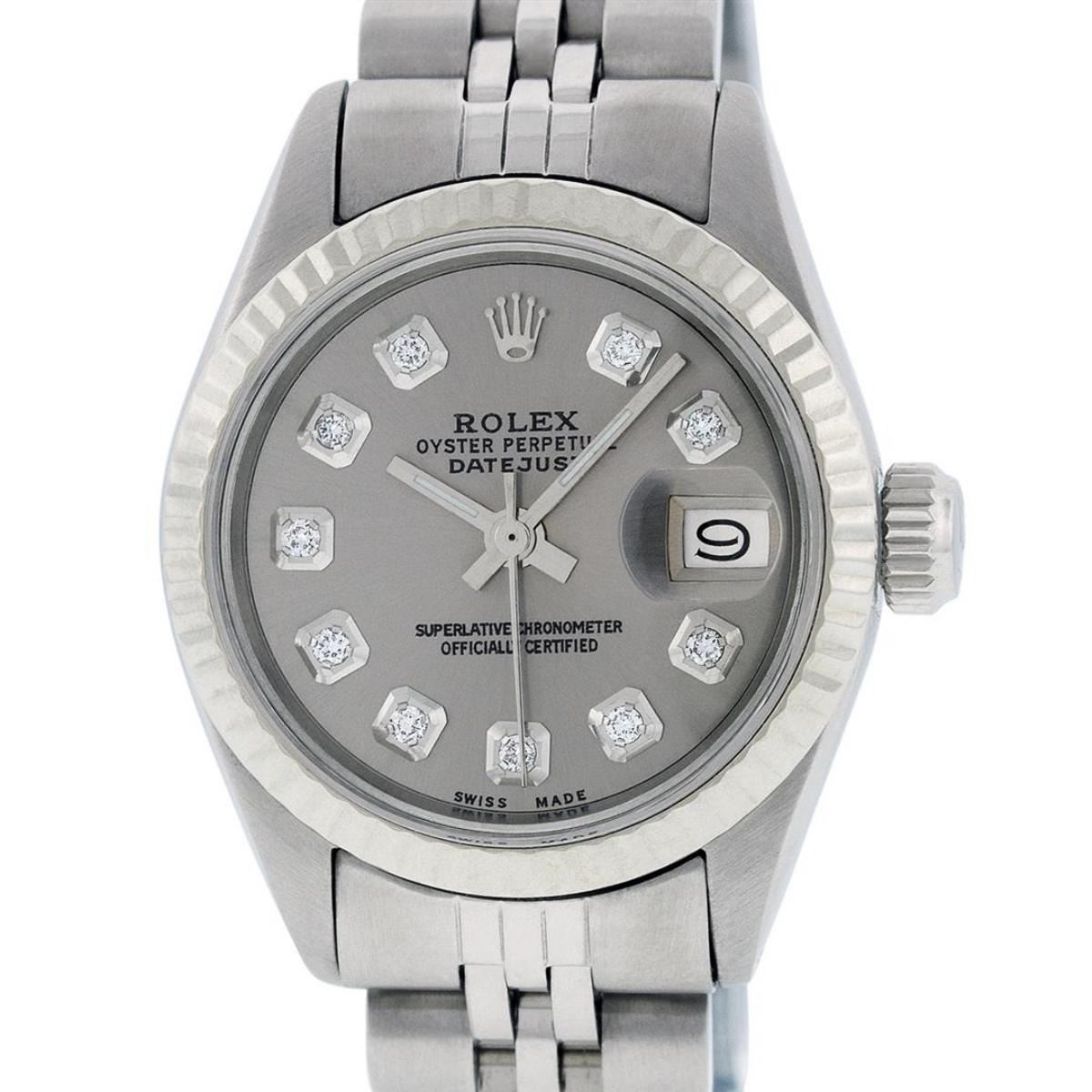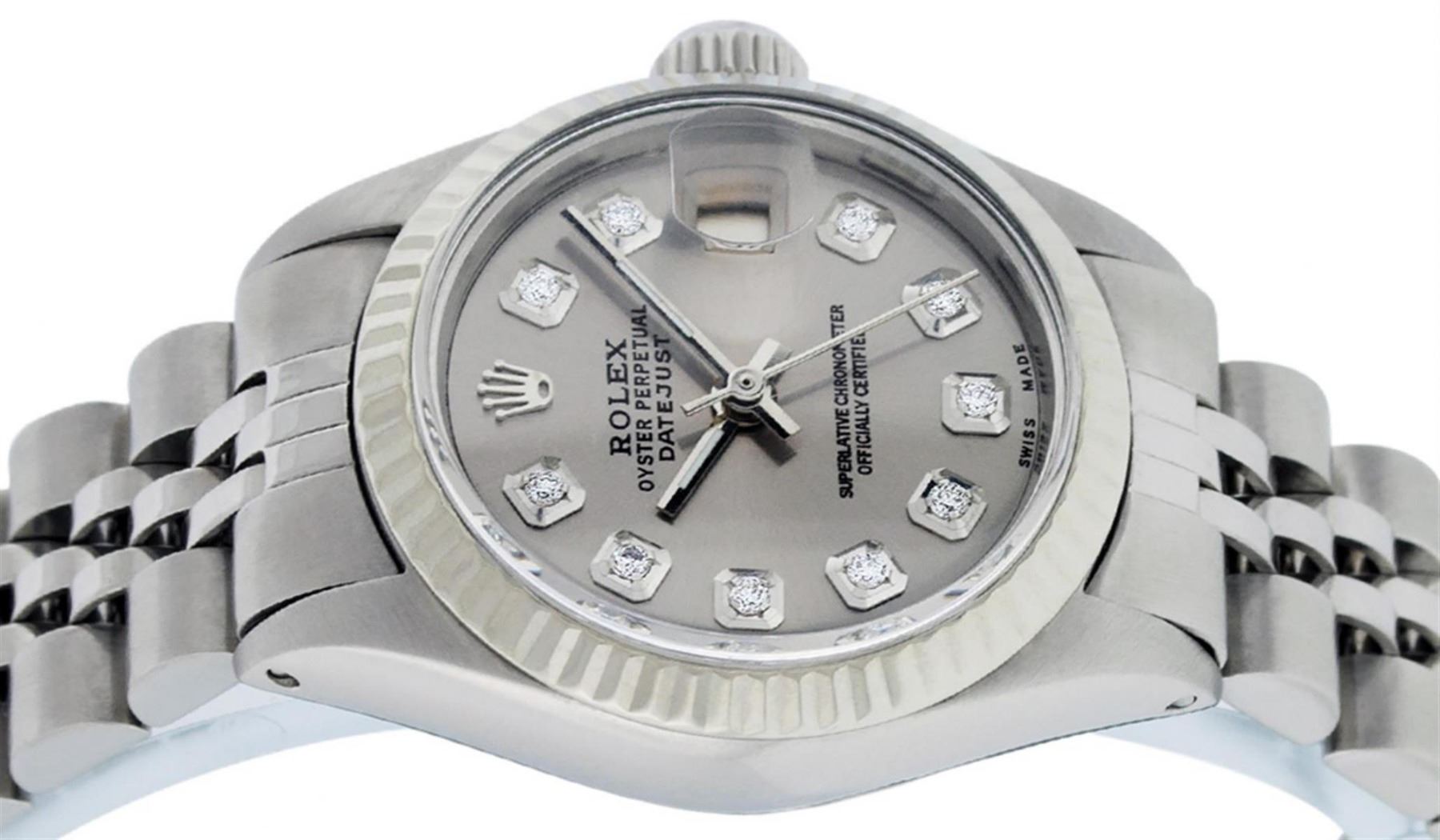 One Ladies Stainless Steel Rolex Datejust Polished Bright with Satin Finish, Serviced & Electronically Tested, Stainless Steel Case: 26mm, Stainless Steel Crown, Bezel: 14K White Gold Bezel. Custom Crystal: New Acrylic Cyclops Lens. Custom Hands: New Luminescent Hands. Movement: Automatic Winding Movement Caliber 2030. Dial: Slate Grey Diamond Dial, Diamond Count: 10 Diamonds In Dial, Color: G to H, Clarity: SI-VS. Date Window: 3 O'Clock Position Date Display, Model: Datejust. Condition: G-6 Extra Fine. Bracelet: Stainless Steel Jubilee Band. Bright Polish & Satin Finish. 6.0 Inch Length, Adjustable. Standard Clasp, With Rolex Logo. This Watch Has Been Serviced Time Tested And Is In Excellent Condition It Is Free Of All Scratches And Dents.