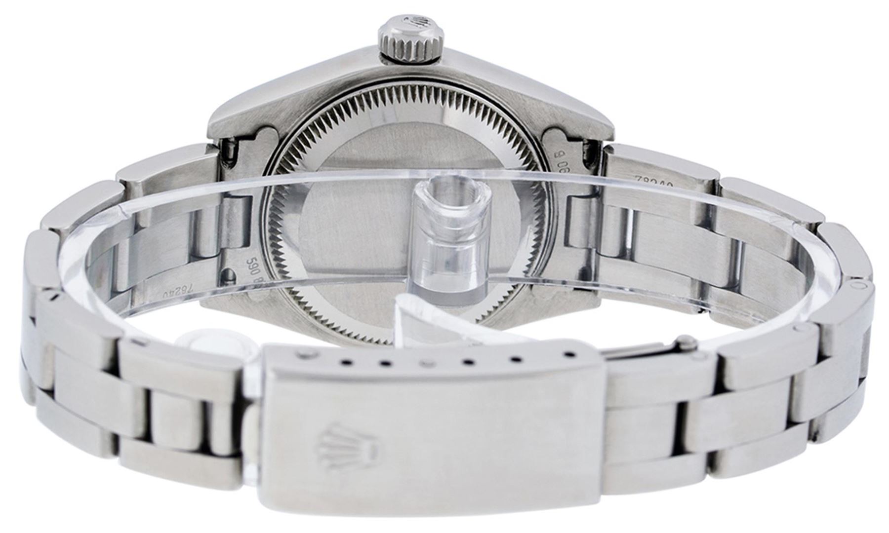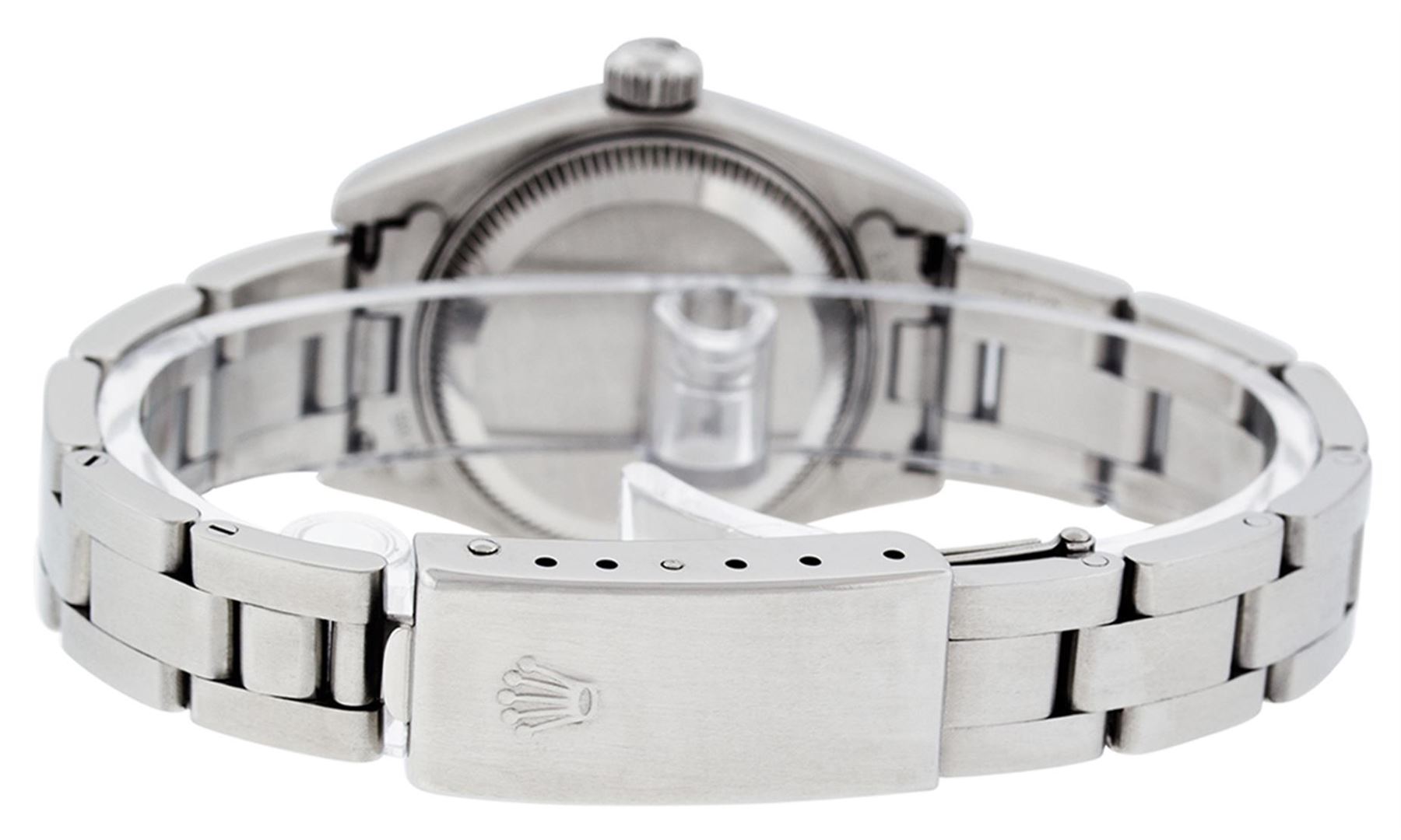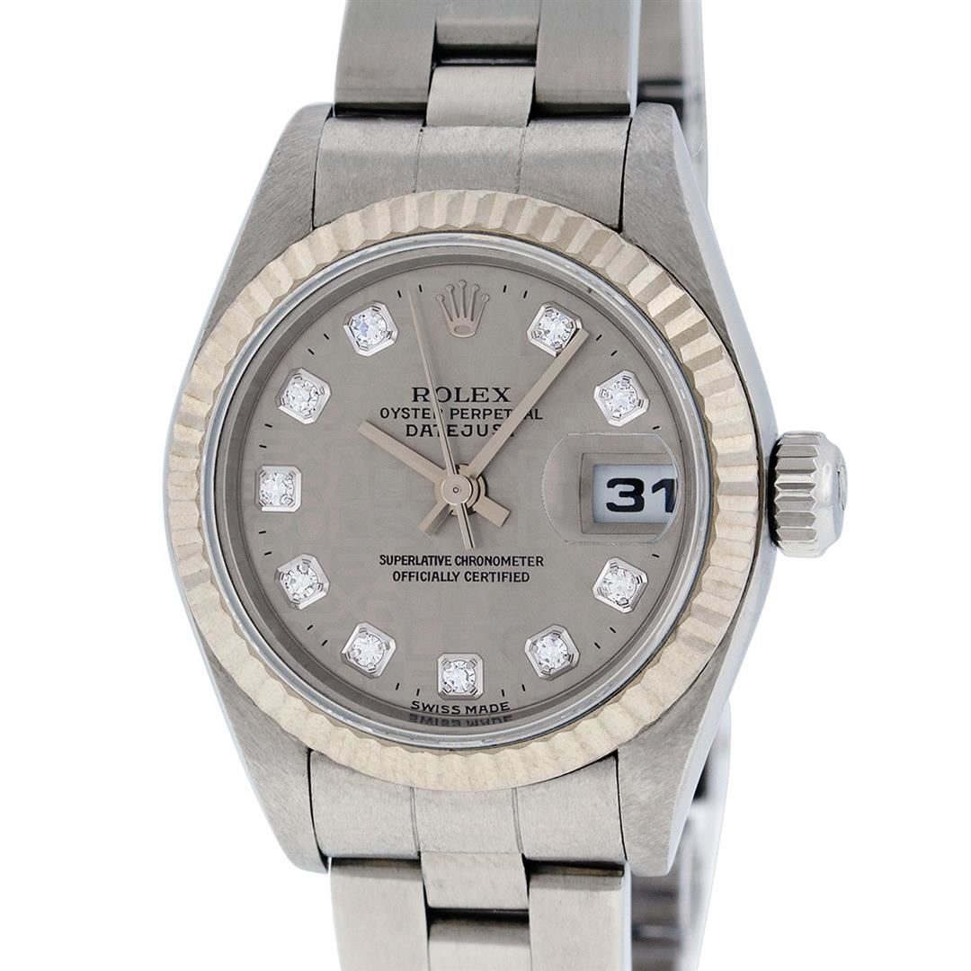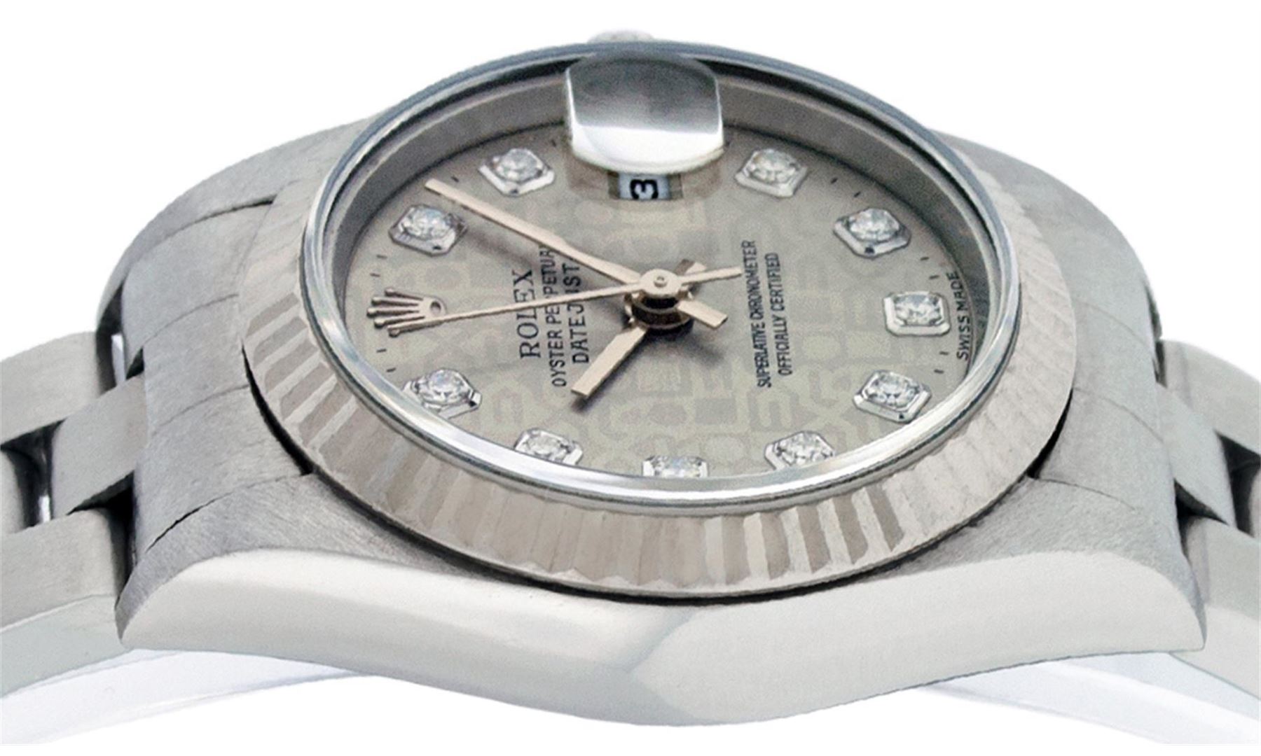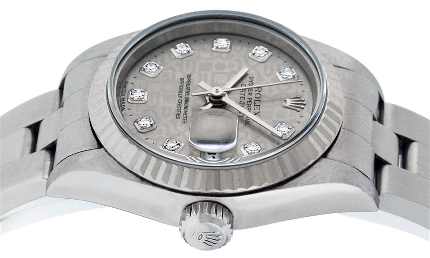 One Ladies Quickset Stainless Steel Rolex Datejust Polished Bright with Satin Finish, Serviced & Electronically Tested, Stainless Steel Case: 26mm, Stainless Steel Crown, Bezel: 18K White Gold Fluted Bezel. Custom Crystal: New Scratch Resistant Sapphire Cyclops Lens. Custom Hands: New Luminescent Hands. Movement: Automatic Winding Movement Caliber 2235. Custom Dial: Slate Grey Jubilee Diamond Dial, Diamond Count: 10 Single Cut Diamonds In Dial, Color: G to H, Clarity: VS2. Date Window: 3 O'Clock Position Date Display, Model: 79174 Quickset Datejust. Condition: G-6 Extra Fine. Bracelet: Stainless Steel Oyster Band. Bright Polish & Satin Finish. 6.0 Inch Length, Adjustable. Standard Clasp, With Rolex Logo. This Watch Has Been Serviced Time Tested And Is In Excellent Condition It Is Free Of All Scratches And Dents.