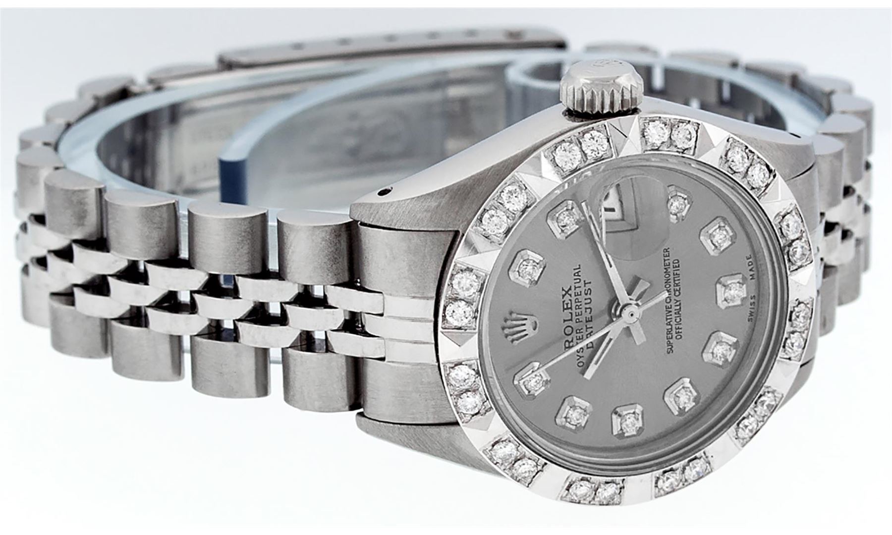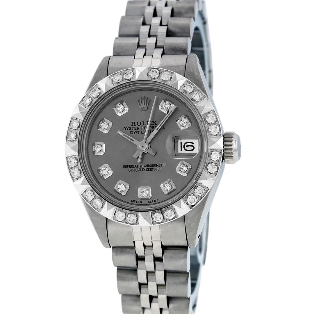 One Ladies Stainless Steel Rolex Datejust Polished Bright with Satin Finish, Serviced & Electronically Tested, Stainless Steel Case: 26mm, Stainless Steel Crown, Custom Bezel: New 18K White Gold Pyramid Diamond Bezel, Diamond Count: 24 Diamonds In Dial. Total Weight .50 Carat, Clarity: SI-VS, Color: G to H. Custom Crystal: New Scratch Resistant Synthetic Sapphire Cyclops Lens. Custom Hands: New Luminescent Hands. Movement: Automatic Winding Movement Caliber 2030. Custom Dial: Slate Grey Diamond Dial. Diamond Count: 10 Diamonds In Dial. Clarity: SI-VS, Color: G to H. Date Window: 3 O'Clock Position Date Display, Model: Datejust. Condition: G-6 Extra Fine. Bracelet: Stainless Steel Jubilee Band With Rolex Crown On Buckle. Bright Polish & Satin Finish. Band Length: 6.0 Inch Length, Adjustable. Standard Clasp, With Rolex Logo. This Watch Has Been Serviced Time Tested And Is In Excellent Condition It Is Free Of All Scratches And Dents.