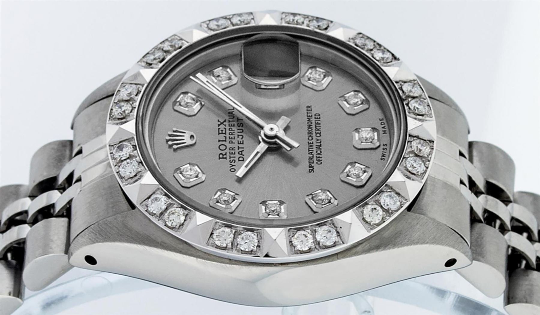 One Ladies Stainless Steel Rolex Datejust Polished Bright with Satin Finish, Serviced & Electronically Tested, Stainless Steel Case: 26mm, Stainless Steel Crown, Custom Bezel: New 18K White Gold Pyramid Diamond Bezel, Diamond Count: 24 Diamonds In Dial. Total Weight .50 Carat, Clarity: SI-VS, Color: G to H. Custom Crystal: New Scratch Resistant Synthetic Sapphire Cyclops Lens. Custom Hands: New Luminescent Hands. Movement: Automatic Winding Movement. Custom Dial: Slate Grey Diamond Dial. Diamond Count: 10 Diamonds In Dial. Clarity: SI-VS, Color: G to H. Date Window: 3 O'Clock Position Date Display, Model: Datejust. Condition: G-6 Extra Fine. Bracelet: Stainless Steel Jubilee Band With Rolex Crown On Buckle. Bright Polish & Satin Finish. Band Length: 6.0 Inch Length, Adjustable. Standard Clasp, With Rolex Logo. This Watch Has Been Serviced Time Tested And Is In Excellent Condition It Is Free Of All Scratches And Dents.