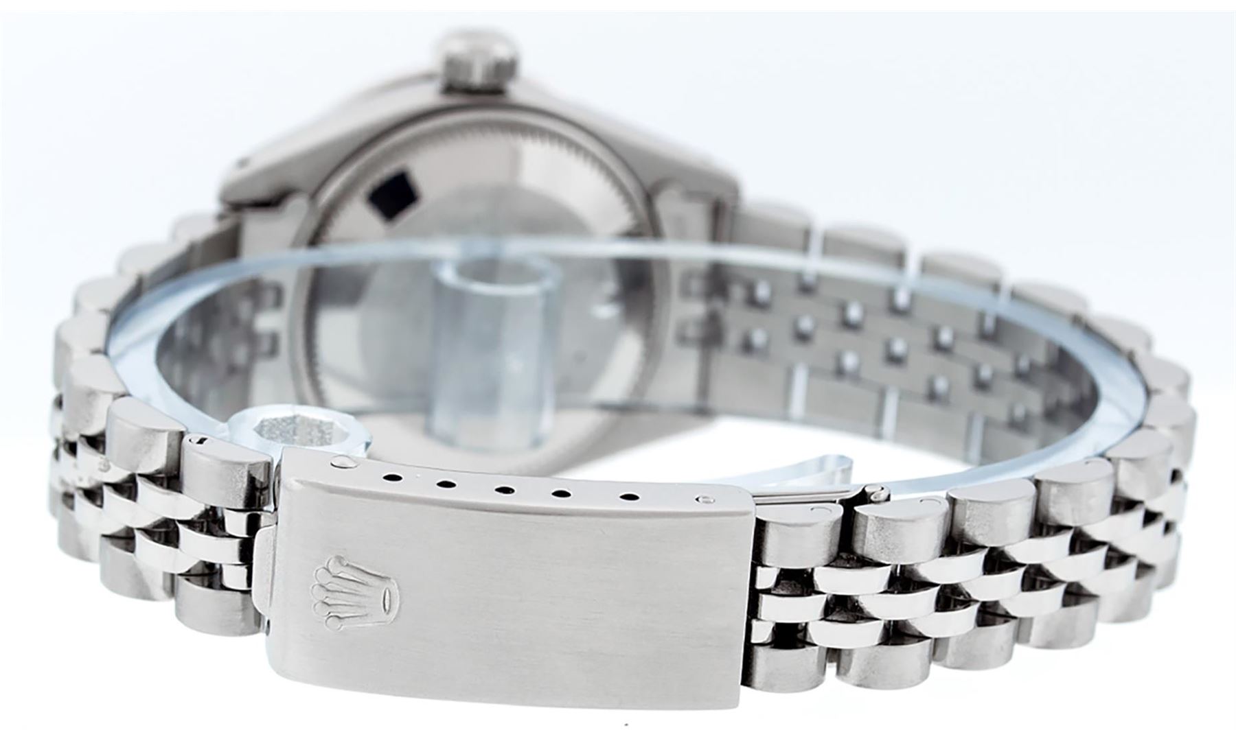 One Ladies Stainless Steel Rolex Datejust Polished Bright with Satin Finish, Serviced & Electronically Tested, Stainless Steel Case: 26mm, Stainless Steel Crown, Bezel: 14K White Gold Bezel. Custom Crystal: New Acrylic Cyclops Lens. Custom Hands: New Luminescent Hands. Movement: Automatic Winding Movement Caliber 2030. Custom Dial: Refinished Slate Grey Roman Dial. Date Window: 3 O'Clock Position Date Display, Model: Datejust. Condition: G-6 Extra Fine. Bracelet: Stainless Steel Jubilee Band. Bright Polish & Satin Finish. 6.0 Inch Length, Adjustable. Standard Clasp, With Rolex Logo. This Watch Has Been Serviced Time Tested And Is In Excellent Condition It Is Free Of All Scratches And Dents.