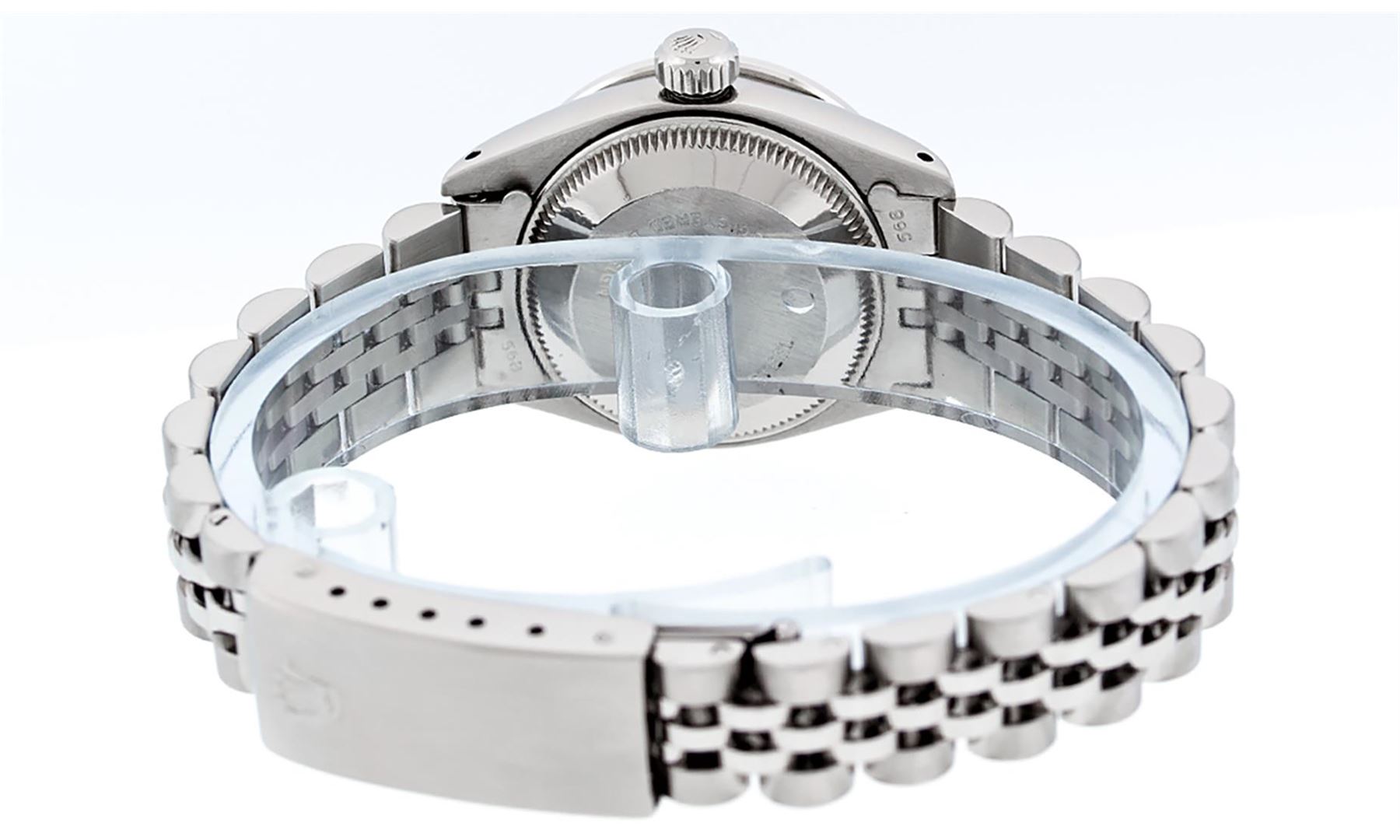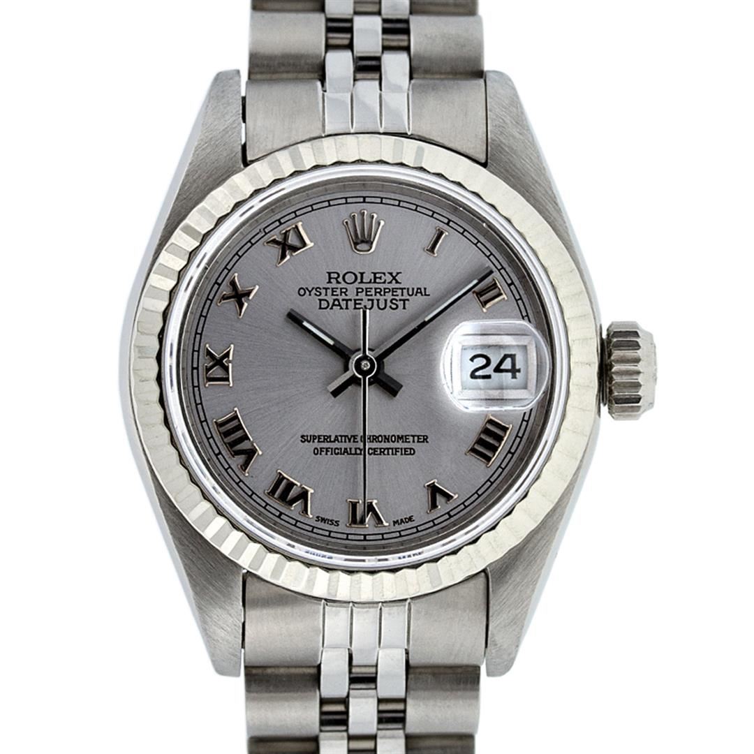 One Ladies Stainless Steel Rolex Datejust Polished Bright with Satin Finish, Serviced & Electronically Tested, Stainless Steel Case: 26mm, Stainless Steel Crown, Bezel: 14K White Gold Bezel. Custom Crystal: New Acrylic Cyclops Lens. Custom Hands: New Luminescent Hands. Movement: Automatic Winding Movement Caliber 2030. Custom Dial: Refinished Slate Grey Roman Dial. Date Window: 3 O'Clock Position Date Display, Model: Datejust. Condition: G-6 Extra Fine. Bracelet: Stainless Steel Jubilee Band. Bright Polish & Satin Finish. 6.0 Inch Length, Adjustable. Standard Clasp, With Rolex Logo. This Watch Has Been Serviced Time Tested And Is In Excellent Condition It Is Free Of All Scratches And Dents.
