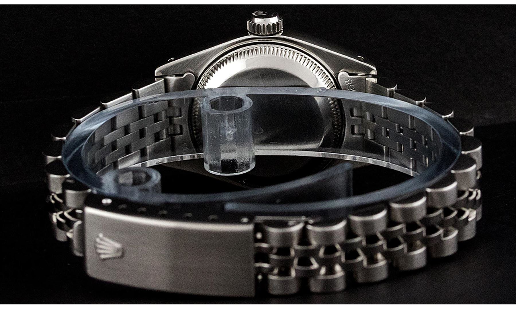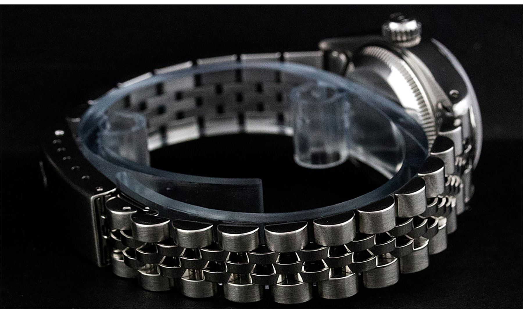One Ladies Pre Owned Stainless Steel Rolex Polished Bright with Satin Finish, Serviced & Electronically Tested, Rolex Stainless Steel Case: 26mm, Rolex Stainless Steel Crown, Rolex Bezel: 14K White Gold Bezel. Custom Crystal: New Sapphire With Date Window. Custom Hands: New Luminescent Hands. Rolex Movement: Automatic Winding Movement. Custom Dial: Slate Grey Roman With Square Track. Date Window: 3 O'Clock Position Date Display, Model: Datejust. Condition: G-6 Extra Fine. Rolex Bracelet: Stainless Steel Jubilee Band. Bright Polish & Satin Finish. 6.0 Inch Length, Adjustable. Standard Clasp, With Rolex Logo. This Pre Owned Watch Has Been Serviced Time Tested And Is In Excellent Condition It Is Free Of All Scratches And Dents.