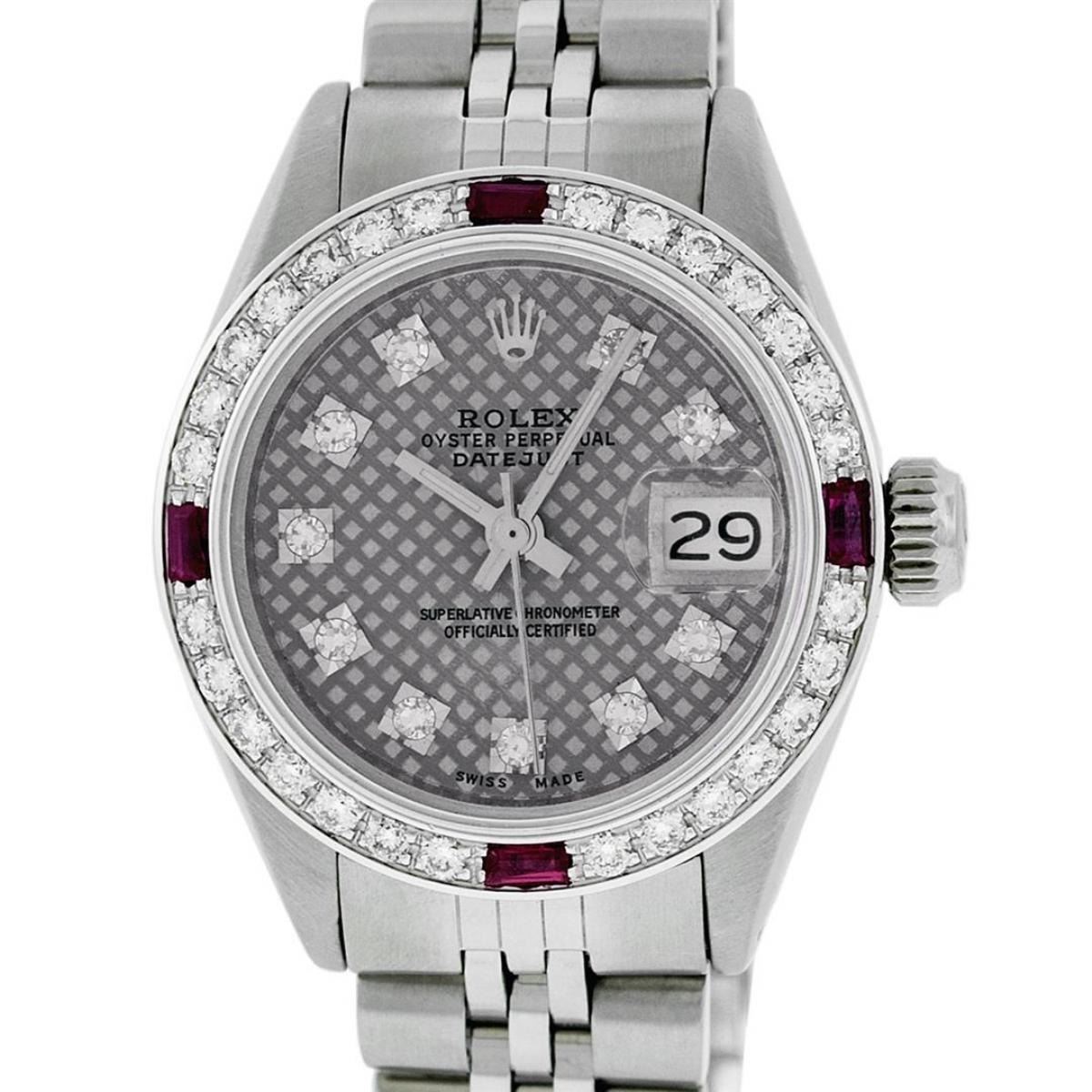 One Ladies Stainless Steel Rolex Datejust Polished Bright with Satin Finish, Serviced & Electronically Tested, Stainless Steel Case: 26mm, Stainless Steel Crown, Custom Bezel: New 18K White Gold Ruby Beadset Diamond Bezel, Diamond + Gem Count: 28 Diamonds + 4 Rubies. Total Weight .70 Carat, Clarity: SI-VS, Color: G to H. Custom Crystal: New Scratch Resistant Synthetic Sapphire Cyclops Lens. Custom Hands: New Luminescent Hands. Movement: Automatic Winding Movement. Custom Dial: Slate Grey Stamp With Single Cut Diamond Hour Markers, 10 Diamonds in Dial, G To H In Color, Clarity: SI-VS. Date Window: 3 O'Clock Position Date Display, Model: Datejust. Condition: G-6 Extra Fine. Bracelet: Stainless Steel Jubilee Band. Bright Polish & Satin Finish. 6.0 Inch Length, Adjustable. Standard Clasp, With Rolex Logo. This Watch Has Been Serviced Time Tested And Is In Excellent Condition It Is Free Of All Scratches And Dents.