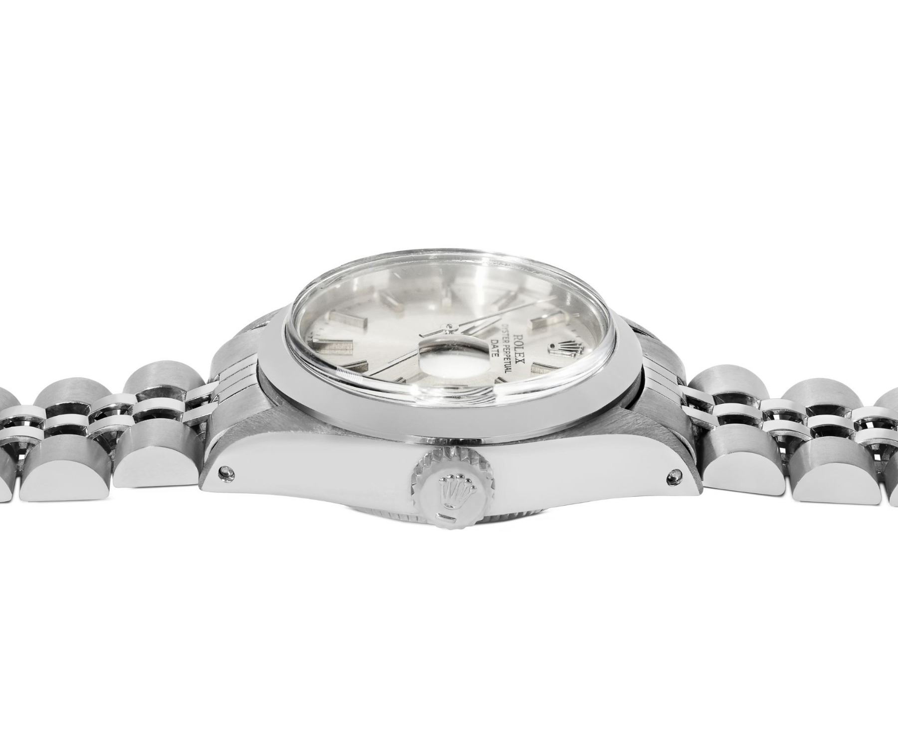 This Lady Rolex Date watch features a silver dial with index hour markers and a custom plastic crystal, with a magnified date window. The timepiece has Rolex stainless steel smooth bezel. The Rolex 26mm case is crafted from stainless steel and includes a Rolex screw-down crown. The bracelet is a Rolex stainless steel Jubilee band, designed to fit wrists up to 6 inches in circumference. The Watch Is Powered by the Rolex automatic self-winding Caliber 2035 movement. This watch has been polished and serviced and is in excellent condition. It will also be time tested before shipment.
