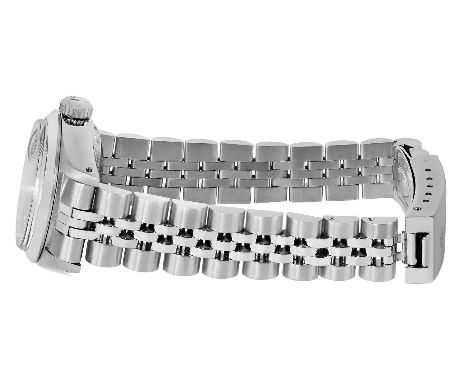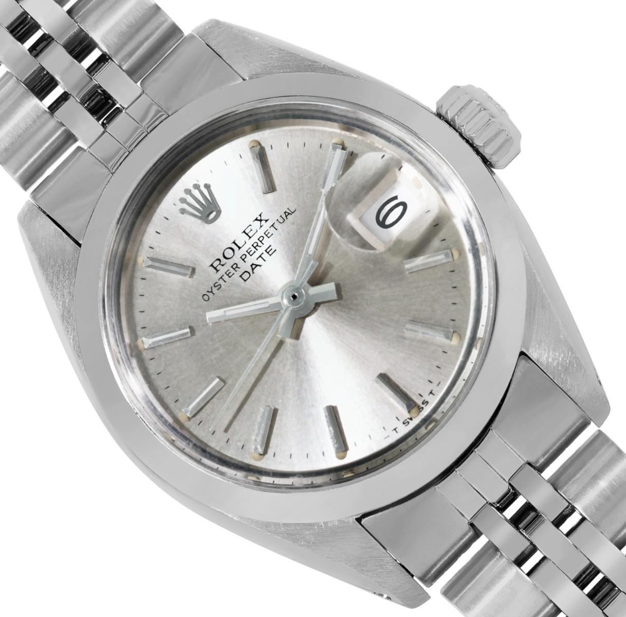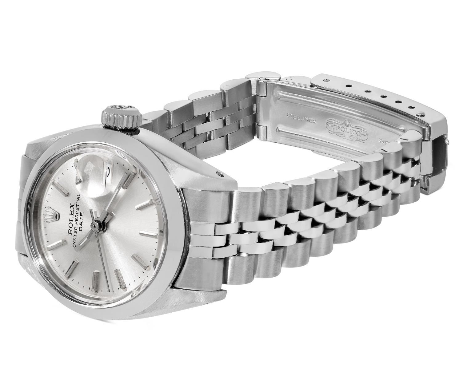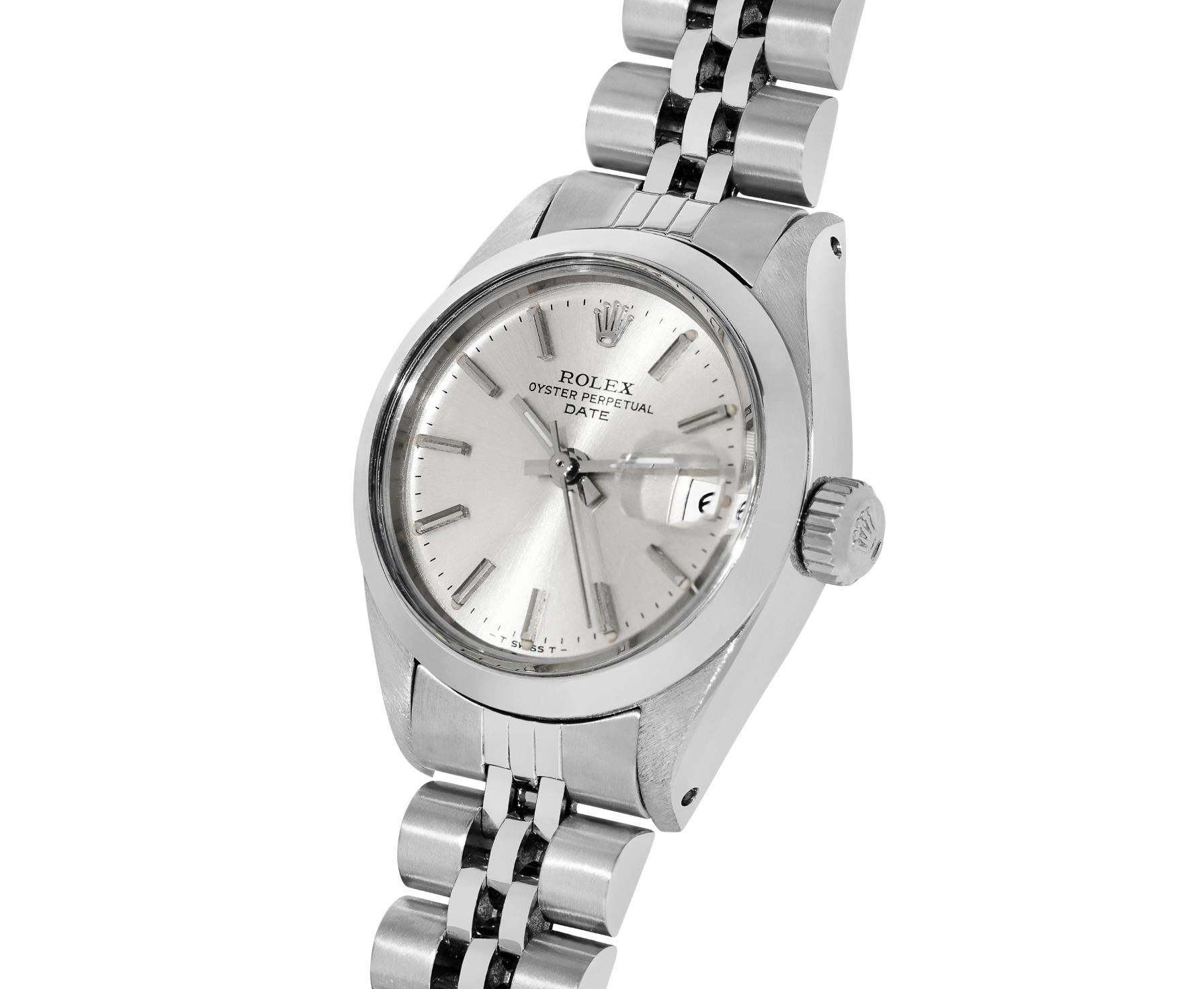 This Lady Rolex Date watch features a silver dial with index hour markers and a custom plastic crystal, with a magnified date window. The timepiece has Rolex stainless steel smooth bezel. The Rolex 26mm case is crafted from stainless steel and includes a Rolex screw-down crown. The bracelet is a Rolex stainless steel Jubilee band, designed to fit wrists up to 6 inches in circumference. The Watch Is Powered by the Rolex automatic self-winding Caliber 2035 movement. This watch has been polished and serviced and is in excellent condition. It will also be time tested before shipment.