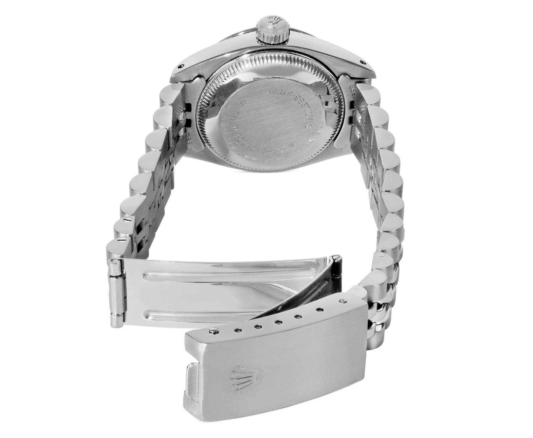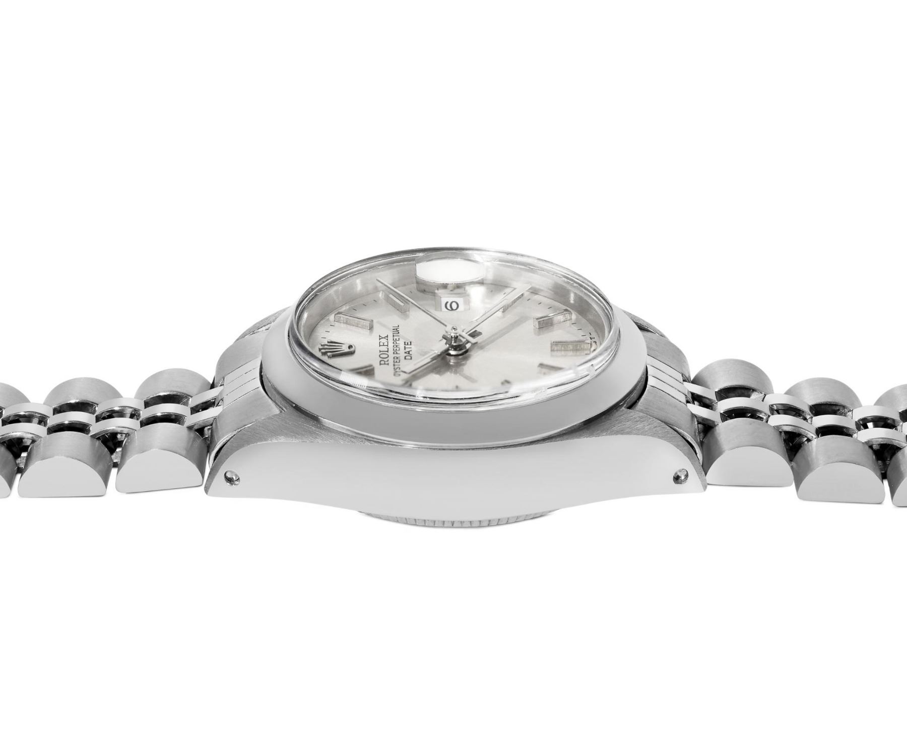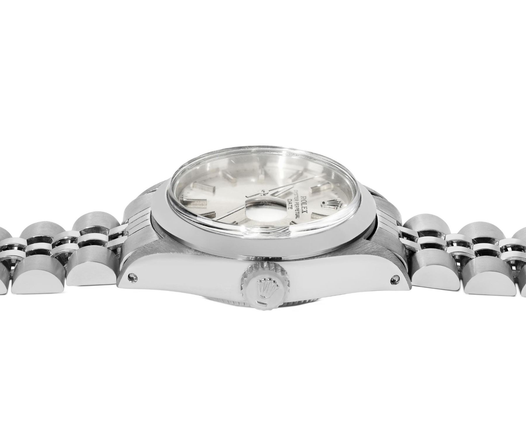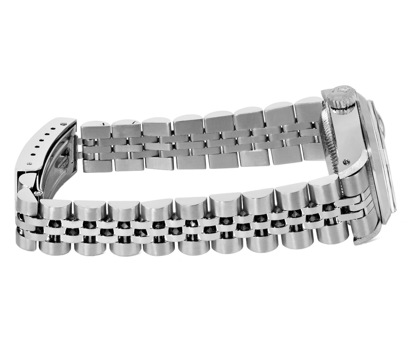 This Lady Rolex Date watch features a silver dial with index hour markers and a custom plastic crystal, with a magnified date window. The timepiece has Rolex stainless steel smooth bezel. The Rolex 26mm case is crafted from stainless steel and includes a Rolex screw-down crown. The bracelet is a Rolex stainless steel Jubilee band, designed to fit wrists up to 6 inches in circumference. The Watch Is Powered by the Rolex automatic self-winding Caliber 2035 movement. This watch has been polished and serviced and is in excellent condition. It will also be time tested before shipment.