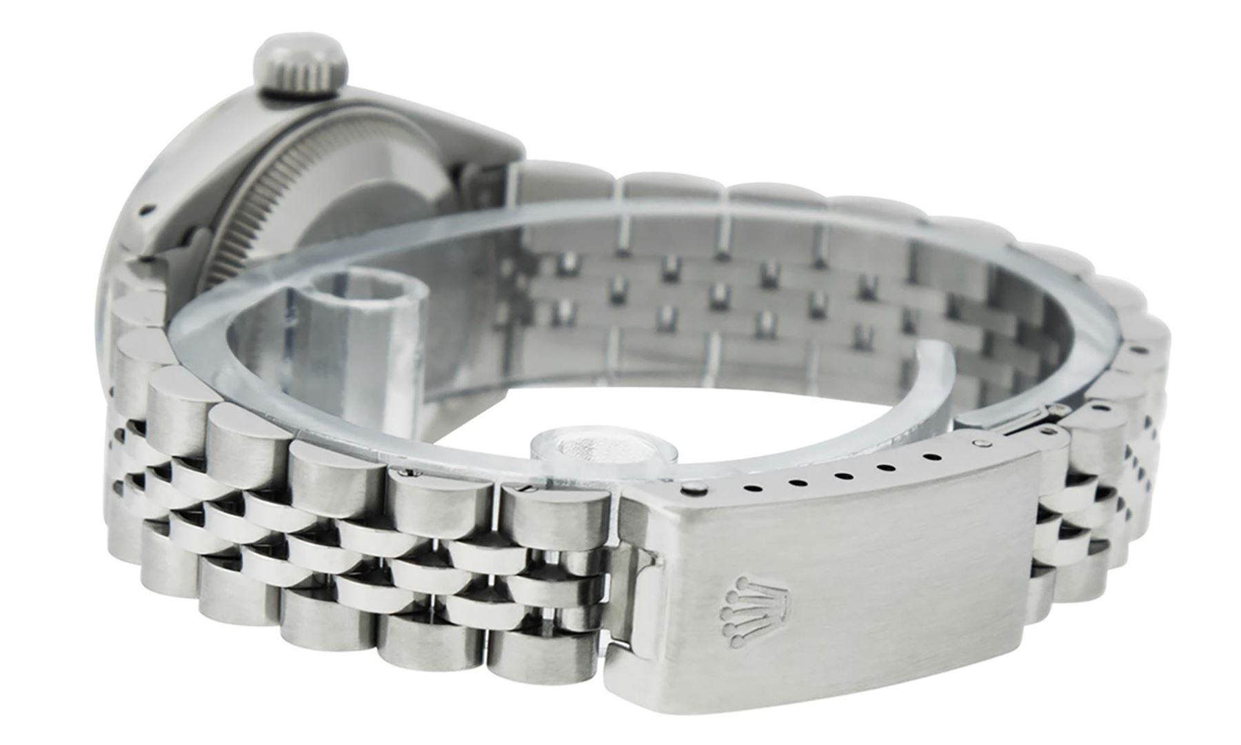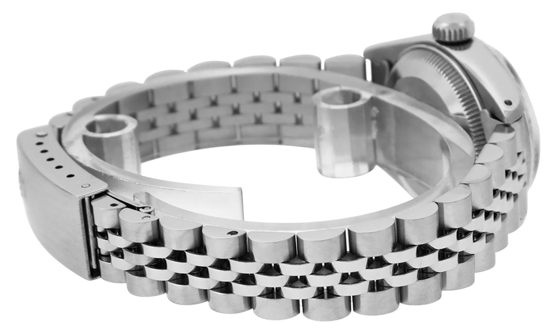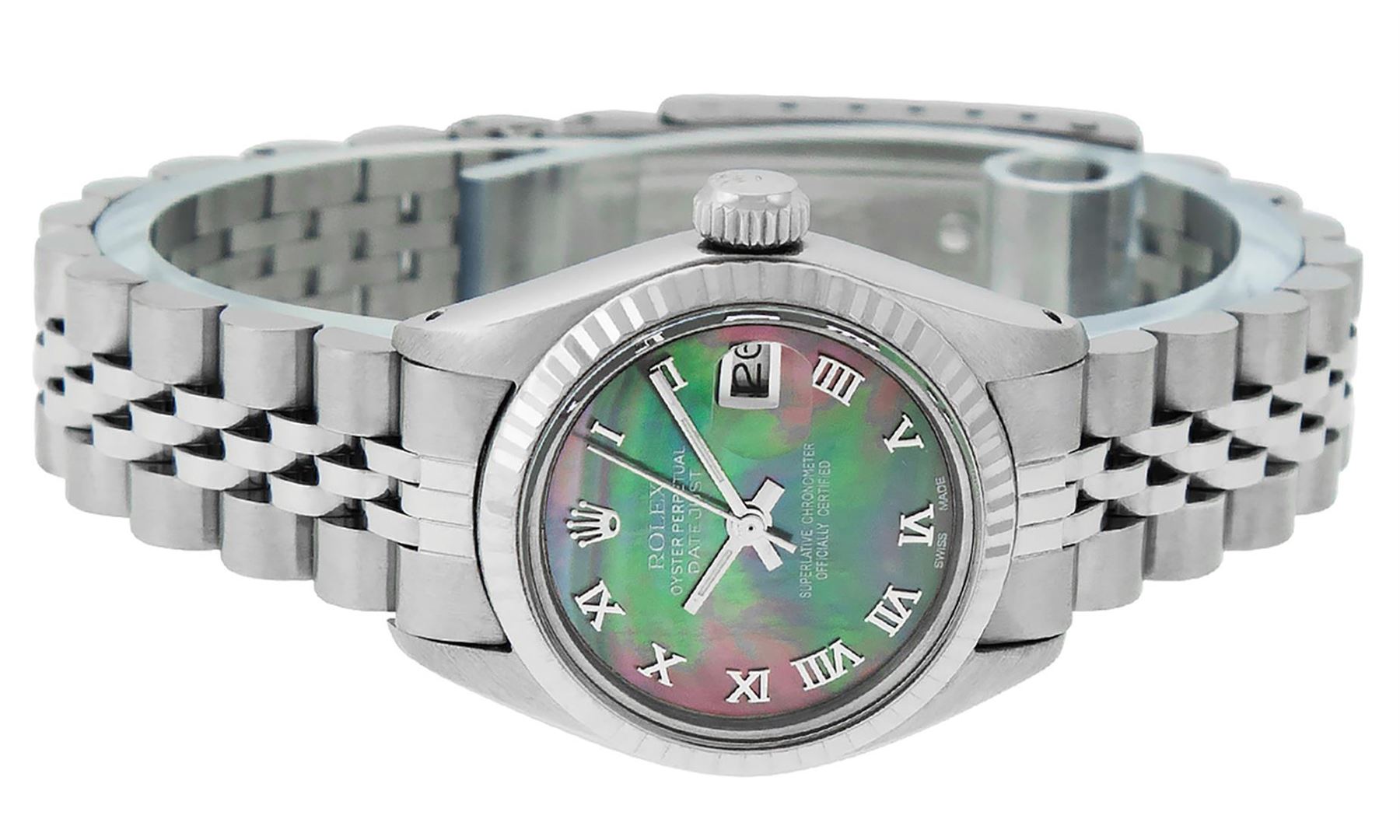 One Ladies Stainless Steel Rolex Datejust Polished Bright with Satin Finish, Serviced & Electronically Tested, Stainless Steel Case: 26mm, Stainless Steel Crown, Bezel: Fluted Bezel. Custom Crystal: New Acrylic Cyclops Lens. Custom Hands: New Luminescent Hands. Movement: Automatic Winding Movement. Dial: Tahitian Mother Of Pearl Roman Dial. Date Window: 3 O'clock Position Date Display, Model: Datejust. Condition: G-6 Extra Fine. Bracelet: Stainless Steel Jubilee Band. Bright Polish & Satin Finish. 6.0 Inch Length, Adjustable. Standard Clasp, With Rolex Logo. This Watch Has Been Serviced Time Tested And Is In Excellent Condition It Is Free Of All Scratches And Dents.