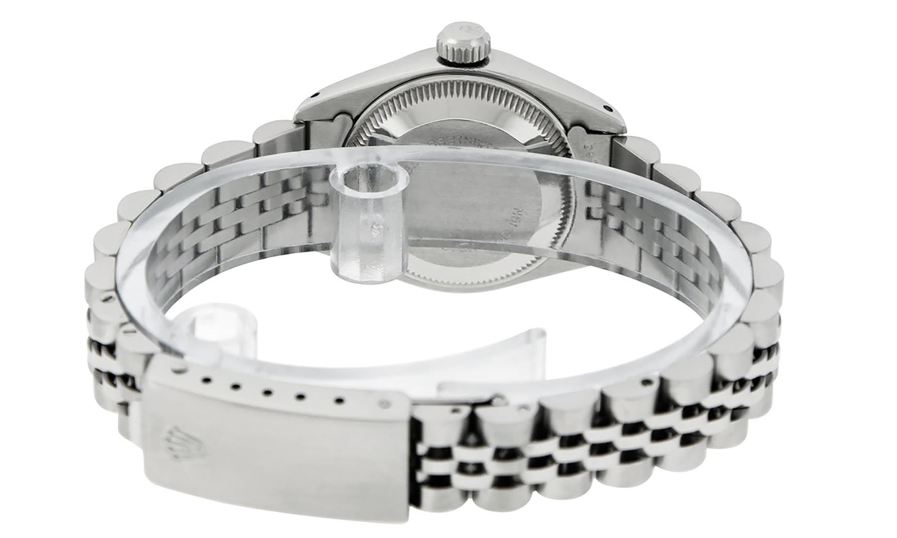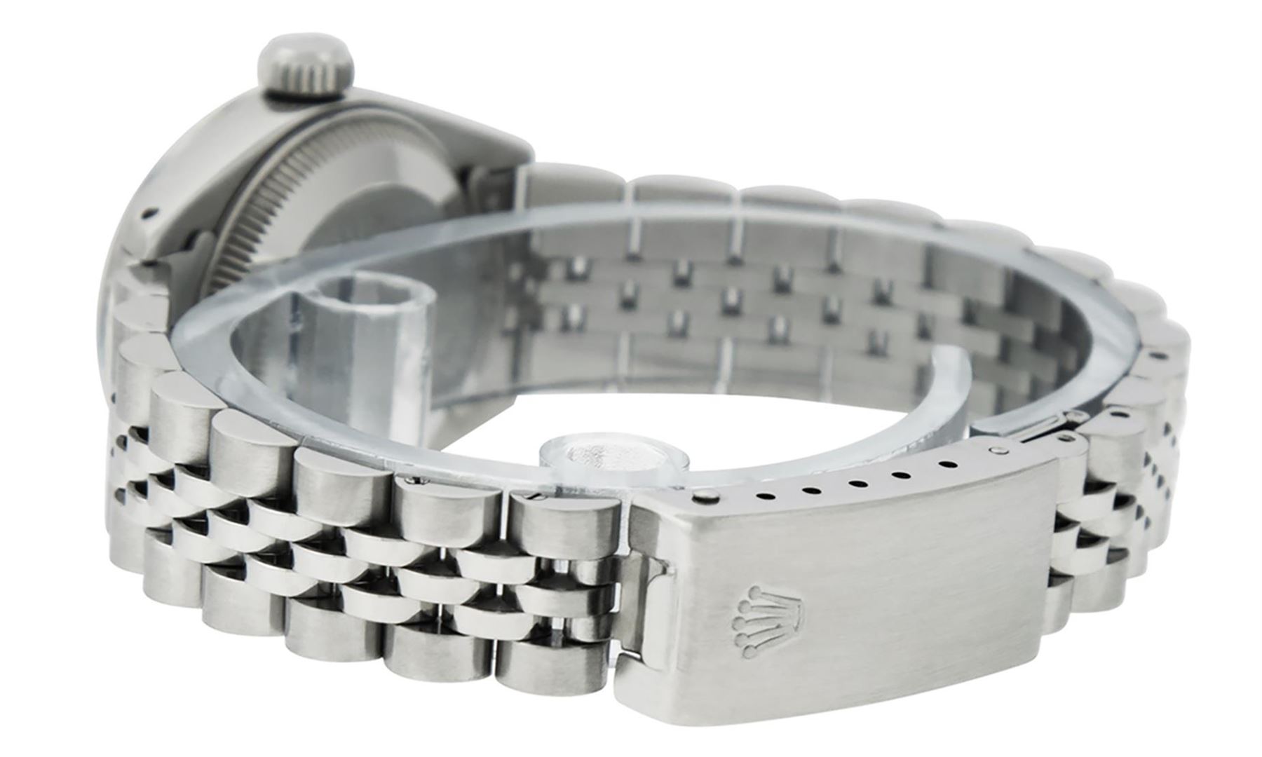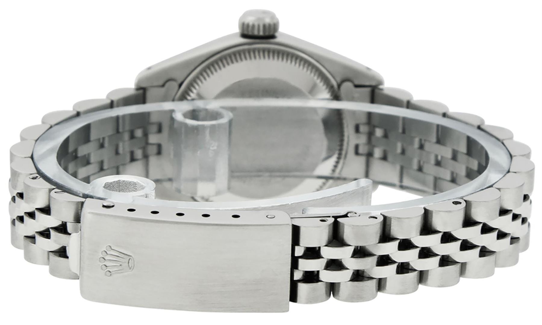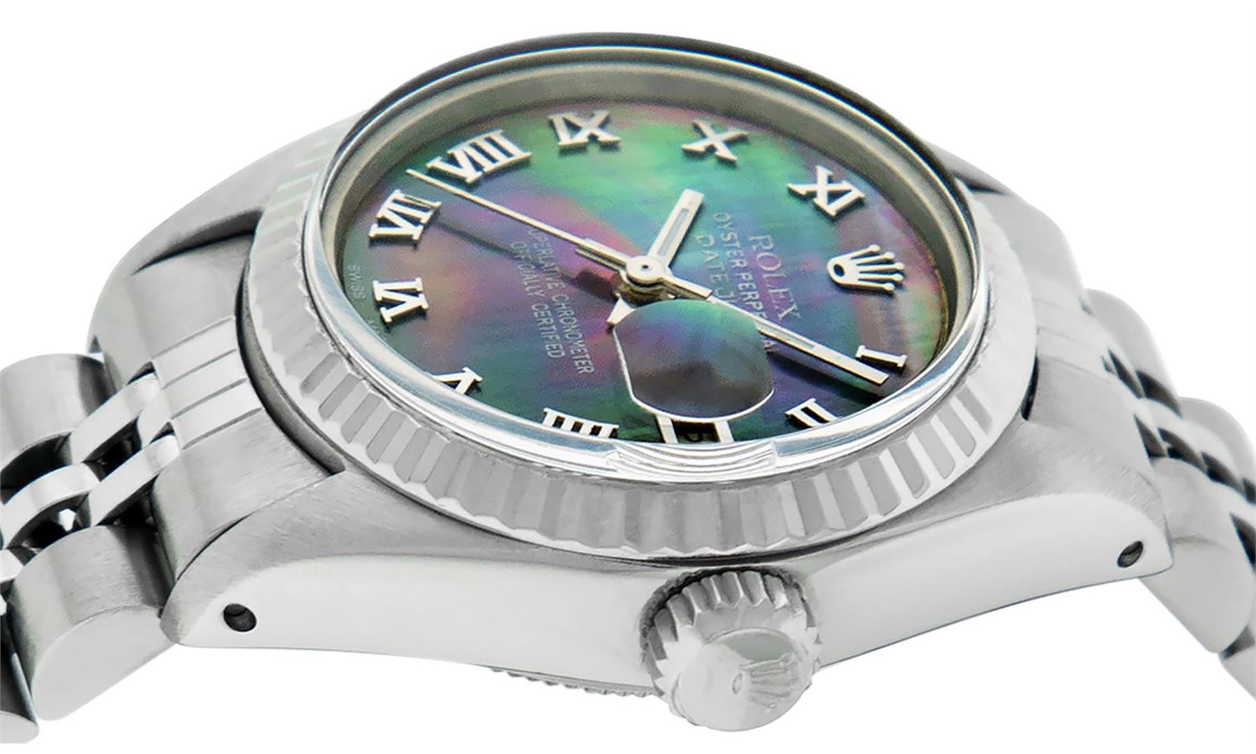 One Ladies Stainless Steel Rolex Datejust Polished Bright with Satin Finish, Serviced & Electronically Tested, Stainless Steel Case: 26mm, Stainless Steel Crown, Bezel: Fluted Bezel. Custom Crystal: New Acrylic Cyclops Lens. Custom Hands: New Luminescent Hands. Movement: Automatic Winding Movement. Dial: Tahitian Mother Of Pearl Roman Dial. Date Window: 3 O'Clock Position Date Display, Model: Datejust. Condition: G-6 Extra Fine. Bracelet: Stainless Steel Jubilee Band. Bright Polish & Satin Finish. 6.0 Inch Length, Adjustable. Standard Clasp, With Rolex Logo. This Watch Has Been Serviced Time Tested And Is In Excellent Condition It Is Free Of All Scratches And Dents.