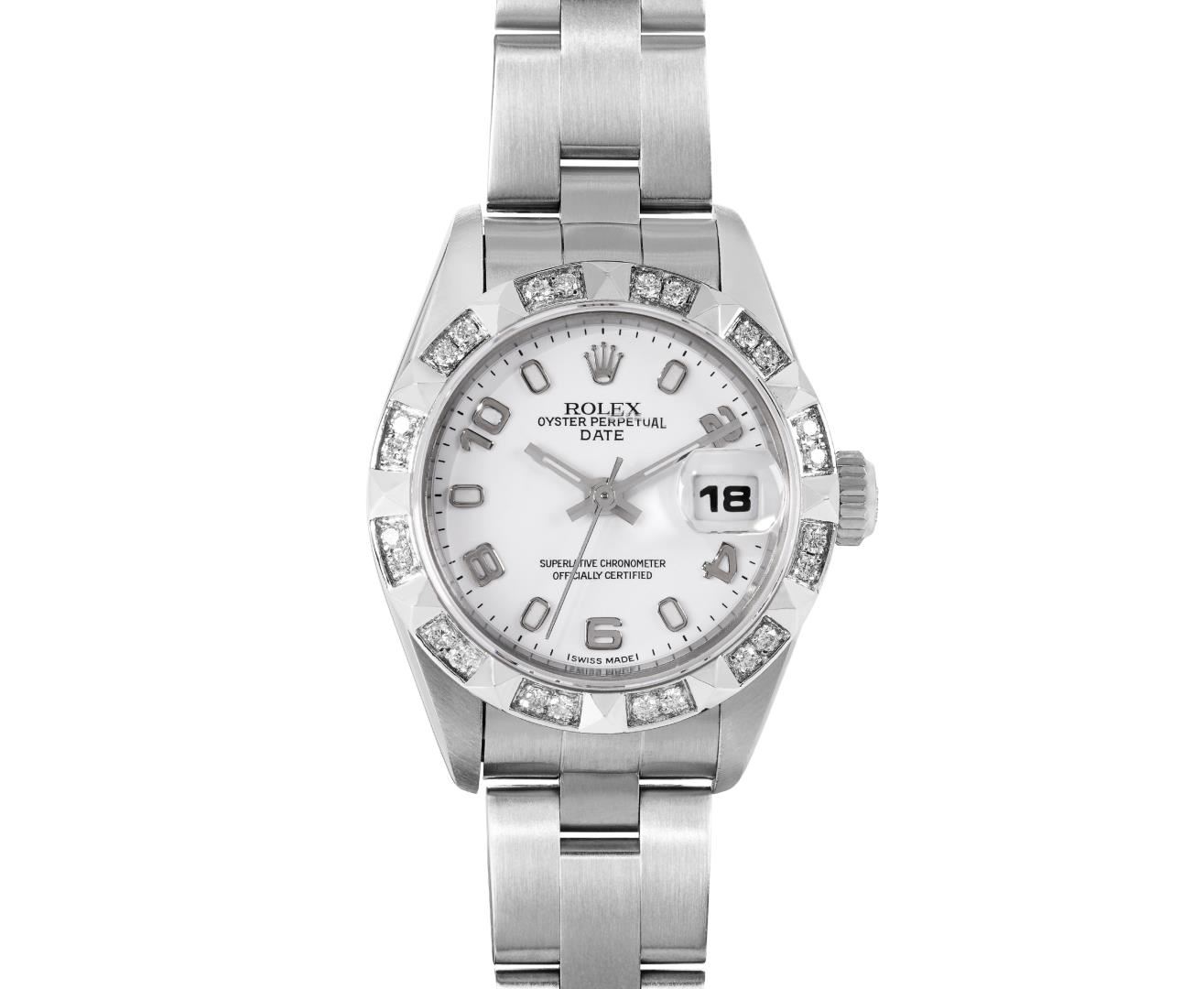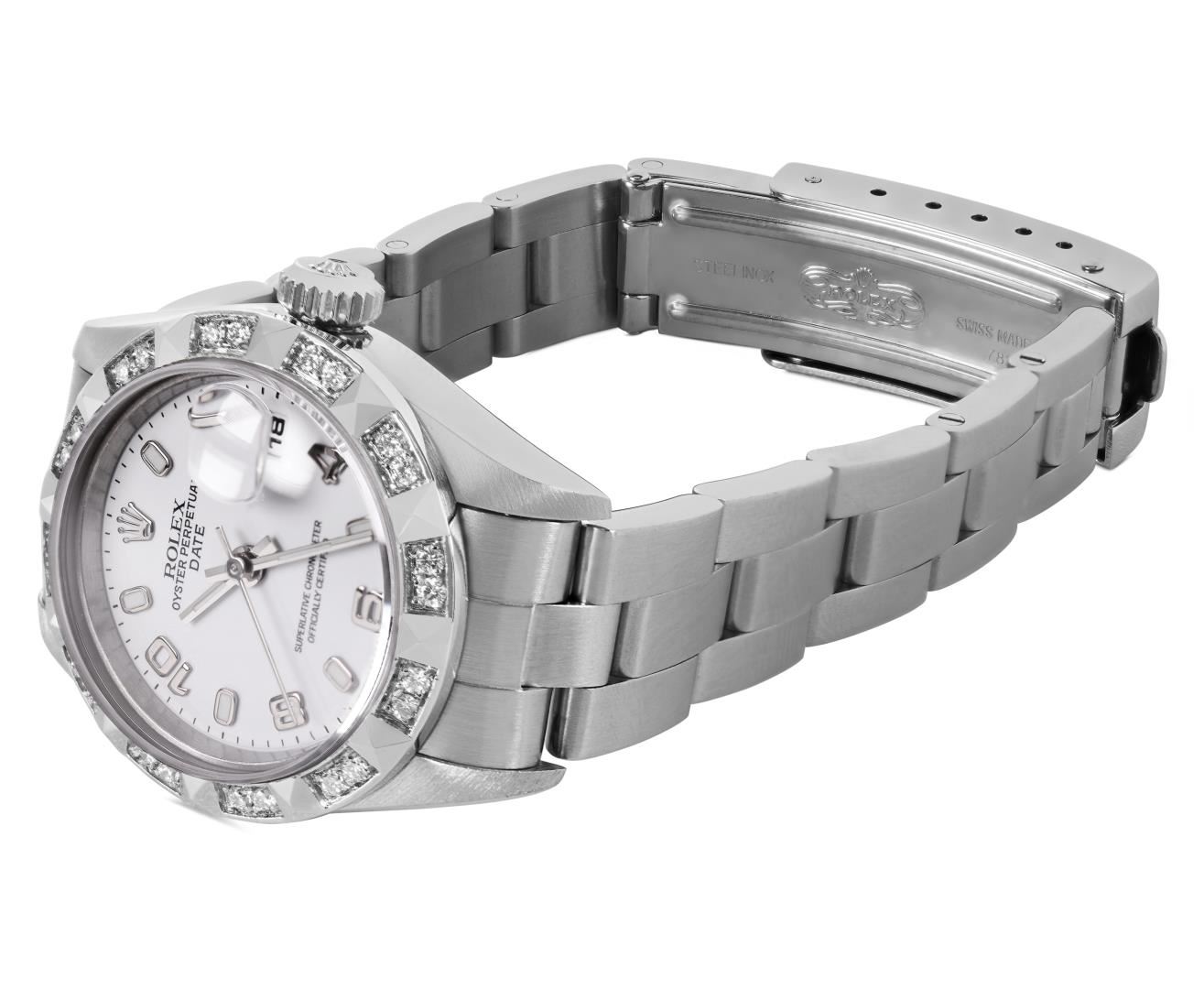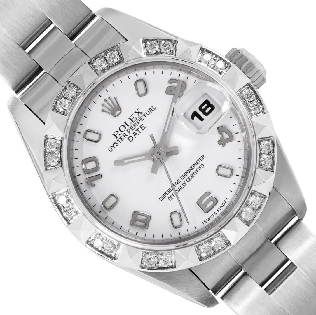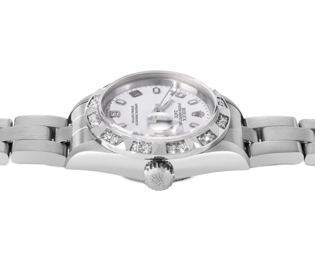 One Rolex Ladies Pre Owned Quickset Stainless Steel Date Wristwatch Polished Bright with Satin Finish, Serviced & Electronically Tested, Stainless Steel Case: 26mm, Stainless Steel Crown, Custom Bezel: New 18K White Gold Pyramid Diamond Bezel, Diamond Count: 24 Diamonds On Bezel. Custom Crystal: New Sapphire With Magnified Date Window. Custom Hands: New Luminescent Hands. Rolex Movement: 2235 Automatic Winding Movement. Rolex Dial: Factory White Arabic Dial With Luminous Index Hour Markers With a Dash Track. Date Window: 3 O'Clock Position Date Display, Model: Quickset Date. Condition: G-6 Extra Fine. Rolex Bracelet: Stainless Steel Oyster Band. Bright Polish And Satin Finish. 6.0 Inch Length, Adjustable. Standard Clasp, With Rolex Logo. This Watch Has Been Serviced Time Tested And Is In Excellent Condition. It Is Free Of All Scratches And Dents. This Watch Comes With A Rolex Box.