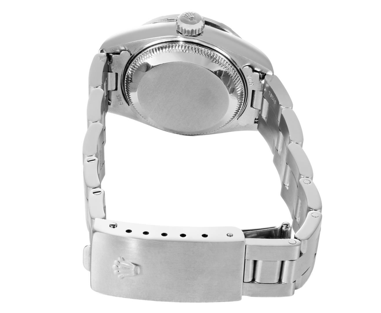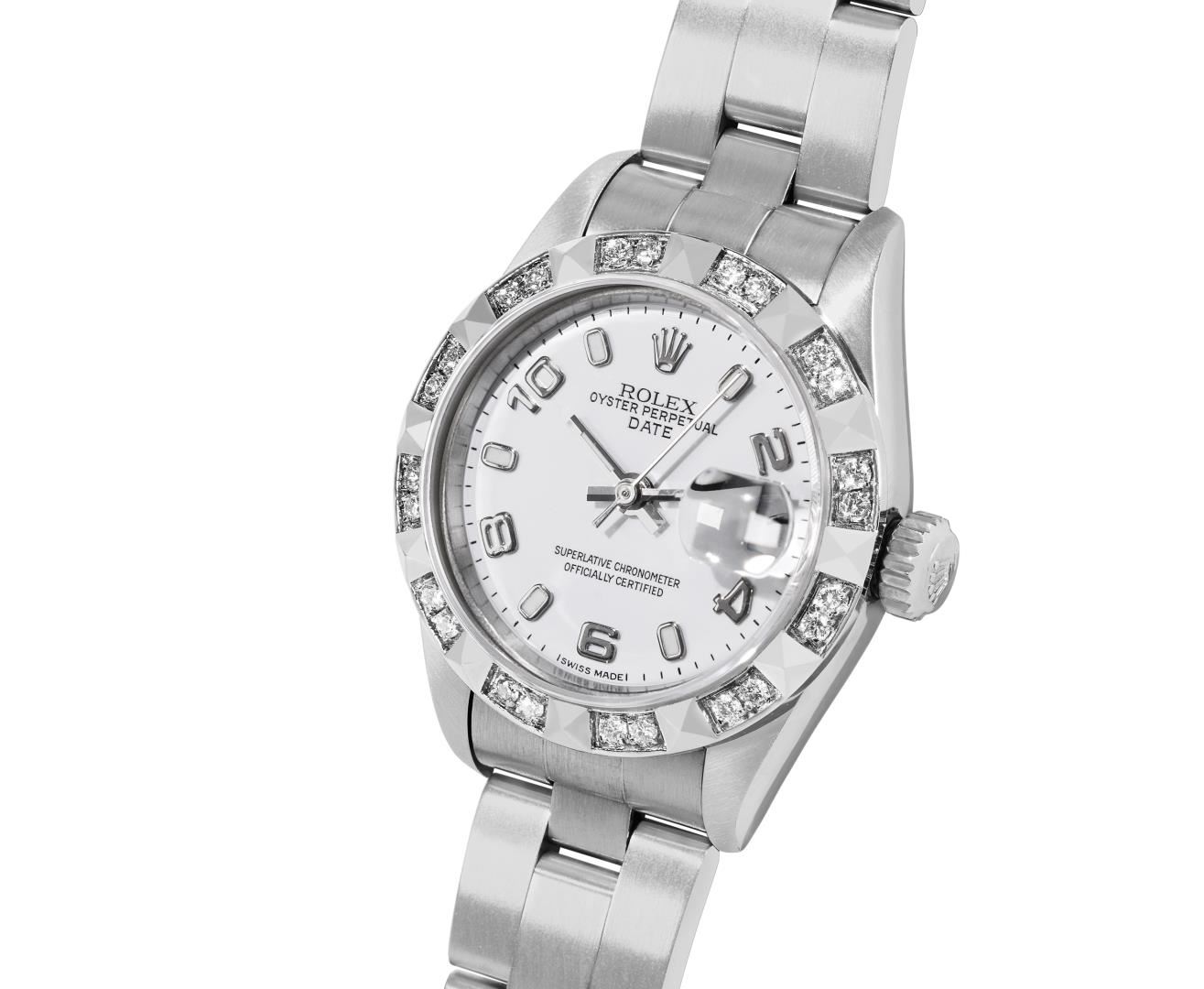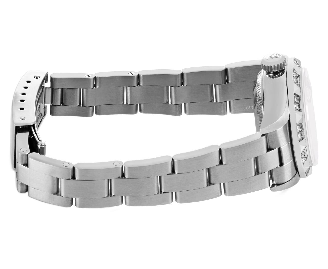 One Rolex Ladies Pre Owned Quickset Stainless Steel Date Wristwatch Polished Bright with Satin Finish, Serviced & Electronically Tested, Stainless Steel Case: 26mm, Stainless Steel Crown, Custom Bezel: New 18K White Gold Pyramid Diamond Bezel, Diamond Count: 24 Diamonds On Bezel. Custom Crystal: New Sapphire With Magnified Date Window. Custom Hands: New Luminescent Hands. Rolex Movement: 2235 Automatic Winding Movement. Rolex Dial: Factory White Arabic Dial With Luminous Index Hour Markers With a Dash Track. Date Window: 3 O'Clock Position Date Display, Model: Quickset Date. Condition: G-6 Extra Fine. Rolex Bracelet: Stainless Steel Oyster Band. Bright Polish And Satin Finish. 6.0 Inch Length, Adjustable. Standard Clasp, With Rolex Logo. This Watch Has Been Serviced Time Tested And Is In Excellent Condition. It Is Free Of All Scratches And Dents. This Watch Comes With A Rolex Box.