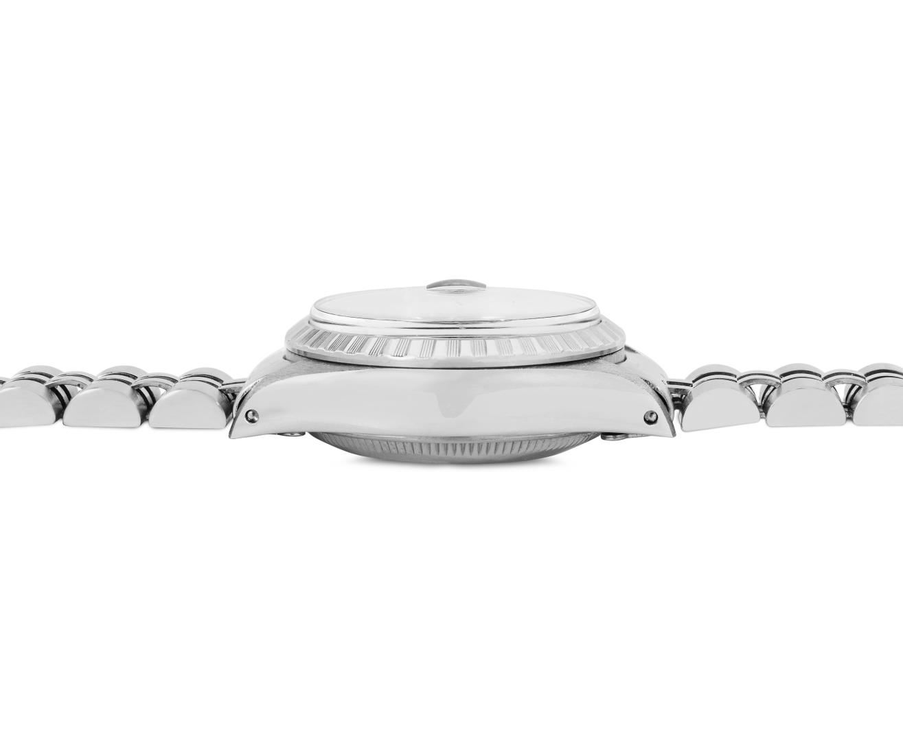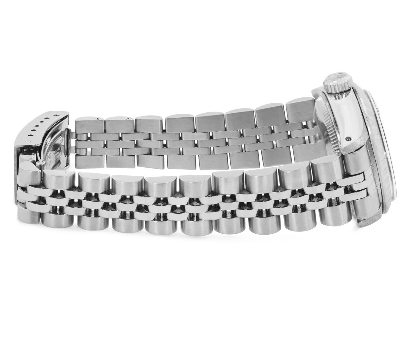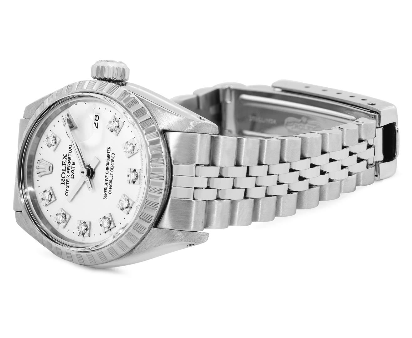 One Rolex Ladies Pre Owned Stainless Steel Date Wristwatch Polished Bright with Satin Finish, Serviced and Electronically Tested, Stainless Steel Case: 26mm, Stainless Steel Crown, Rolex Bezel: Stainless Steel Engine Turn Bezel, Custom Crystal: New Acrylic With Magnifying Date Window. Custom Hands: New Solid Hands. Rolex Movement: Automatic Winding Movement 2035. Custom Dial: Custom White Dial With Added Diamond Hour Markers, Dash Tracks, And Lumi Dots, Diamond Count: 10 Diamonds On Dial. Date Window: 3 O'Clock Position Date Display, Model: Date. Condition: G-6 Extra Fine. Rolex Bracelet: Stainless Steel Jubilee Band. Bright Polish and Satin Finish. 6.0 Inch Length, Adjustable. Standard Clasp, With Rolex Logo. This Watch Has Been Serviced Time Tested And Is In Excellent Condition. It Is Free Of All Scratches And Dents.