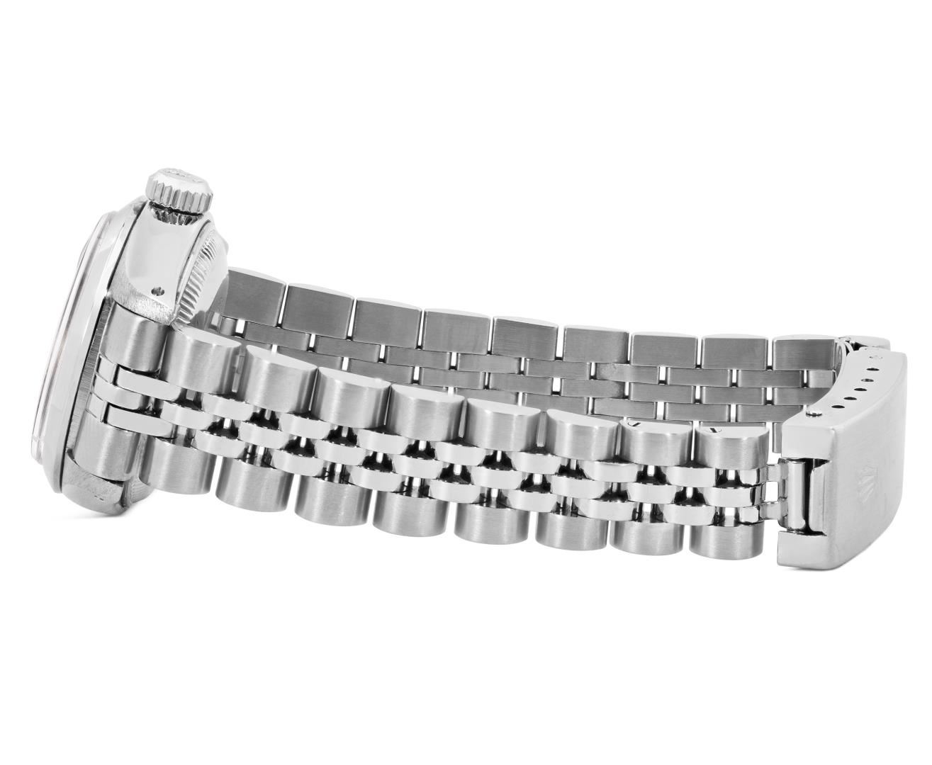 One Rolex Ladies Pre Owned Stainless Steel Date Wristwatch Polished Bright with Satin Finish, Serviced and Electronically Tested, Stainless Steel Case: 26mm, Stainless Steel Crown, Rolex Bezel: Stainless Steel Smooth Bezel, Custom Crystal: New Acrylic With Magnifying Date Window. Custom Hands: New Solid Hands. Rolex Movement: Automatic Winding Movement 2035. Custom Dial: Custom White Dial With Added Diamond Hour Markers, Dash Tracks, And Lumi Dots, Diamond Count: 10 Diamonds On Dial. Date Window: 3 O'Clock Position Date Display, Model: Date. Condition: G-6 Extra Fine. Rolex Bracelet: Stainless Steel Jubilee Band. Bright Polish and Satin Finish. 6.0 Inch Length, Adjustable. Standard Clasp, With Rolex Logo. This Watch Has Been Serviced Time Tested And Is In Excellent Condition. It Is Free Of All Scratches And Dents.