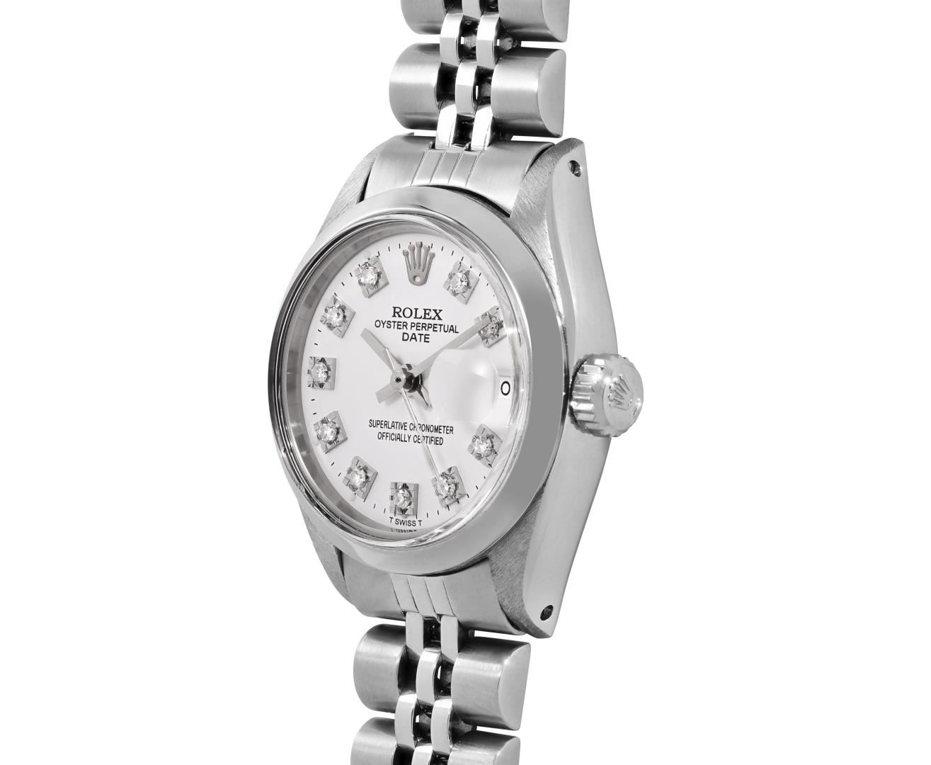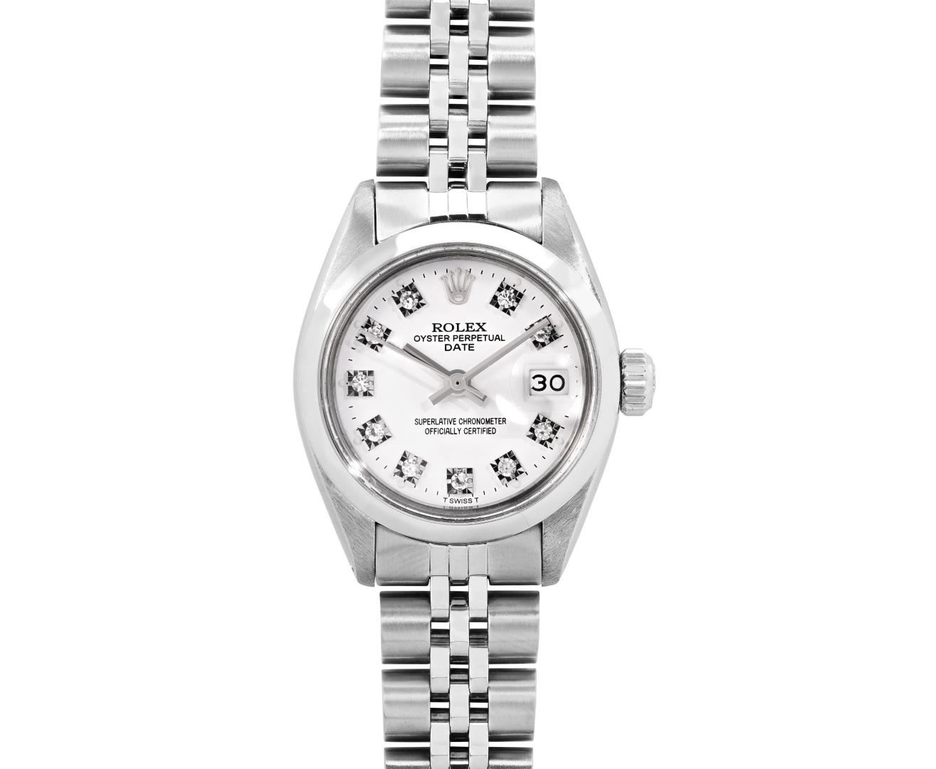 One Rolex Ladies Pre Owned Stainless Steel Date Wristwatch Polished Bright with Satin Finish, Serviced and Electronically Tested, Stainless Steel Case: 26mm, Stainless Steel Crown, Rolex Bezel: Stainless Steel Smooth Bezel, Custom Crystal: New Acrylic With Magnifying Date Window. Custom Hands: New Solid Hands. Rolex Movement: Automatic Winding Movement 2035. Custom Dial: Custom White Dial With Added Diamond Hour Markers, Dash Tracks, And Lumi Dots, Diamond Count: 10 Diamonds On Dial. Date Window: 3 O'Clock Position Date Display, Model: Date. Condition: G-6 Extra Fine. Rolex Bracelet: Stainless Steel Jubilee Band. Bright Polish and Satin Finish. 6.0 Inch Length, Adjustable. Standard Clasp, With Rolex Logo. This Watch Has Been Serviced Time Tested And Is In Excellent Condition. It Is Free Of All Scratches And Dents.