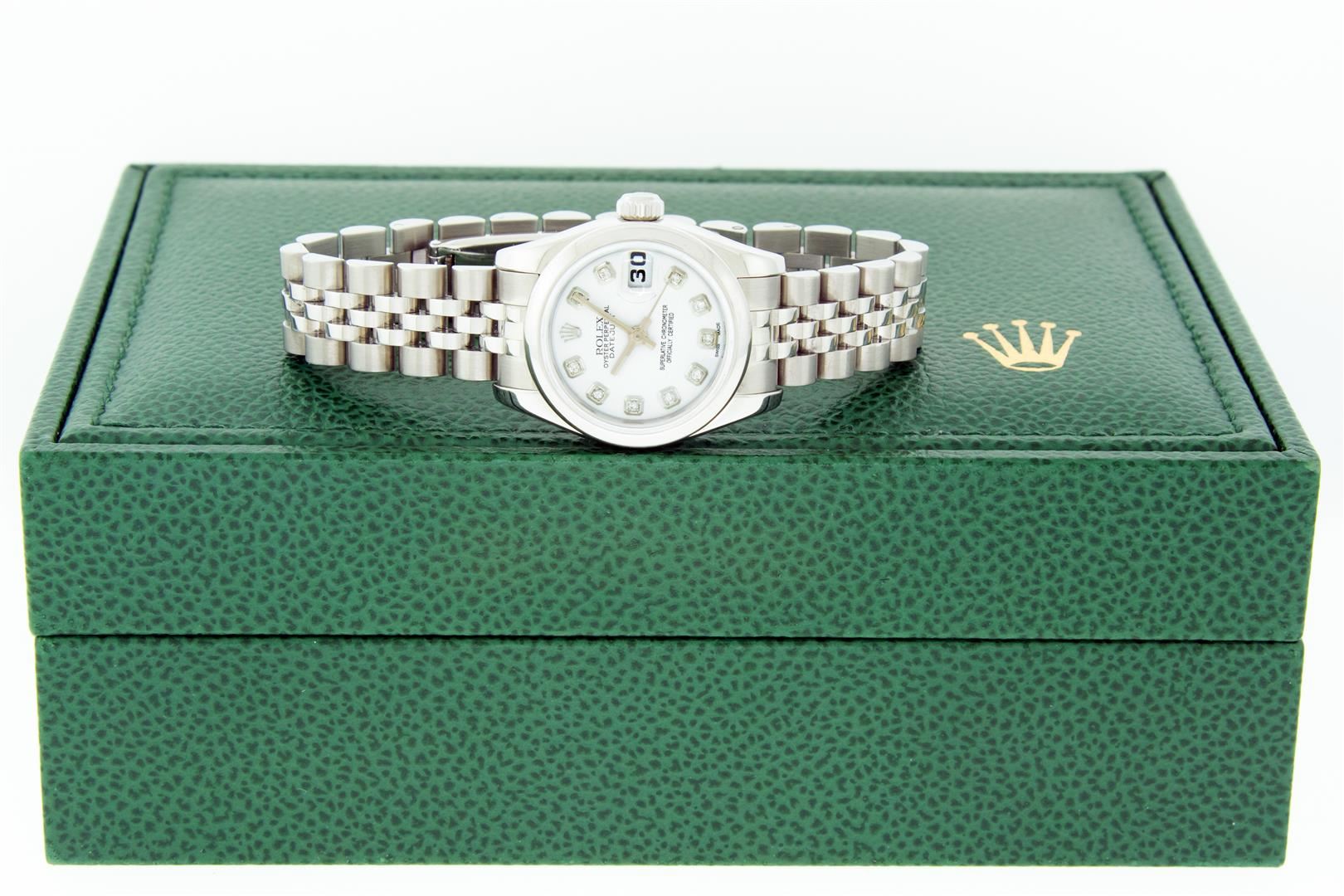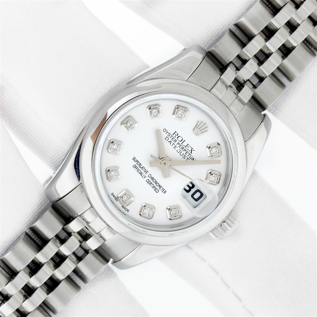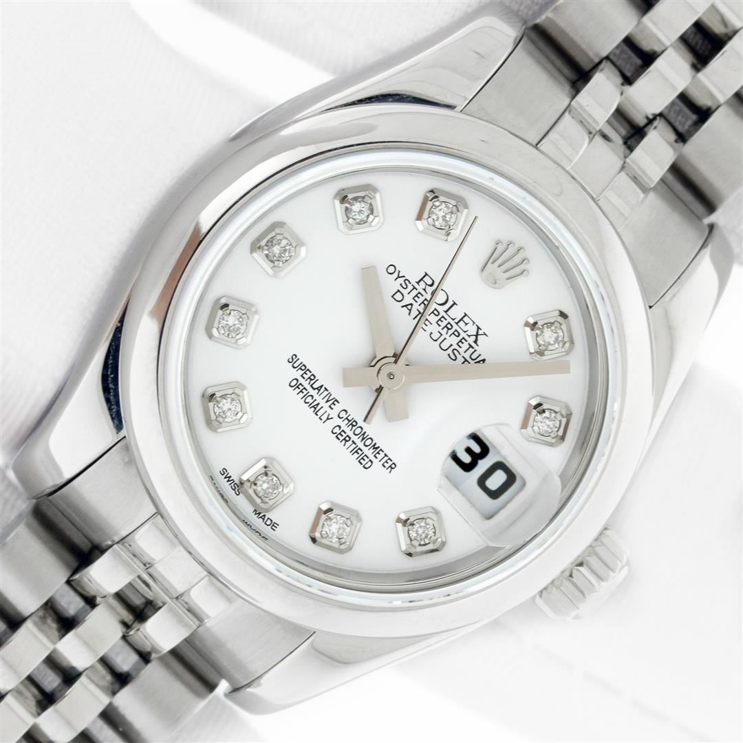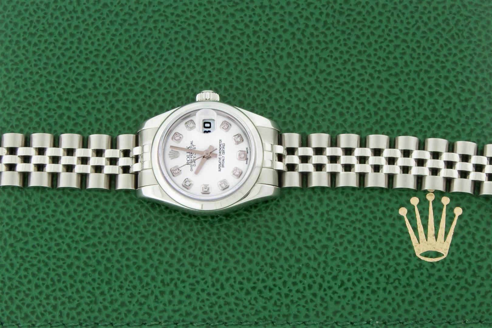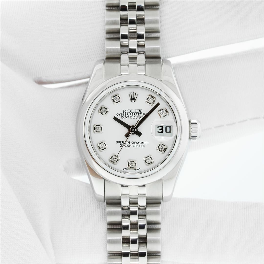 One Ladies Pre Owned Quickset Stainless Steel Rolex Datejust Polished Bright with Satin Finish, Serviced & Electronically Tested, Rolex Stainless Steel Case: 26mm, Rolex Stainless Steel Crown, Rolex Bezel: Stainless Steel Smooth Bezel. Rolex Crystal: Scratch Resistant Sapphire Cyclops Lens. Rolex Hands: Luminescent Hands. Rolex Movement: Automatic Winding Movement. Custom Dial: Refinished To White With Custom Added Genuine Single Cut VS Diamonds, Diamond Count: 10 Single Cut Diamonds In Dial, Color: G to H, Clarity: VS. Date Window: 3 O'clock Position Date Display, Model: Quickset Datejust. Condition: G-6 Extra Fine. Rolex Bracelet: Stainless Steel Jubilee Band. Bright Polish & Satin Finish. 6.0 Inch Length, Adjustable. Standard Clasp, With Rolex Logo. This Watch Has Been Serviced Time Tested And Is In Excellent Condition It Is Free Of All Scratches And Dents. This Watch Includes A Rolex Box.