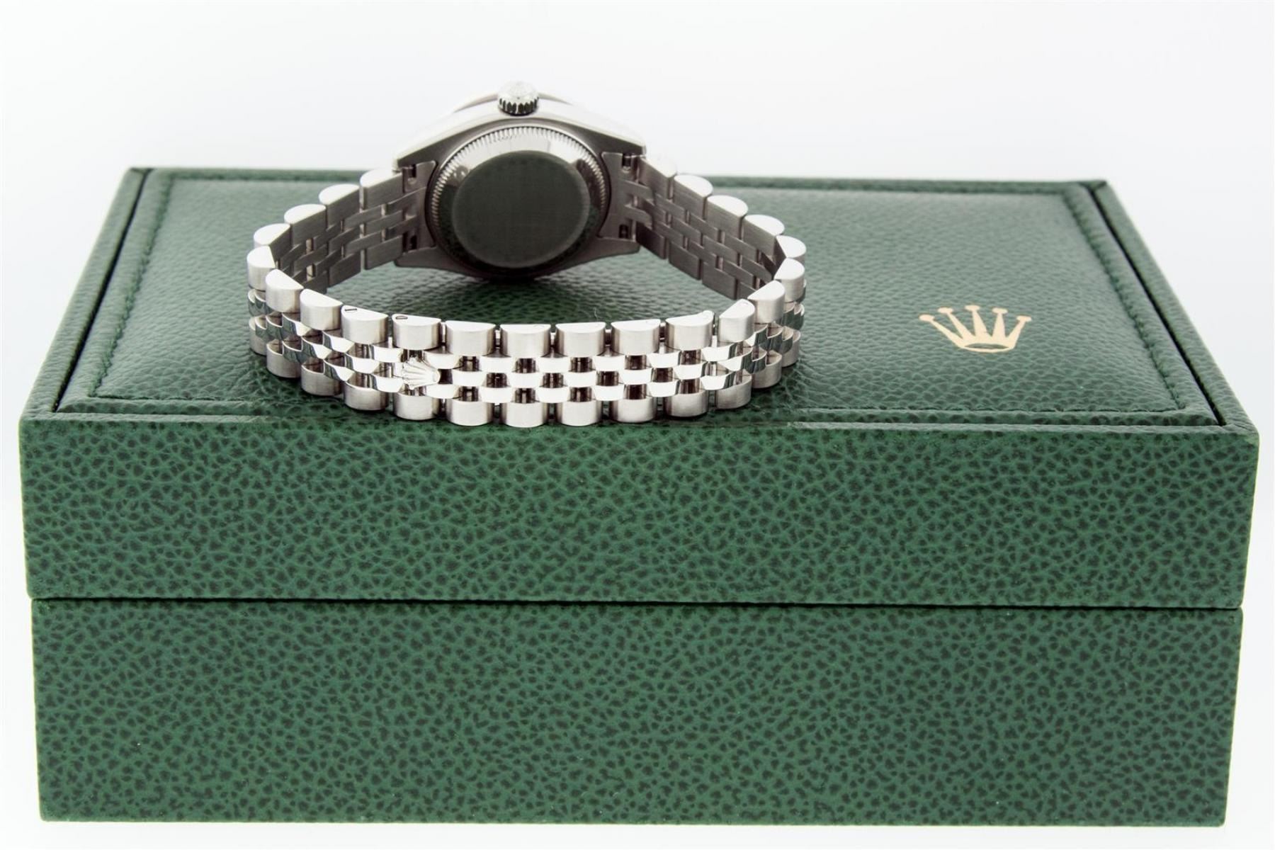 One Ladies Stainless Steel Rolex Datejust Polished Bright with Satin Finish, Serviced & Electronically Tested, Stainless Steel Case: 26mm, Stainless Steel Crown, Custom Bezel: New 18K White Gold Sapphire Channel Set Diamond Bezel, Diamond + Gem Count: 36 Diamonds + 4 Rubies Total Weight 1.00 Carat, Clarity: SI-VS, Color: G to H. Custom Crystal: New Synthetic Sapphire Cyclops Lens. Custom Hands: New Luminescent Hands. Movement: Automatic Winding Movement . Custom Dial: Refinished White Dial With Diamond Hour Markers. Date Window: 3 O'Clock Position Date Display, Model: Datejust. Condition: G-6 Extra Fine. Bracelet: Stainless Steel Jubilee. Bright Polish & Satin Finish. 6.0 Inch Length, Adjustable. Standard Clasp, With Rolex Logo. This Watch Has Been Serviced Time Tested And Is In Excellent Condition It Is Free Of All Scratches And Dents.