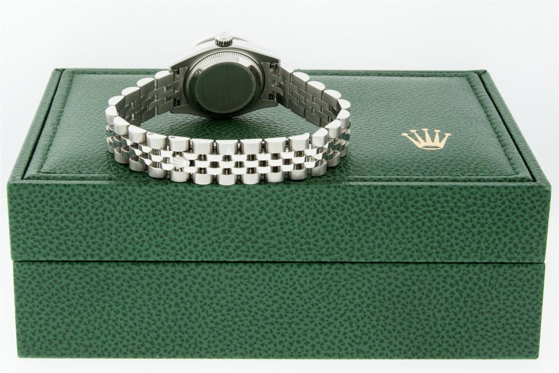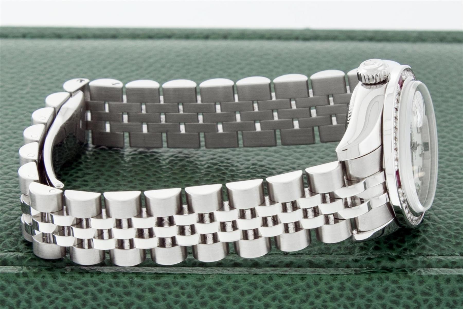 One Ladies Stainless Steel Rolex Datejust Polished Bright with Satin Finish, Serviced & Electronically Tested, Stainless Steel Case: 26mm, Stainless Steel Crown, Custom Bezel: New 18K White Gold Sapphire Channel Set Diamond Bezel, Diamond + Gem Count: 36 Diamonds + 4 Rubies Total Weight 1.00 Carat, Clarity: SI-VS, Color: G to H. Custom Crystal: New Synthetic Sapphire Cyclops Lens. Custom Hands: New Luminescent Hands. Movement: Automatic Winding Movement . Custom Dial: Refinished White Dial With Diamond Hour Markers. Date Window: 3 O'Clock Position Date Display, Model: Datejust. Condition: G-6 Extra Fine. Bracelet: Stainless Steel Jubilee. Bright Polish & Satin Finish. 6.0 Inch Length, Adjustable. Standard Clasp, With Rolex Logo. This Watch Has Been Serviced Time Tested And Is In Excellent Condition It Is Free Of All Scratches And Dents.