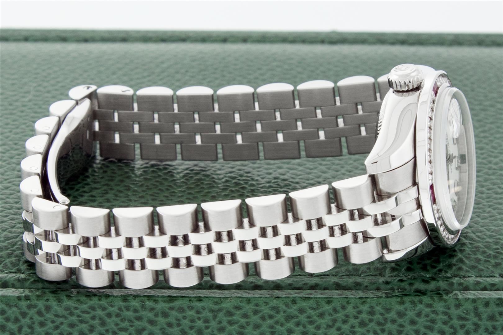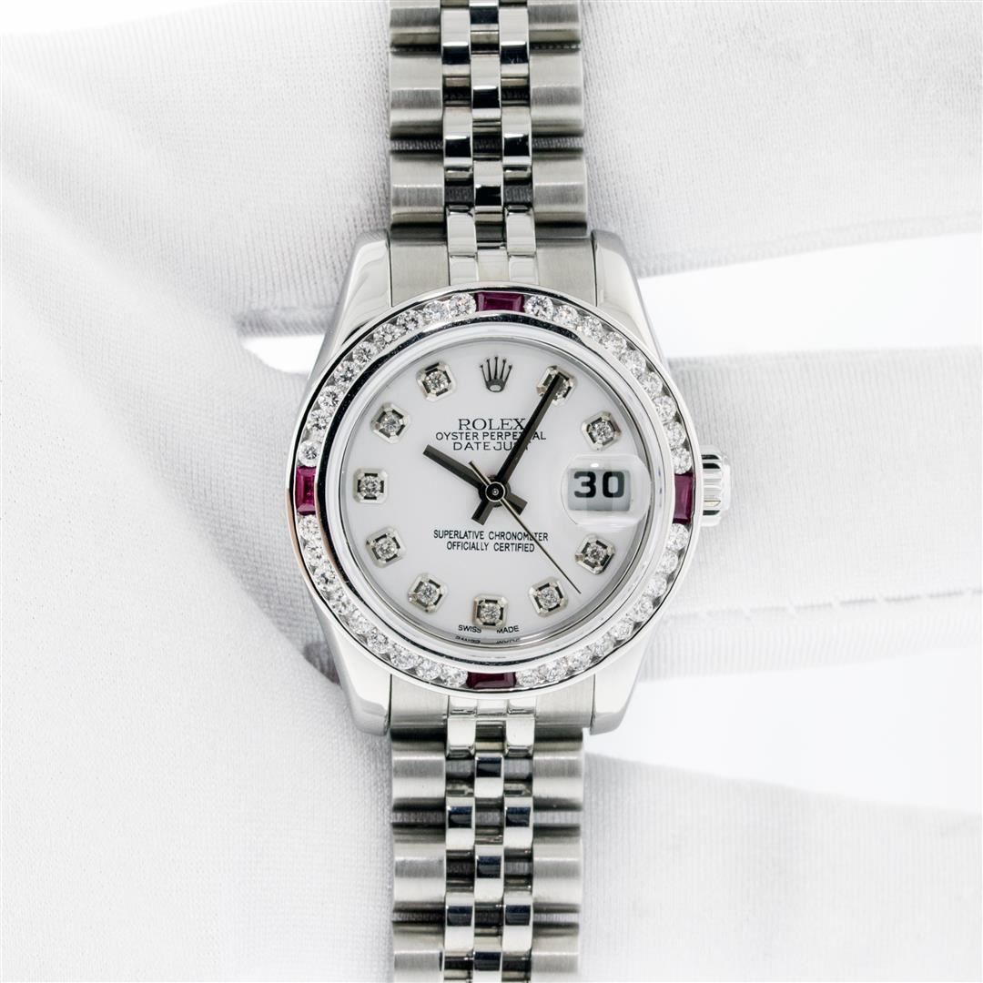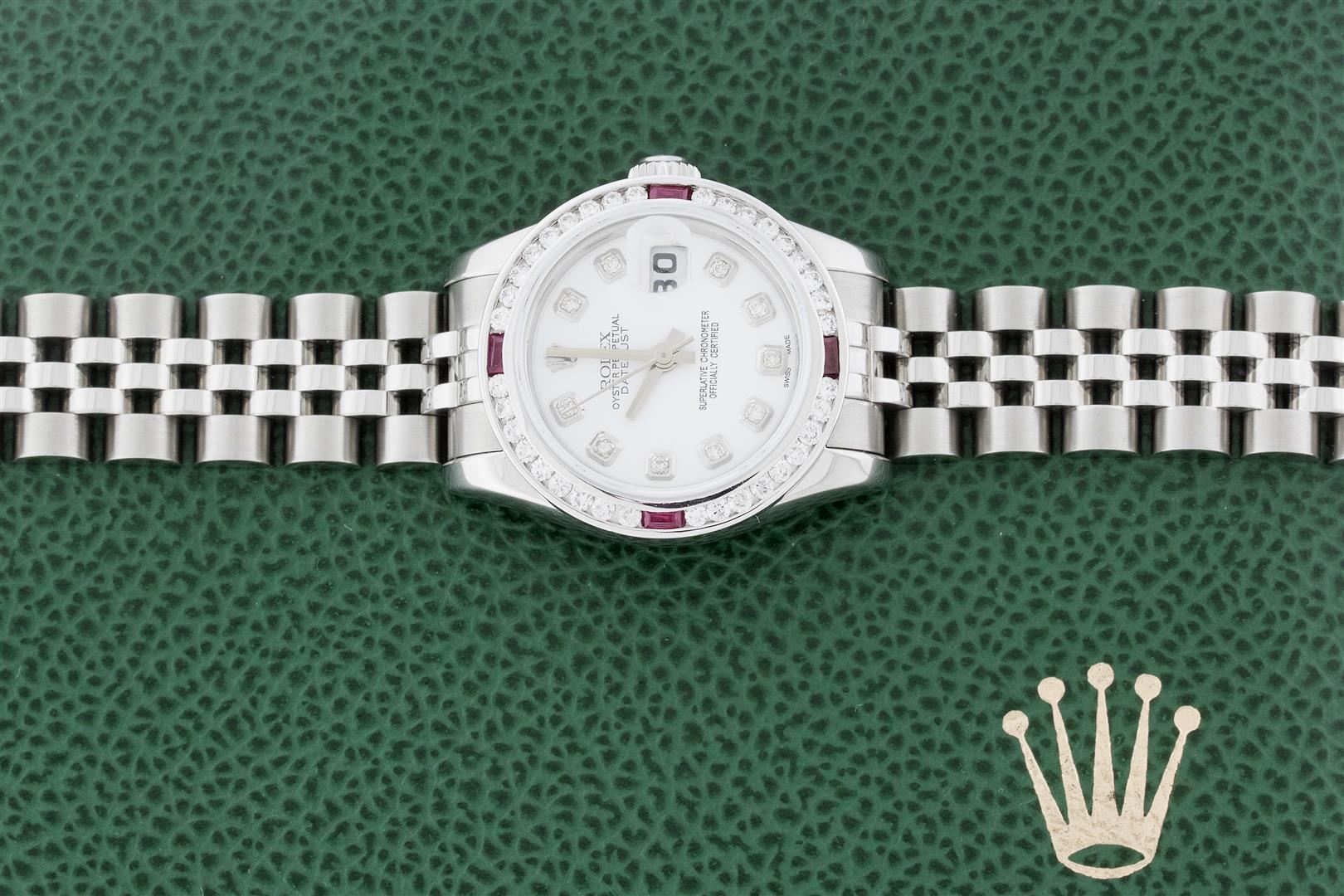 One Ladies Stainless Steel Rolex Datejust Polished Bright with Satin Finish, Serviced & Electronically Tested, Stainless Steel Case: 26mm, Stainless Steel Crown, Custom Bezel: New 18K White Gold Sapphire Channel Set Diamond Bezel, Diamond + Gem Count: 36 Diamonds + 4 Rubies Total Weight 1.00 Carat, Clarity: SI-VS, Color: G to H. Custom Crystal: New Synthetic Sapphire Cyclops Lens. Custom Hands: New Luminescent Hands. Movement: Automatic Winding Movement . Custom Dial: Refinished White Dial With Diamond Hour Markers. Date Window: 3 O'Clock Position Date Display, Model: Datejust. Condition: G-6 Extra Fine. Bracelet: Stainless Steel Jubilee. Bright Polish & Satin Finish. 6.0 Inch Length, Adjustable. Standard Clasp, With Rolex Logo. This Watch Has Been Serviced Time Tested And Is In Excellent Condition It Is Free Of All Scratches And Dents.