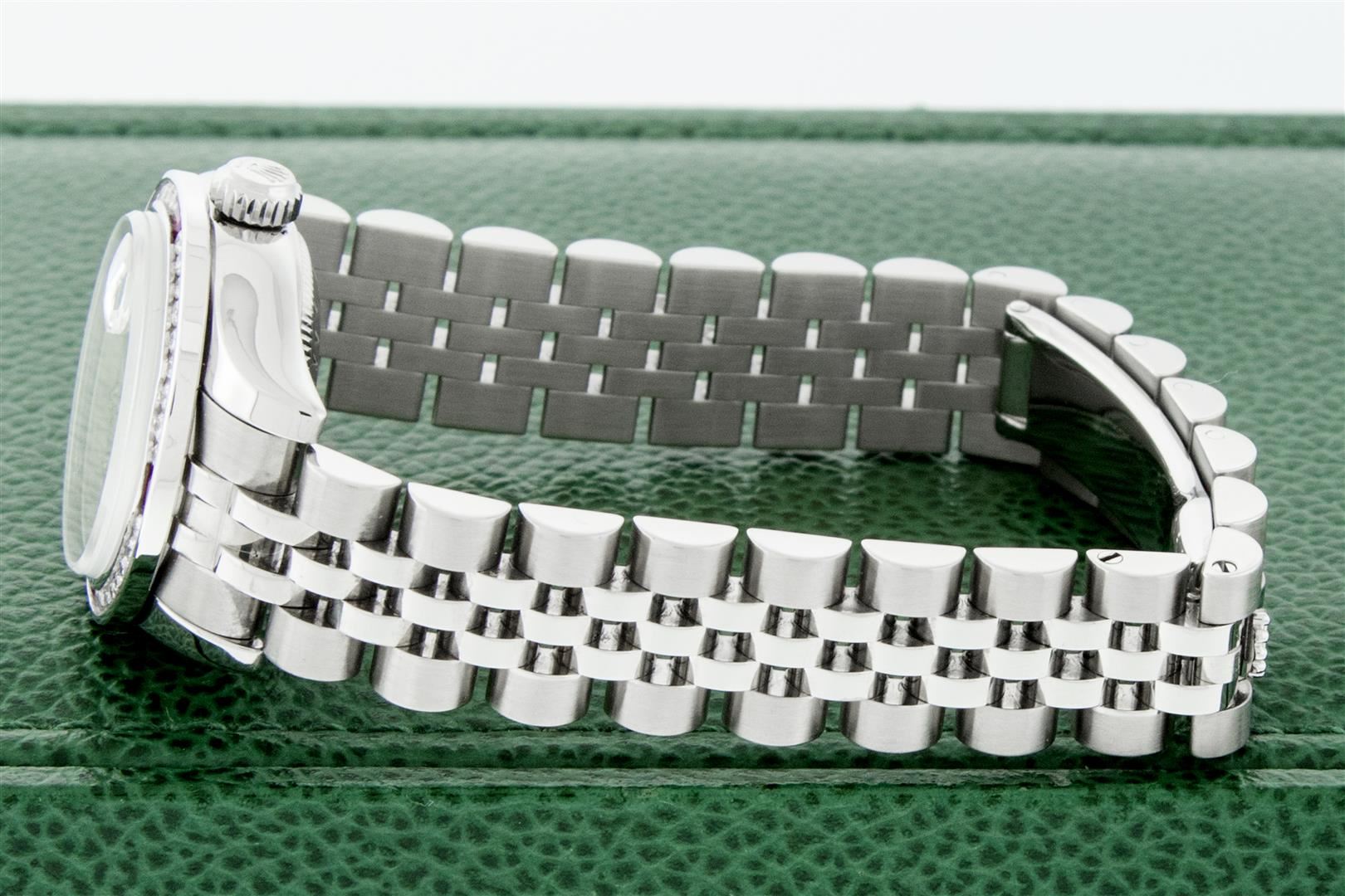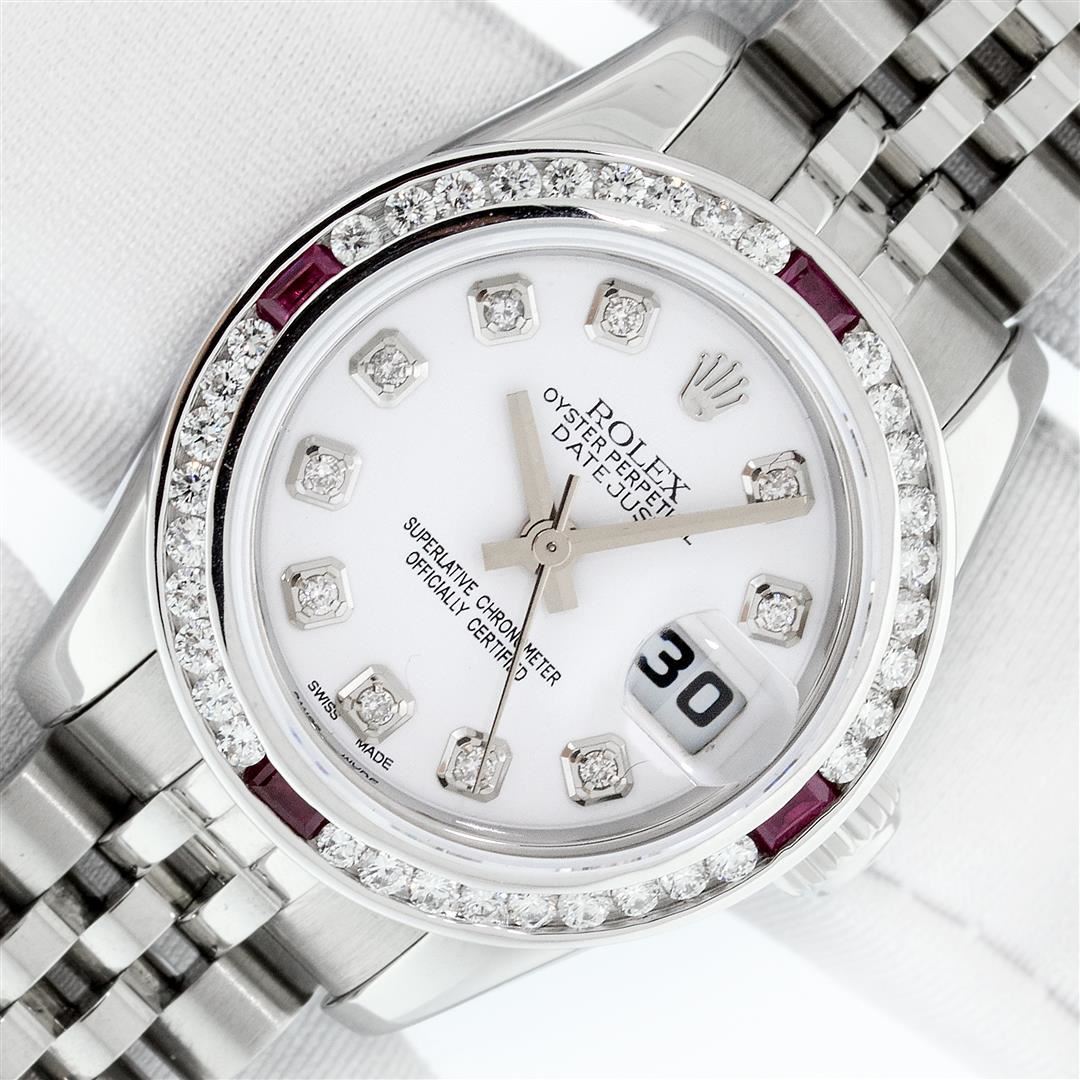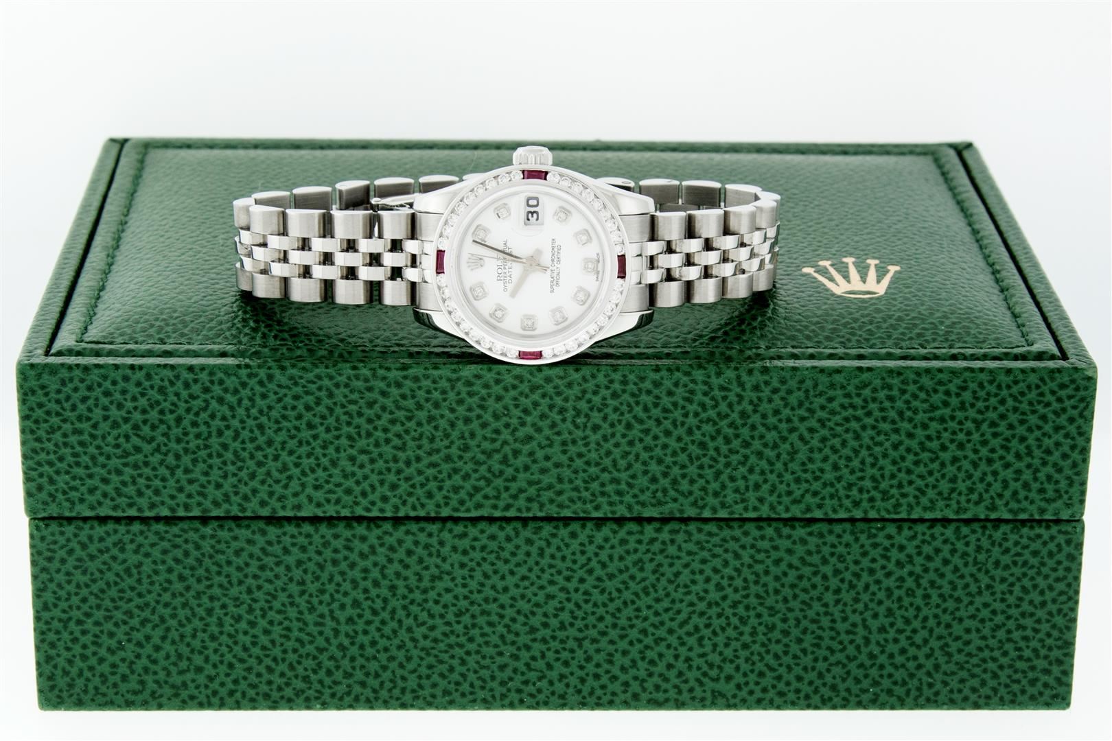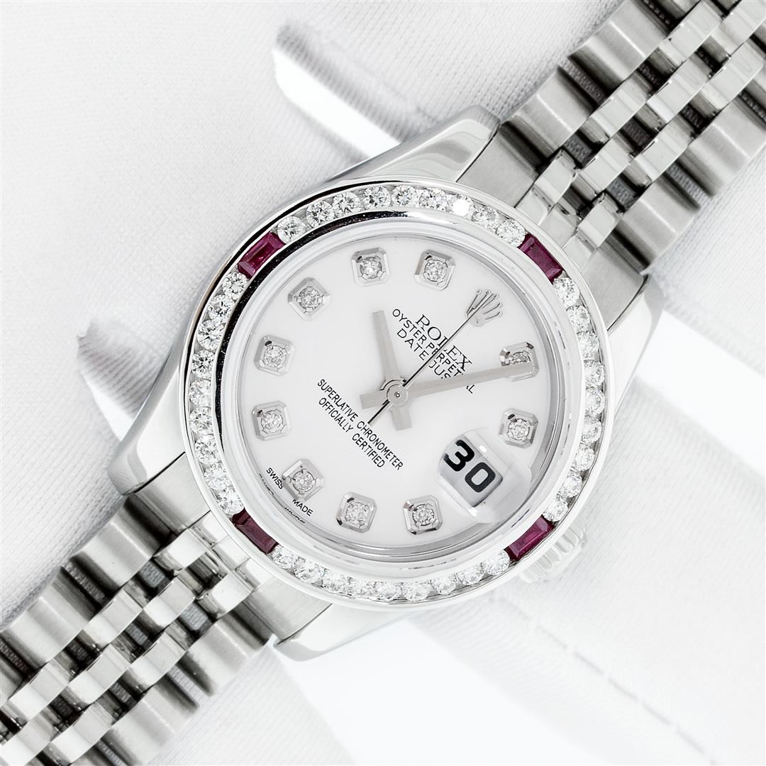 One Ladies Stainless Steel Rolex Datejust Polished Bright with Satin Finish, Serviced & Electronically Tested, Stainless Steel Case: 26mm, Stainless Steel Crown, Custom Bezel: New 18K White Gold Sapphire Channel Set Diamond Bezel, Diamond + Gem Count: 36 Diamonds + 4 Rubies Total Weight 1.00 Carat, Clarity: SI-VS, Color: G to H. Custom Crystal: New Synthetic Sapphire Cyclops Lens. Custom Hands: New Luminescent Hands. Movement: Automatic Winding Movement . Custom Dial: Refinished White Dial With Diamond Hour Markers. Date Window: 3 O'Clock Position Date Display, Model: Datejust. Condition: G-6 Extra Fine. Bracelet: Stainless Steel Jubilee. Bright Polish & Satin Finish. 6.0 Inch Length, Adjustable. Standard Clasp, With Rolex Logo. This Watch Has Been Serviced Time Tested And Is In Excellent Condition It Is Free Of All Scratches And Dents.