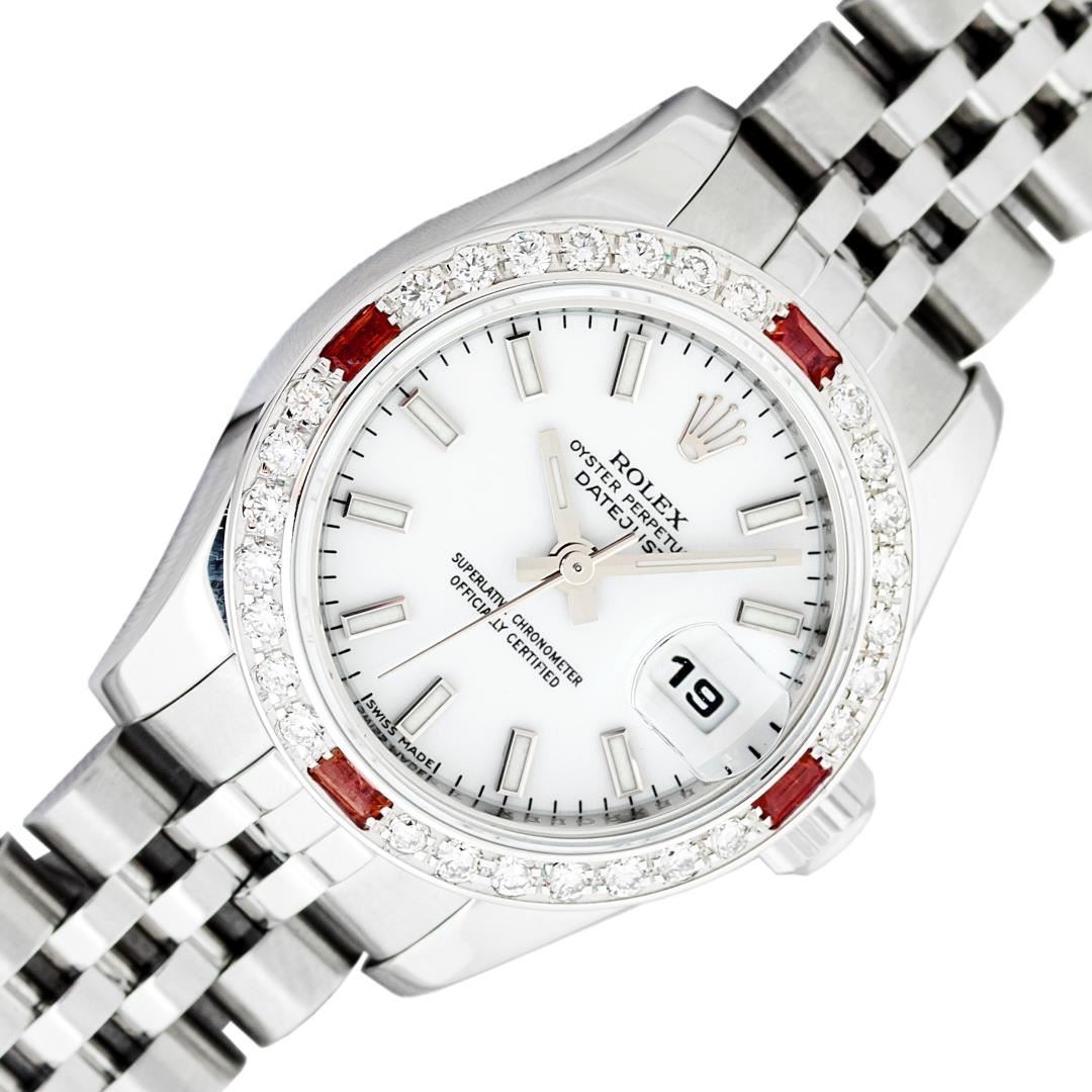 One Ladies Pre Owned Quickset Sapphire Stainless Steel Rolex Datejust Polished Bright with Satin Finish, Serviced & Electronically Tested, Rolex Stainless Steel Case: 26mm, Rolex Stainless Steel Crown, Custom Bezel: New 18K White Gold Diamond & Ruby Bezel, Stone Count: 28 Diamonds + 4 Rubies. Crystal: Sapphire With Magnified Date Window. Hands: Luminescent Hands. Rolex Movement: Automatic Winding Movement 2235. Rolex Dial: White Index With Dash Track. Date Window: 3 O'Clock Position Date Display, Model: Quickset Datejust. Condition: G-6 Extra Fine. Rolex Bracelet: Stainless Steel Jubilee Band. Bright Polish & Satin Finish. 6.0 Inch Length, Adjustable. Hidden Clap, With Rolex Logo. This Watch Has Been Serviced Time Tested And Is In Excellent Condition It Is Free Of All Scratches And Dents.