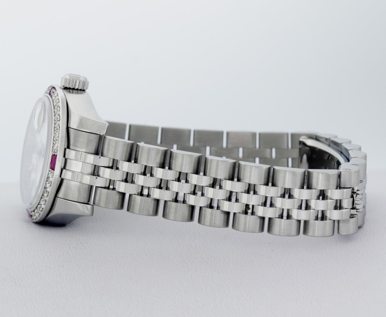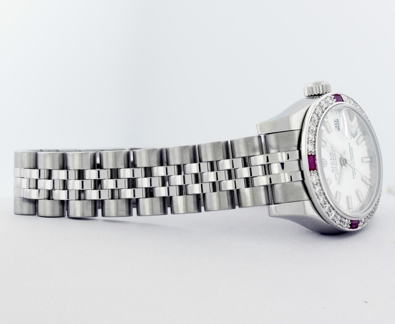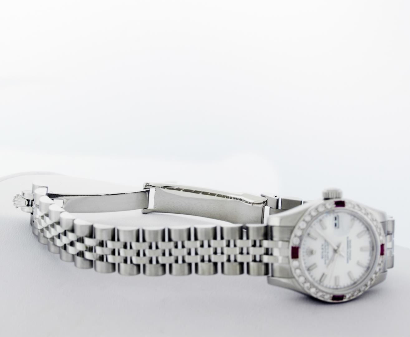 One Ladies Pre Owned Quickset Stainless Steel Rolex Datejust Polished Bright with Satin Finish, Serviced & Electronically Tested, Rolex Stainless Steel Case: 26mm. Rolex Stainless Steel Crown, Custom Bezel: New 18K White Gold Beadset And Ruby Bezel, Stone Count: 28 Diamonds + 4 Rubies, Diamond Color: G To H, Clarity: SI-VS. Crystal: Sapphire With Magnified Date Window. Hands: Lumi Hands. Rolex Movement: Quickset Automatic Winding Movement 2235. Rolex Dial: White Index With Dash Track. Date Window: 3 O'Clock Position Date Display, Model: Sapphire Quickset Datejust. Condition: G-6 Extra Fine. Rolex Bracelet: Stainless Steel Jubilee Band With Hidden Clasp. Bright Polish & Satin Finish. 6.0 Inch Length, Adjustable. Hidden Clasp, With Rolex Logo. This Watch Has Been Serviced Time Tested And Is In Excellent Condition It Is Free Of All Scratches And Dents.