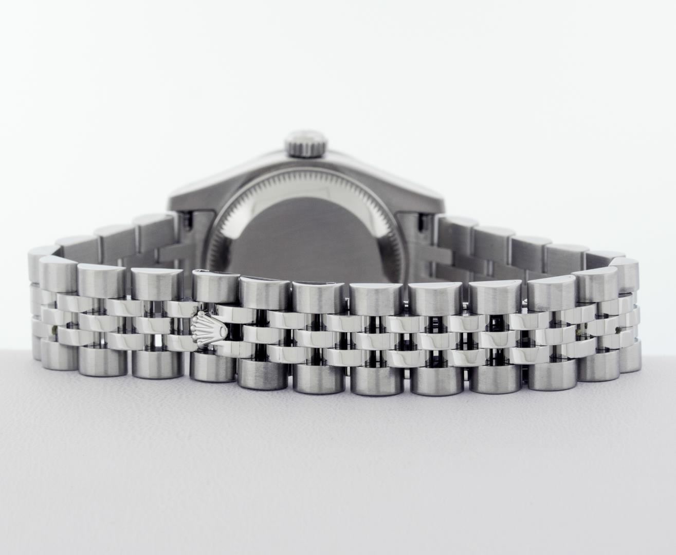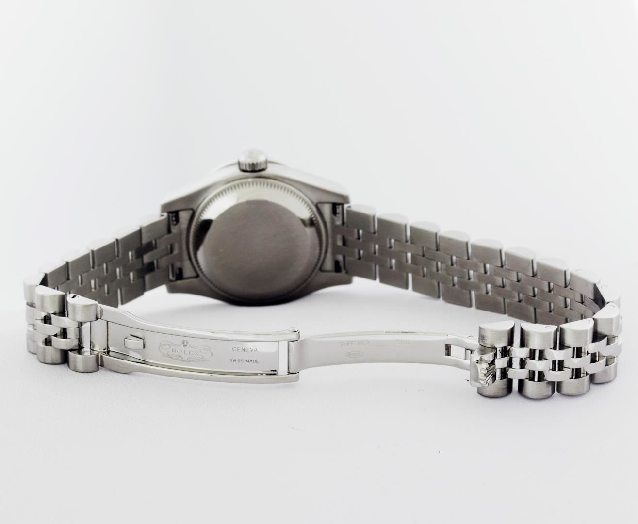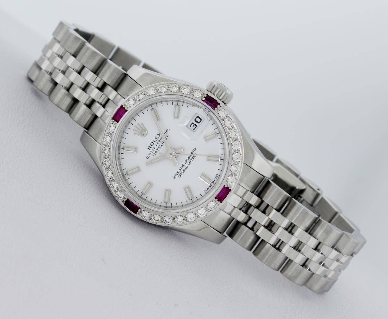 One Ladies Pre Owned Quickset Stainless Steel Rolex Datejust Polished Bright with Satin Finish, Serviced & Electronically Tested, Rolex Stainless Steel Case: 26mm. Rolex Stainless Steel Crown, Custom Bezel: New 18K White Gold Beadset And Ruby Bezel, Stone Count: 28 Diamonds + 4 Rubies, Diamond Color: G To H, Clarity: SI-VS. Crystal: Sapphire With Magnified Date Window. Hands: Lumi Hands. Rolex Movement: Quickset Automatic Winding Movement 2235. Rolex Dial: White Index With Dash Track. Date Window: 3 O'Clock Position Date Display, Model: Sapphire Quickset Datejust. Condition: G-6 Extra Fine. Rolex Bracelet: Stainless Steel Jubilee Band With Hidden Clasp. Bright Polish & Satin Finish. 6.0 Inch Length, Adjustable. Hidden Clasp, With Rolex Logo. This Watch Has Been Serviced Time Tested And Is In Excellent Condition It Is Free Of All Scratches And Dents.