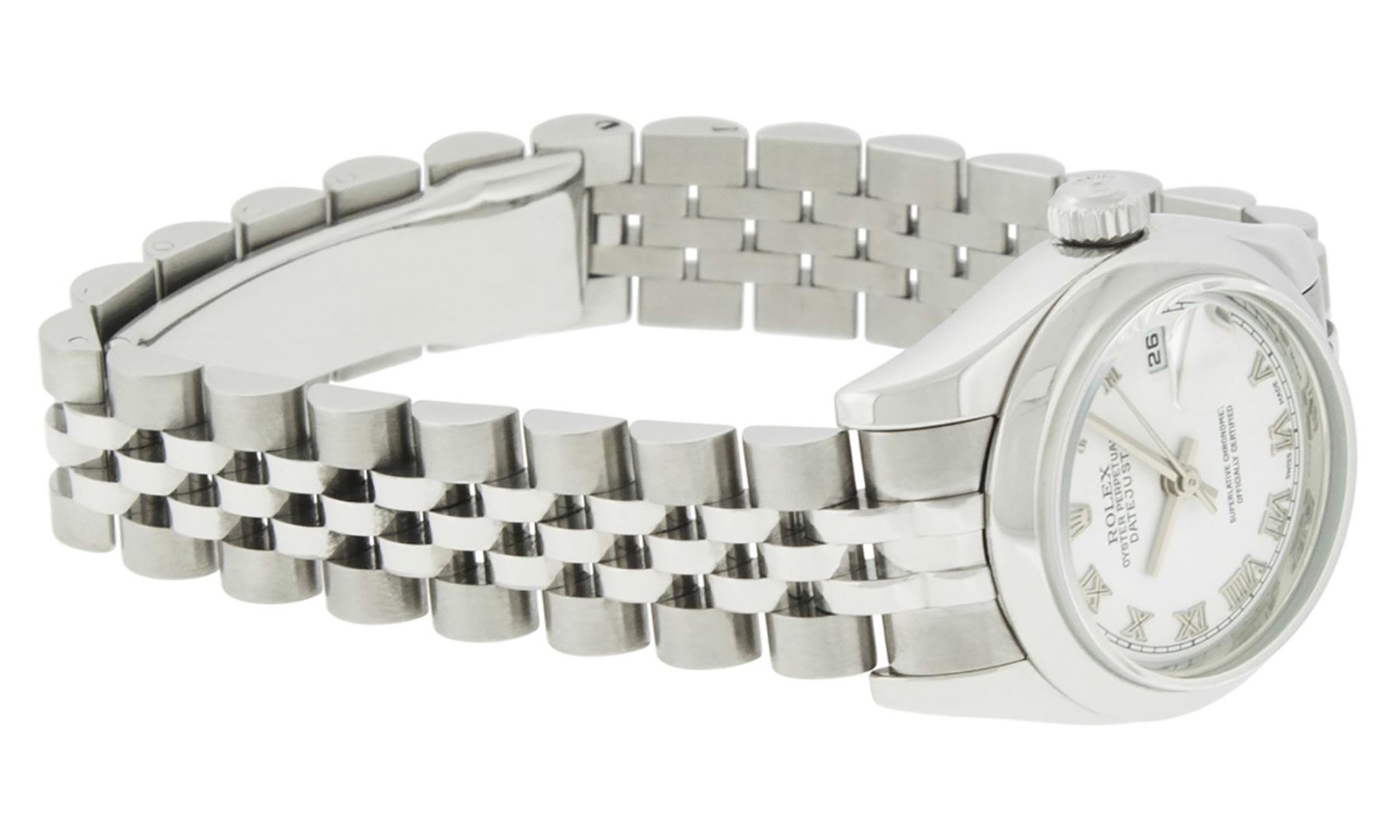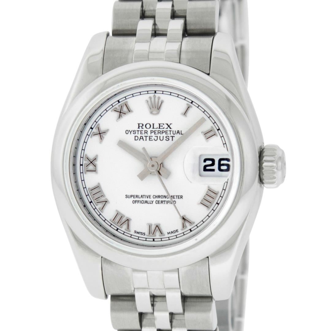 One New Style Ladies Pre Owned Quickset Stainless Steel Rolex Polished Bright with Satin Finish, Serviced & Electronically Tested, Rolex Stainless Steel Case: 26mm, Rolex Stainless Steel Crown, Rolex Bezel: Stainless Steel Smooth Bezel. Crystal: Sapphire With Magnified Date Window. Hands: Solid Hands. Rolex Movement: Automatic Winding Movement 2235. Rolex Dial: White Roman Dial With Square Track. Date Window: 3 O'Clock Position Date Display, Model: Quickset 179160. Condition: G-6 Extra Fine. Rolex Bracelet: Stainless Steel Jubilee Band. Bright Polish & Satin Finish. 6.0 Inch Length, Adjustable. Hidden Clasp, With Rolex Logo. This Watch Has Been Serviced Time Tested And Is In Excellent Condition It Is Free Of All Scratches And Dents.