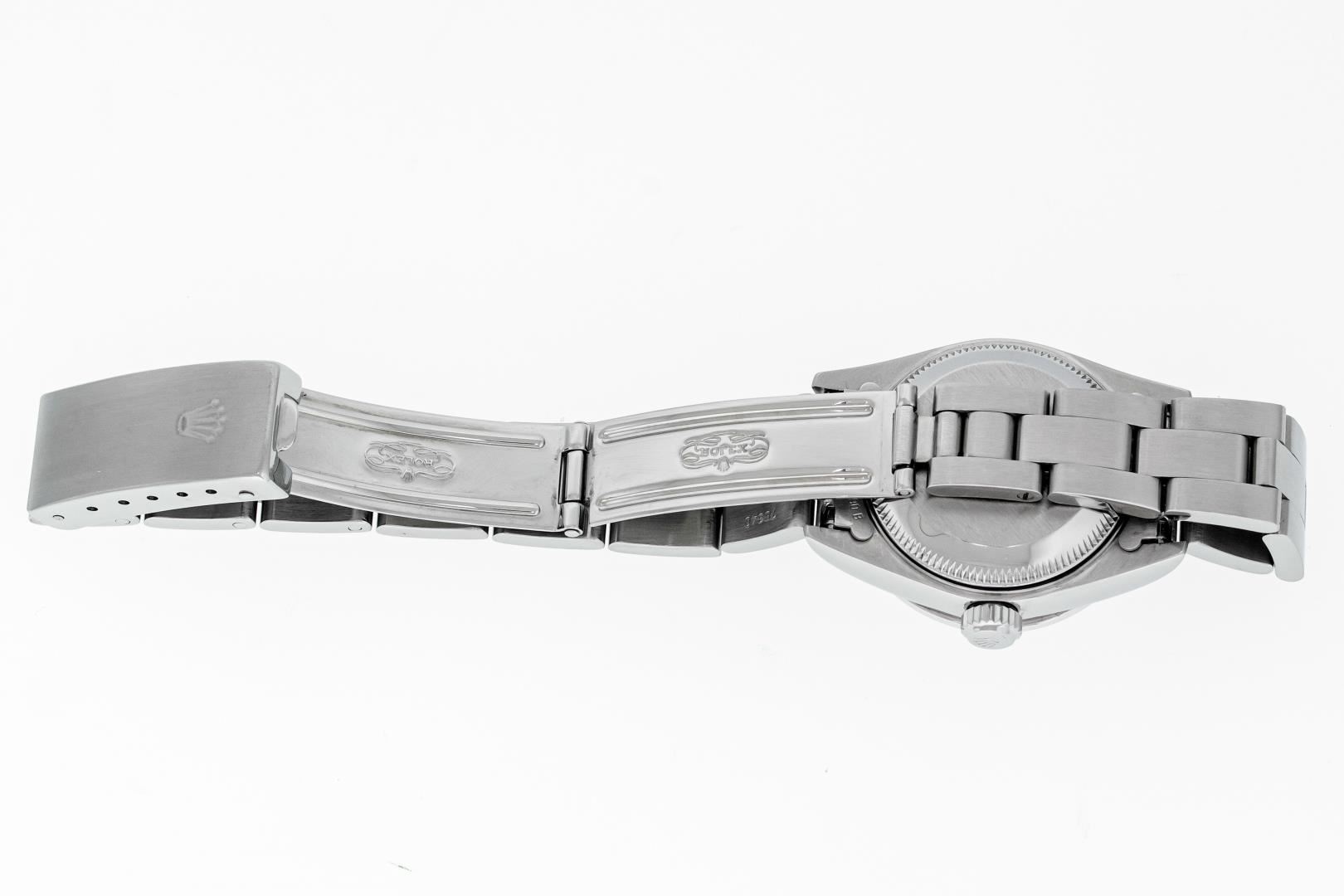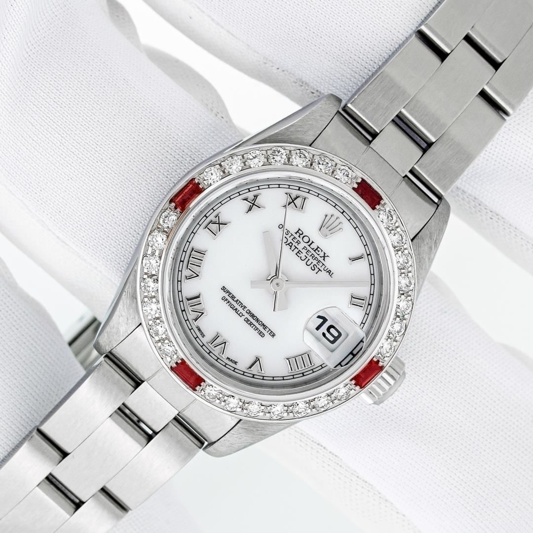 One Ladies Pre Owned Quickset Stainless Steel Rolex Datejust Polished Bright with Satin Finish, Serviced & Electronically Tested, Stainless Steel Case: 26mm, Rolex Stainless Steel Crown, Custom Bezel: New 18K White Gold Ruby Bead Set Diamond Bezel, Diamond + Gem Count: 28 Diamonds + 4 Rubies, Clarity: SI-VS, Color: G to H. Custom Crystal: New Sapphire With Magnified Date Window. Custom Hands: New Hands. Rolex Movement: Automatic Winding Movement 2235. Rolex Dial: White With Roman Hour Markers & Square Track. Date Window: 3 O'Clock Position Date Display, Model: Quickset Datejust. Condition: G-6 Extra Fine. Rolex Bracelet: Stainless Steel Oyster Band. Bright Polish & Satin Finish. 6.0 Inch Length, Adjustable. Standard Clasp, With Rolex Logo. This Watch Has Been Serviced Time Tested And Is In Excellent Condition It Is Free Of All Scratches And Dents.