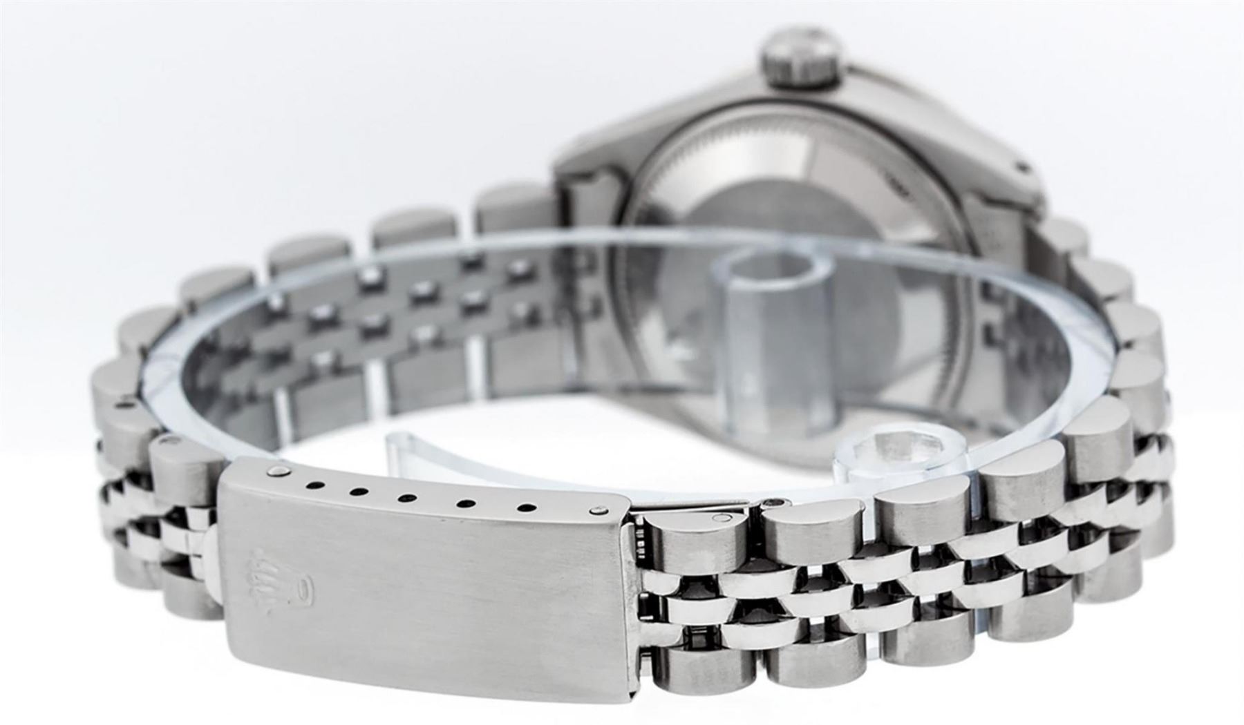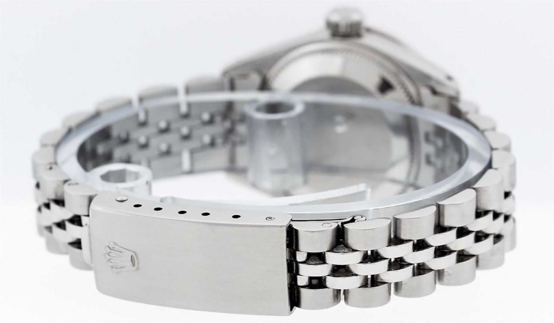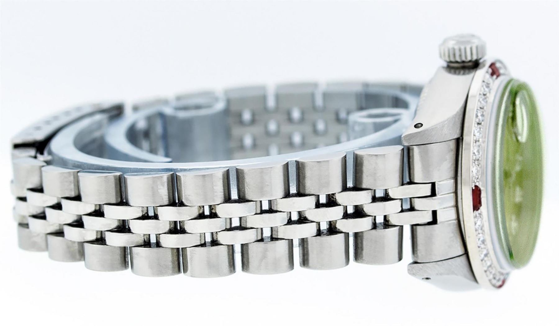 One Ladies Stainless Steel Rolex Datejust Polished Bright with Satin Finish, Serviced & Electronically Tested, Stainless Steel Case: 26mm, Stainless Steel Crown, Custom Bezel: New 18K White Gold Ruby Beadset Diamond Bezel, Diamond + Gem Count: 28 Diamonds + 4 Rubies. Total Weight .70 Carat, Clarity: SI-VS, Color: G to H. Custom Crystal: New Scratch Resistant Synthetic Sapphire Cyclops Lens. Custom Hands: New Luminescent Hands. Movement: Automatic Winding Movement. Custom Dial: Refinished Yellow With Diamond Hour Markers & Dash Tracks, 10 Diamonds in Dial, G To H In Color, Clarity: SI-VS. Date Window: 3 O'Clock Position Date Display, Model: Datejust. Condition: G-6 Extra Fine. Bracelet: Stainless Steel Jubilee Band. Bright Polish & Satin Finish. 6.0 Inch Length, Adjustable. Standard Clasp, With Rolex Logo. This Watch Has Been Serviced Time Tested And Is In Excellent Condition It Is Free Of All Scratches And Dents.