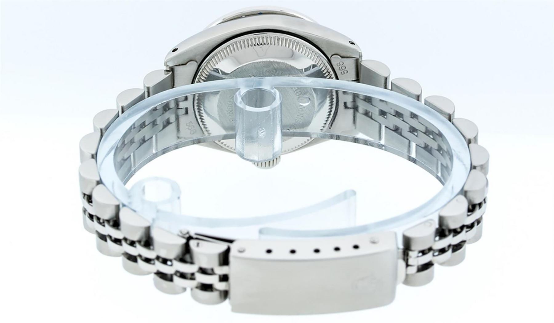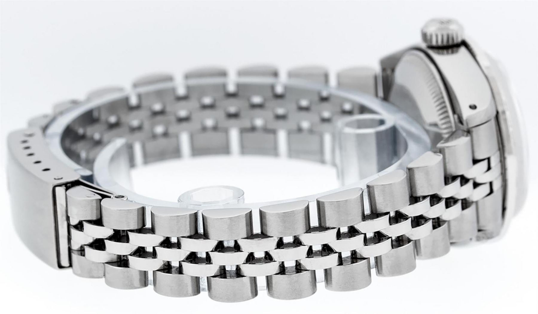 One Ladies Stainless Steel Rolex Datejust Polished Bright with Satin Finish, Serviced & Electronically Tested, Stainless Steel Case: 26mm, Stainless Steel Crown, Custom Bezel: New 18K White Gold Ruby Beadset Diamond Bezel, Diamond + Gem Count: 28 Diamonds + 4 Rubies. Total Weight .70 Carat, Clarity: SI-VS, Color: G to H. Custom Crystal: New Scratch Resistant Synthetic Sapphire Cyclops Lens. Custom Hands: New Luminescent Hands. Movement: Automatic Winding Movement. Custom Dial: Refinished Yellow With Diamond Hour Markers & Dash Tracks, 10 Diamonds in Dial, G To H In Color, Clarity: SI-VS. Date Window: 3 O'Clock Position Date Display, Model: Datejust. Condition: G-6 Extra Fine. Bracelet: Stainless Steel Jubilee Band. Bright Polish & Satin Finish. 6.0 Inch Length, Adjustable. Standard Clasp, With Rolex Logo. This Watch Has Been Serviced Time Tested And Is In Excellent Condition It Is Free Of All Scratches And Dents.
