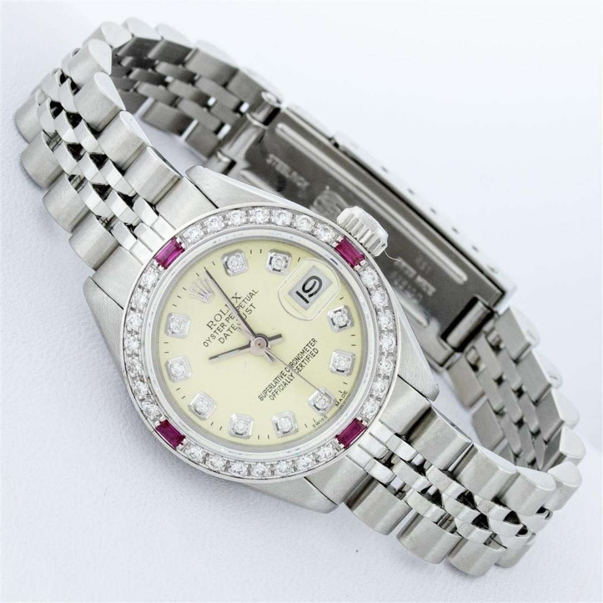 One Ladies Stainless Steel Rolex Datejust Polished Bright with Satin Finish, Serviced & Electronically Tested, Stainless Steel Case: 26mm, Stainless Steel Crown, Custom Bezel: New 18K White Gold Ruby Beadset Diamond Bezel, Diamond + Gem Count: 28 Diamonds + 4 Rubies. Total Weight .70 Carat, Clarity: SI-VS, Color: G to H. Custom Crystal: New Scratch Resistant Synthetic Sapphire Cyclops Lens. Custom Hands: New Luminescent Hands. Movement: Automatic Winding Movement. Custom Dial: Refinished Yellow With Diamond Hour Markers & Dash Tracks, 10 Diamonds in Dial, G To H In Color, Clarity: SI-VS. Date Window: 3 O'Clock Position Date Display, Model: Datejust. Condition: G-6 Extra Fine. Bracelet: Stainless Steel Jubilee Band. Bright Polish & Satin Finish. 6.0 Inch Length, Adjustable. Standard Clasp, With Rolex Logo. This Watch Has Been Serviced Time Tested And Is In Excellent Condition It Is Free Of All Scratches And Dents.