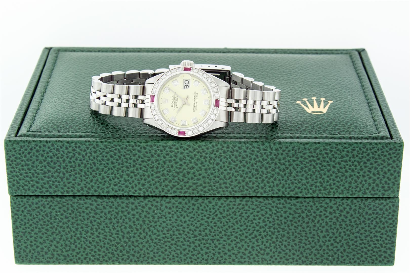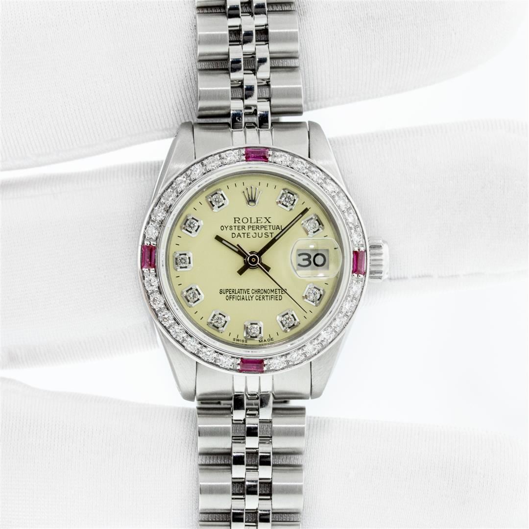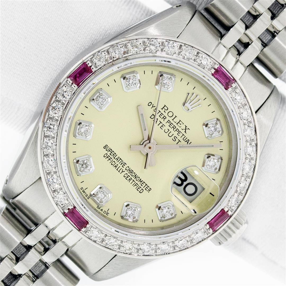 One Ladies Stainless Steel Rolex Datejust Polished Bright with Satin Finish, Serviced & Electronically Tested, Stainless Steel Case: 26mm, Stainless Steel Crown, Custom Bezel: New 18K White Gold Ruby Beadset Diamond Bezel, Diamond + Gem Count: 28 Diamonds + 4 Rubies. Total Weight .70 Carat, Clarity: SI-VS, Color: G to H. Custom Crystal: New Scratch Resistant Synthetic Sapphire Cyclops Lens. Custom Hands: New Luminescent Hands. Movement: Automatic Winding Movement. Custom Dial: Refinished Yellow With Diamond Hour Markers & Dash Tracks, 10 Diamonds in Dial, G To H In Color, Clarity: SI-VS. Date Window: 3 O'Clock Position Date Display, Model: Datejust. Condition: G-6 Extra Fine. Bracelet: Stainless Steel Jubilee Band. Bright Polish & Satin Finish. 6.0 Inch Length, Adjustable. Standard Clasp, With Rolex Logo. This Watch Has Been Serviced Time Tested And Is In Excellent Condition It Is Free Of All Scratches And Dents.