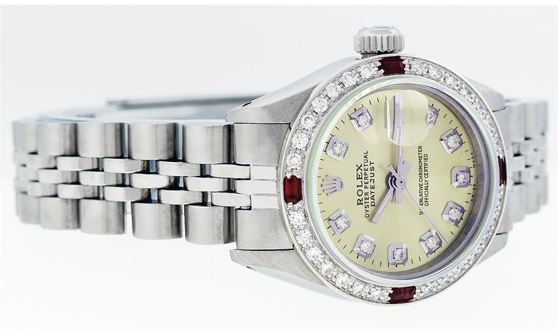 One Ladies Stainless Steel Rolex Datejust Polished Bright with Satin Finish, Serviced & Electronically Tested, Stainless Steel Case: 26mm, Stainless Steel Crown, Custom Bezel: New 18K White Gold Ruby Beadset Diamond Bezel, Diamond + Gem Count: 28 Diamonds + 4 Rubies. Total Weight .70 Carat, Clarity: SI-VS, Color: G to H. Custom Crystal: New Scratch Resistant Synthetic Sapphire Cyclops Lens. Custom Hands: New Luminescent Hands. Movement: Automatic Winding Movement Caliber 2030. Custom Dial: Refinished Yellow With Diamond Hour Markers & Dash Tracks, 10 Diamonds in Dial, G To H In Color, Clarity: SI-VS. Date Window: 3 O'Clock Position Date Display, Model: Datejust. Condition: G-6 Extra Fine. Bracelet: Stainless Steel Jubilee Band. Bright Polish & Satin Finish. 6.0 Inch Length, Adjustable. Standard Clasp, With Rolex Logo. This Watch Has Been Serviced Time Tested And Is In Excellent Condition It Is Free Of All Scratches And Dents.